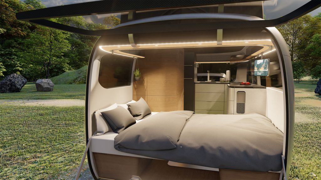 À première vue, cette caravane ressemble à une version modernisée du design classique d’Airstream grâce à ses angles arrondis et à sa peau en aluminium incurvée, mais elle comporte un certain nombre d’innovations.