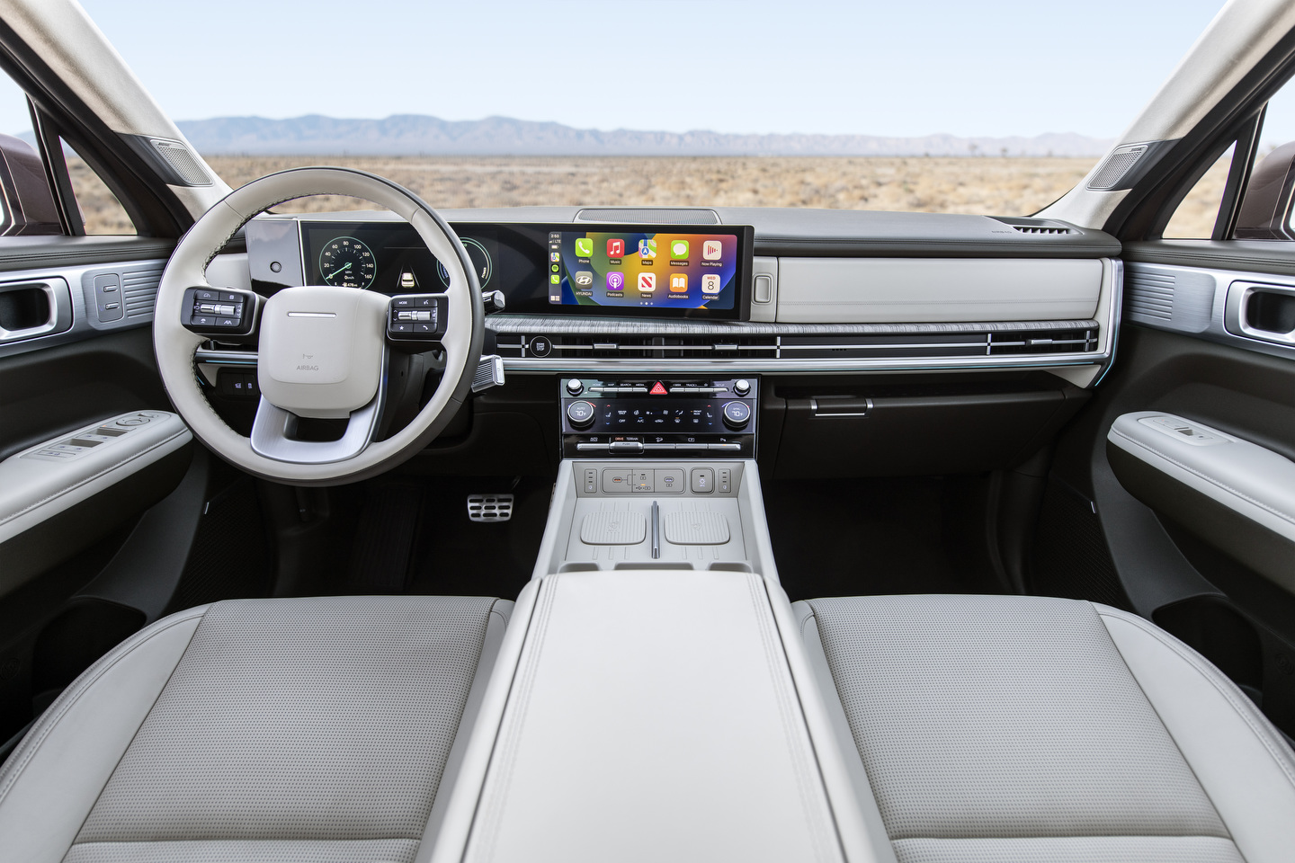 À l’intérieur, le Santa Fe offre un mélange harmonieux d’éléments de design horizontaux et verticaux, faisant écho au langage de design de l’extérieur. L’intérieur est marqué par un motif en forme de H sur le tableau de bord supérieur et les bouches d’aération, ce qui renforce la sensation d’espace. Parmi ses caractéristiques intérieures notables, on trouve un compartiment de stérilisation UV-C et un double système de recharge sans fil pour les téléphones intelligents. La pièce maîtresse est l’écran panoramique incurvé, qui intègre un groupe de jauges numériques de 12,3 pouces et un système d’infodivertissement, ajoutant à l’ambiance haut de gamme du véhicule.