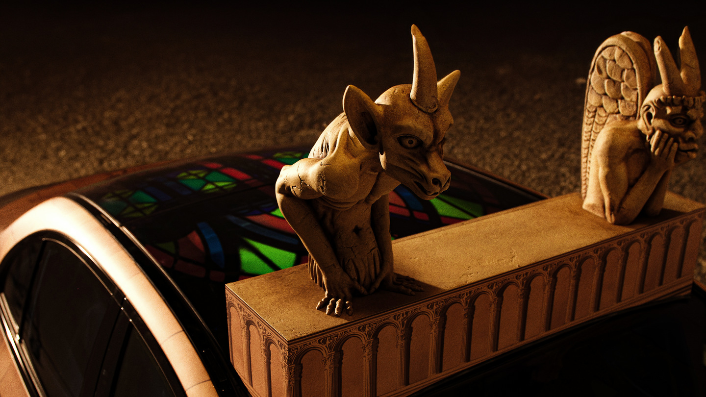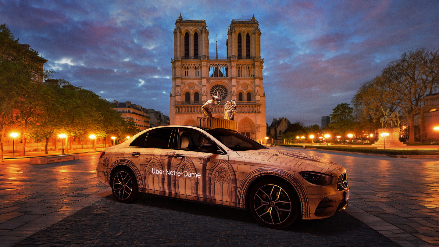 Un véhicule Uber avec un design sur mesure, inspiré de l’architecture de la cathédrale Notre-Dame, avec des gargouilles décoratives sur le toit et des reproductions de vitraux, stationné devant la Place du Louvre à Paris, en décembre 2024 | Photo: Uber