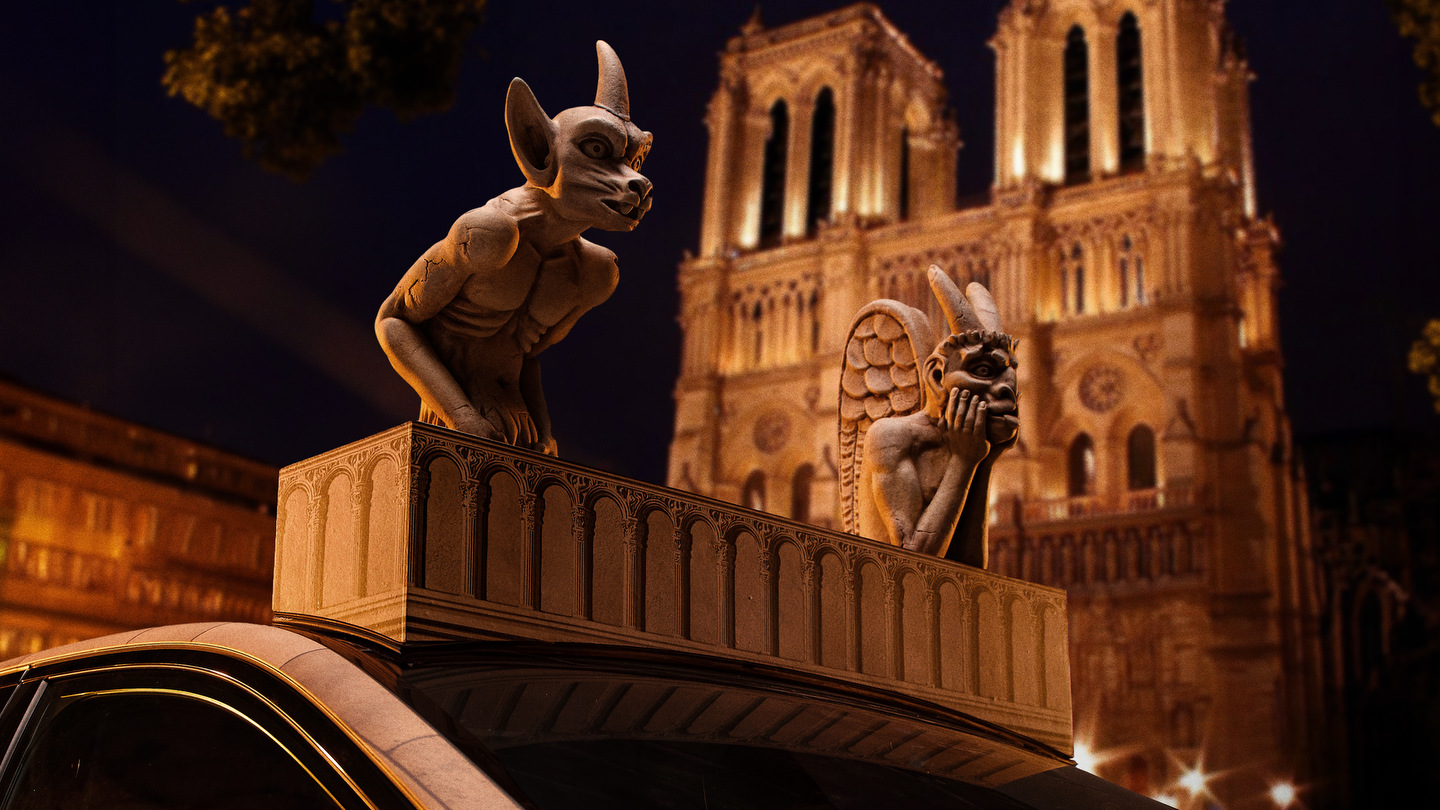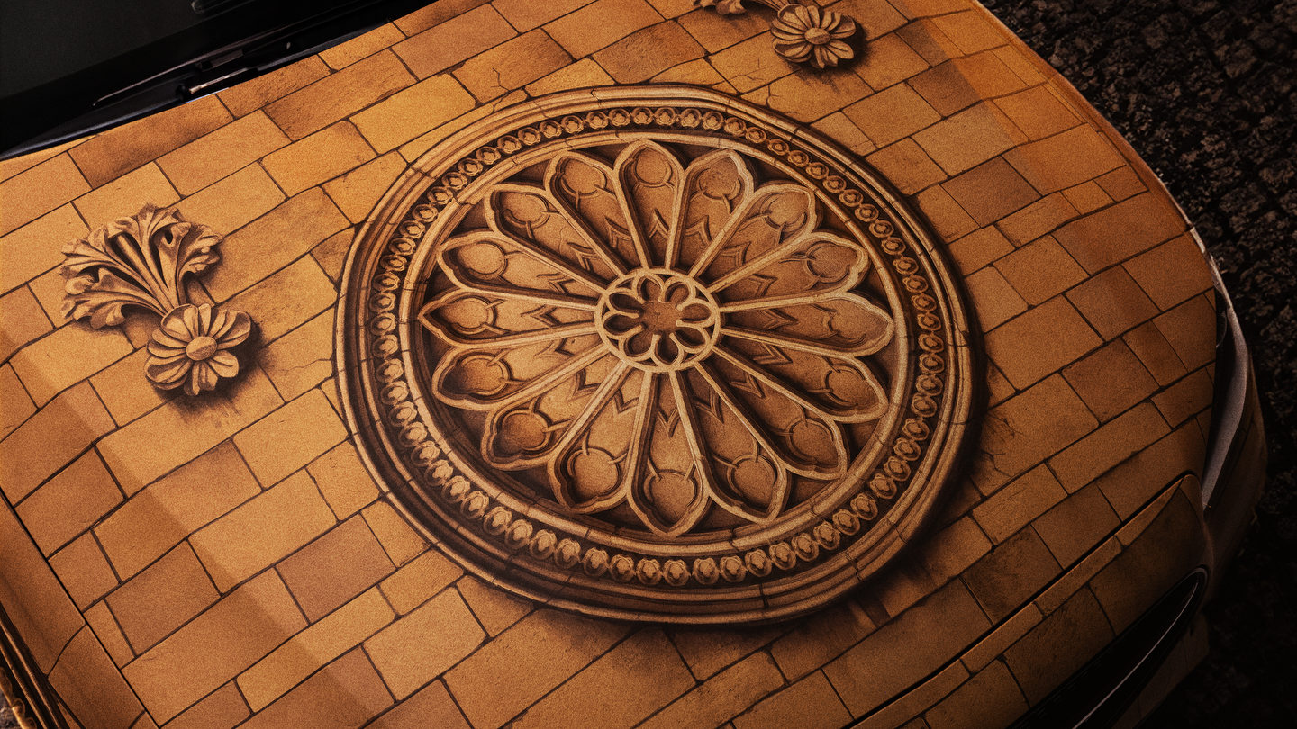 Le véhicule spécialement conçu pour l’occasion, une Mercedes-Benz modifiée, s’inspire de l’architecture gothique de la cathédrale. Il arbore des détails uniques, comme des extérieurs évoquant la pierre sculptée, des gargouilles décoratives, un toit panoramique illustrant les célèbres vitraux restaurés, ainsi qu’un motif de la rosace sud visible sur le capot et les portières. Cette personnalisation exceptionnelle transforme chaque trajet en une immersion visuelle et culturelle.