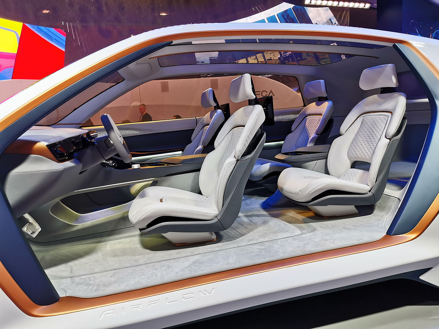 Si l’extérieur du multisegment demeure encore assez flou avec ces passages de roues enveloppés et l’absence de portières, l’habitacle, de son côté, est plus clair avec cette planche de bord riche en écrans – il y en a six (!) – et ce volant aplati. Quant à ces quatre sièges baquets, ils montrent la vocation « première classe » du multisegment. Ah oui, et les passagers de la deuxième rangée ont également droit à deux écrans supplémentaires pour se divertir en roulant.