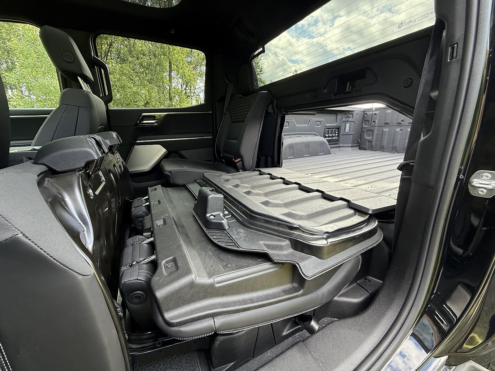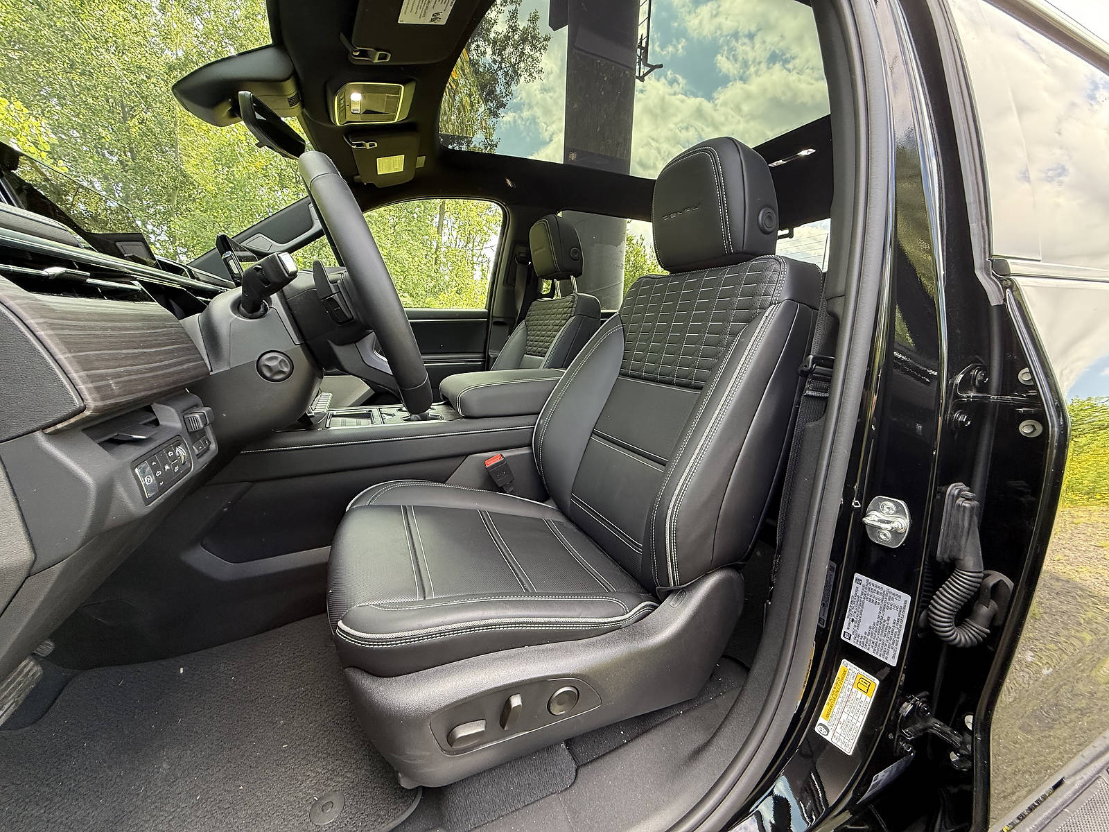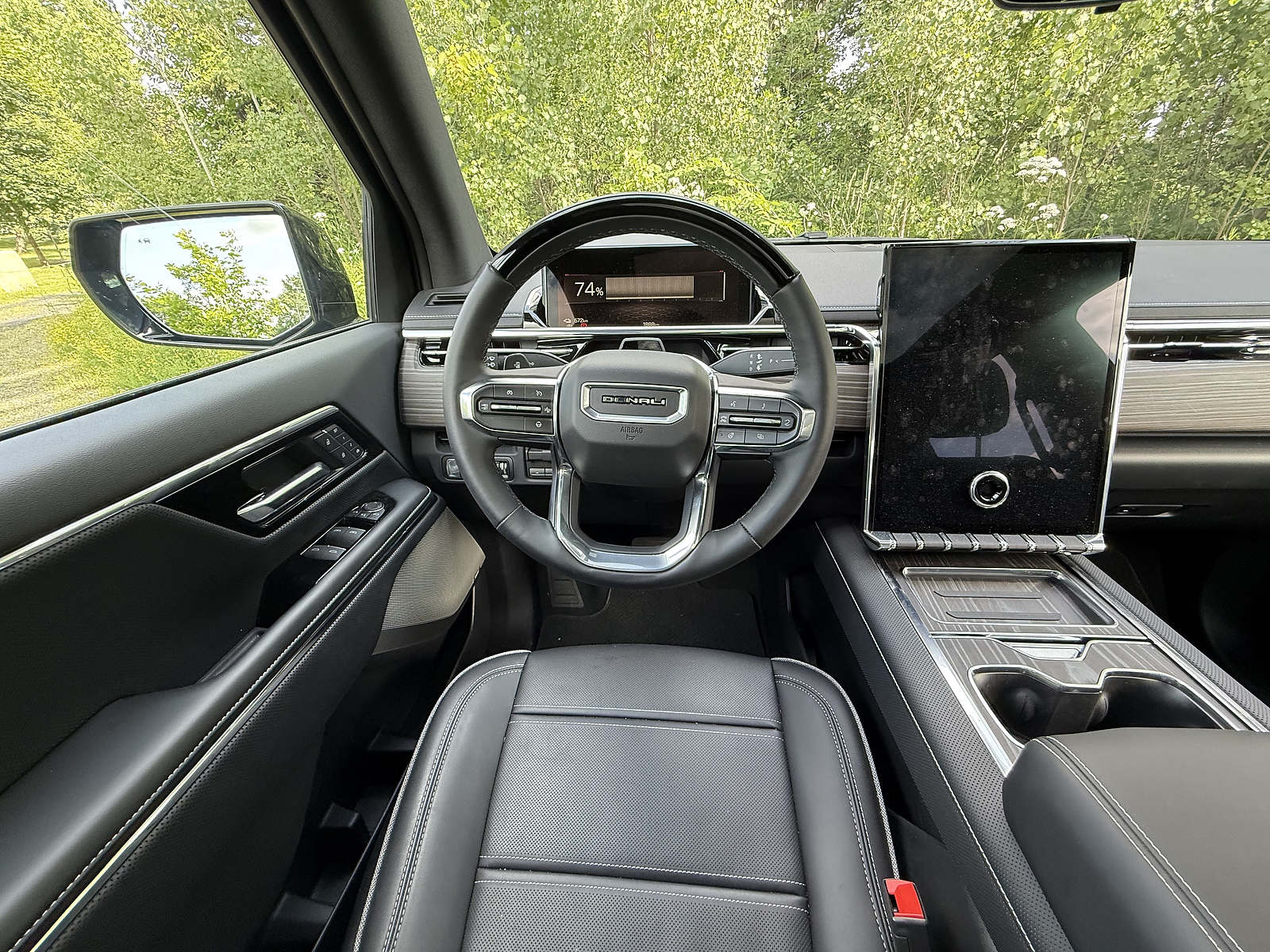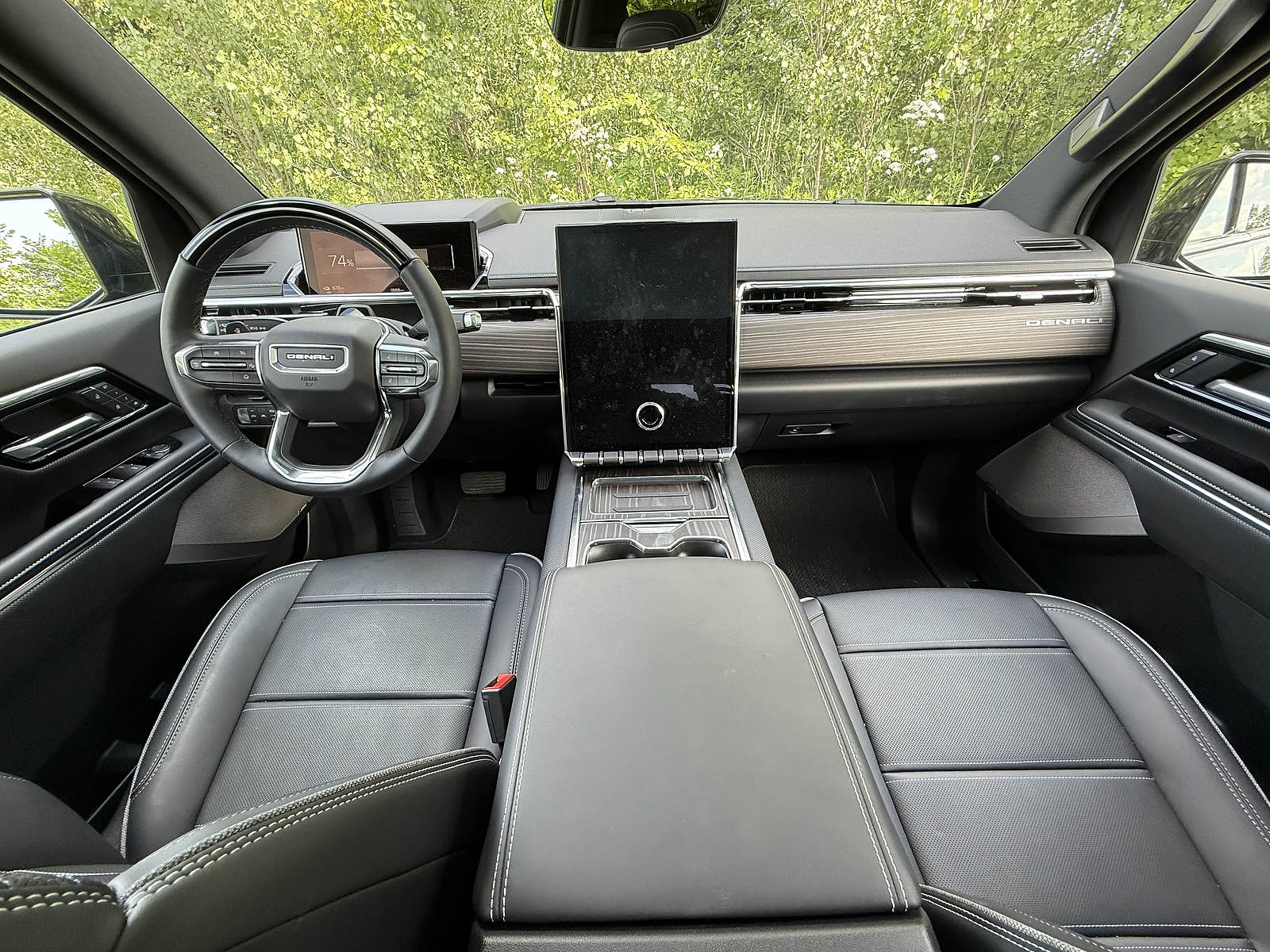Le prix, lui, fait réfléchir. Le Denali Extended Range dépasse les 115 000 $ au Canada, et la version Max approche les 120 000 $. Vous en avez beaucoup pour votre argent : suspension pneumatique aux quatre coins, roues de 24 pouces (aïe, votre portefeuille va souffrir au moment de les remplacer), quatre roues directrices, Super Cruise, écran central de 16,8 pouces, tableau de bord numérique de 11 pouces, affichage tête haute géant, système audio Bose haut de gamme, et un immense toit fixe en verre – parfait pour observer les étoiles, moins si vous détestez le soleil sur la tête.