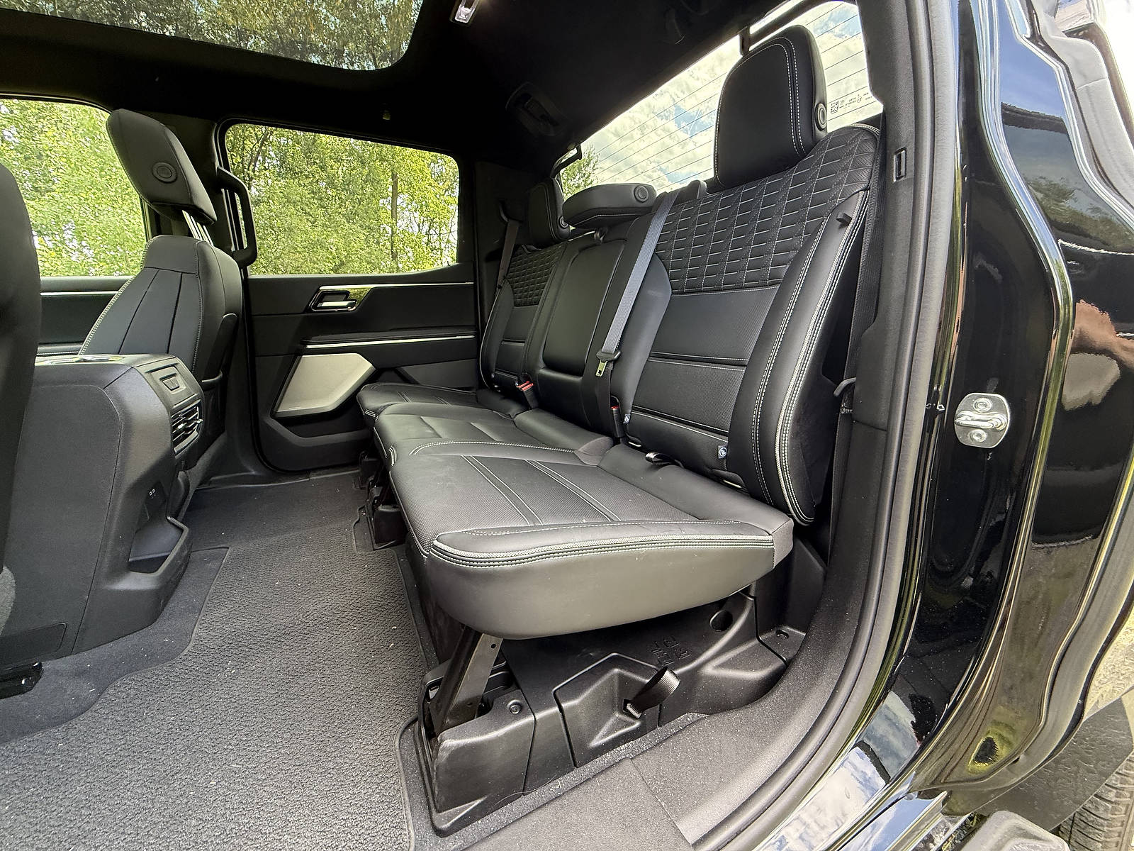 L’intérieur rappelle le Silverado EV, avec des clins d’œil comme les coordonnées GPS gravées dans les garnitures. Les sièges sont énormes, bien moulés et réglables électriquement dans tous les sens. La banquette arrière ? C’est le luxe d’une limousine, avec assez d’espace pour que mes enfants puissent y courir. Et le frunk (coffre avant) est immense : parfait pour vos outils ou pour cacher l’épicerie des pieds sales des enfants.