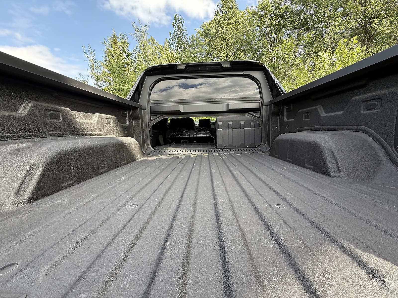 Il y a aussi le fameux midgate, la partition qui s’ouvre entre l’habitacle et la boite. Abaissez-le, retirez la vitre et vous rallongez votre plateau à presque 11 pieds. J’y ai mis du matériel un peu trop long… mais ça restera entre nous. Peu importe, c’est franchement pratique pour transporter du bois ou simplement frimer.