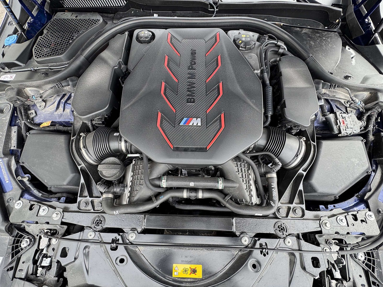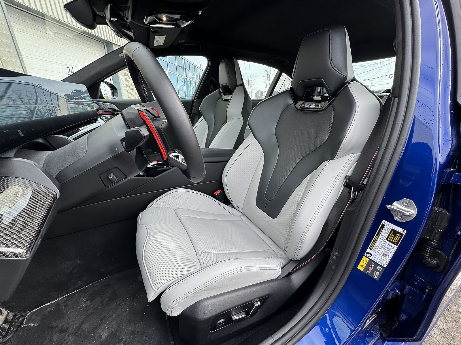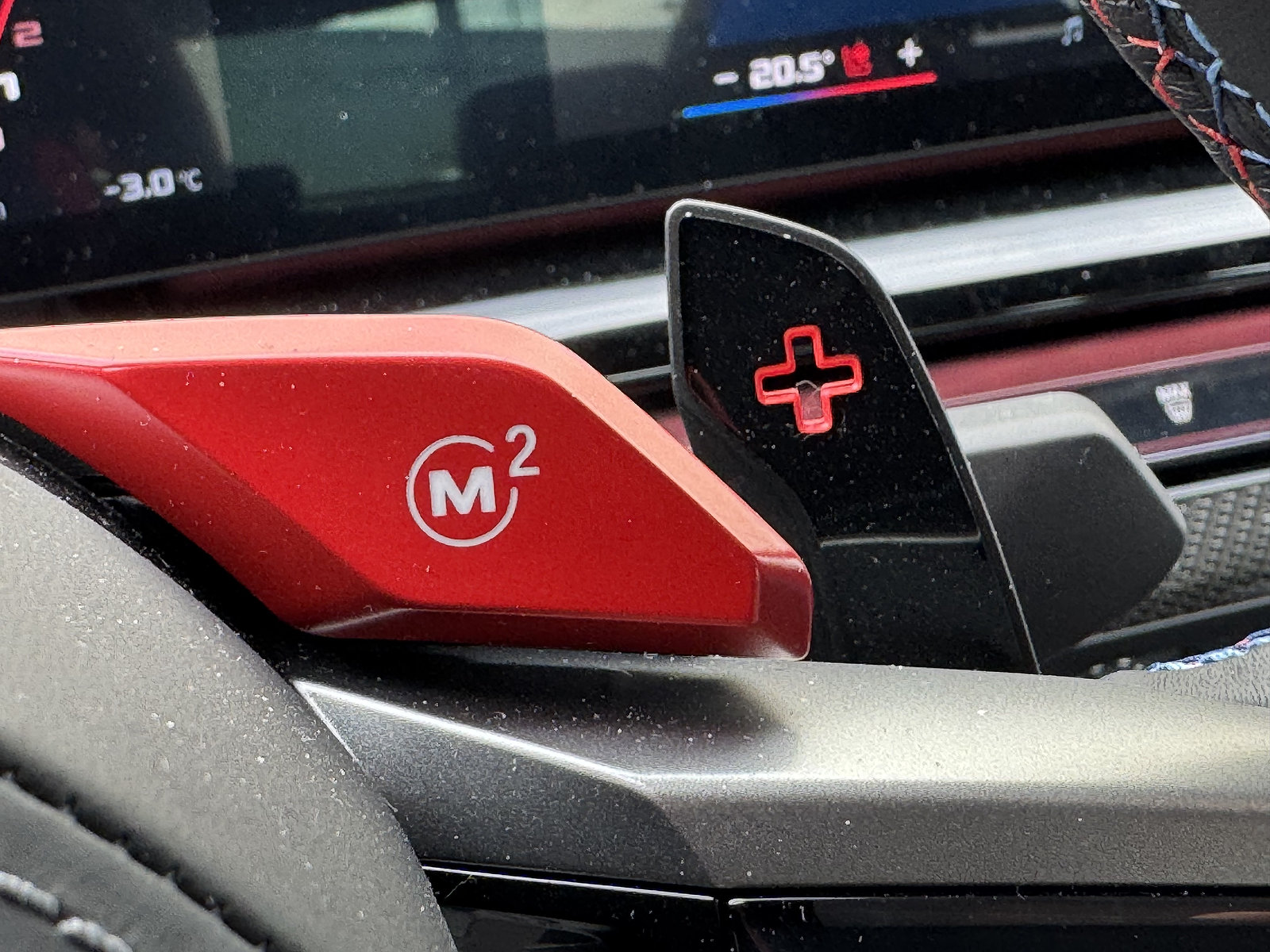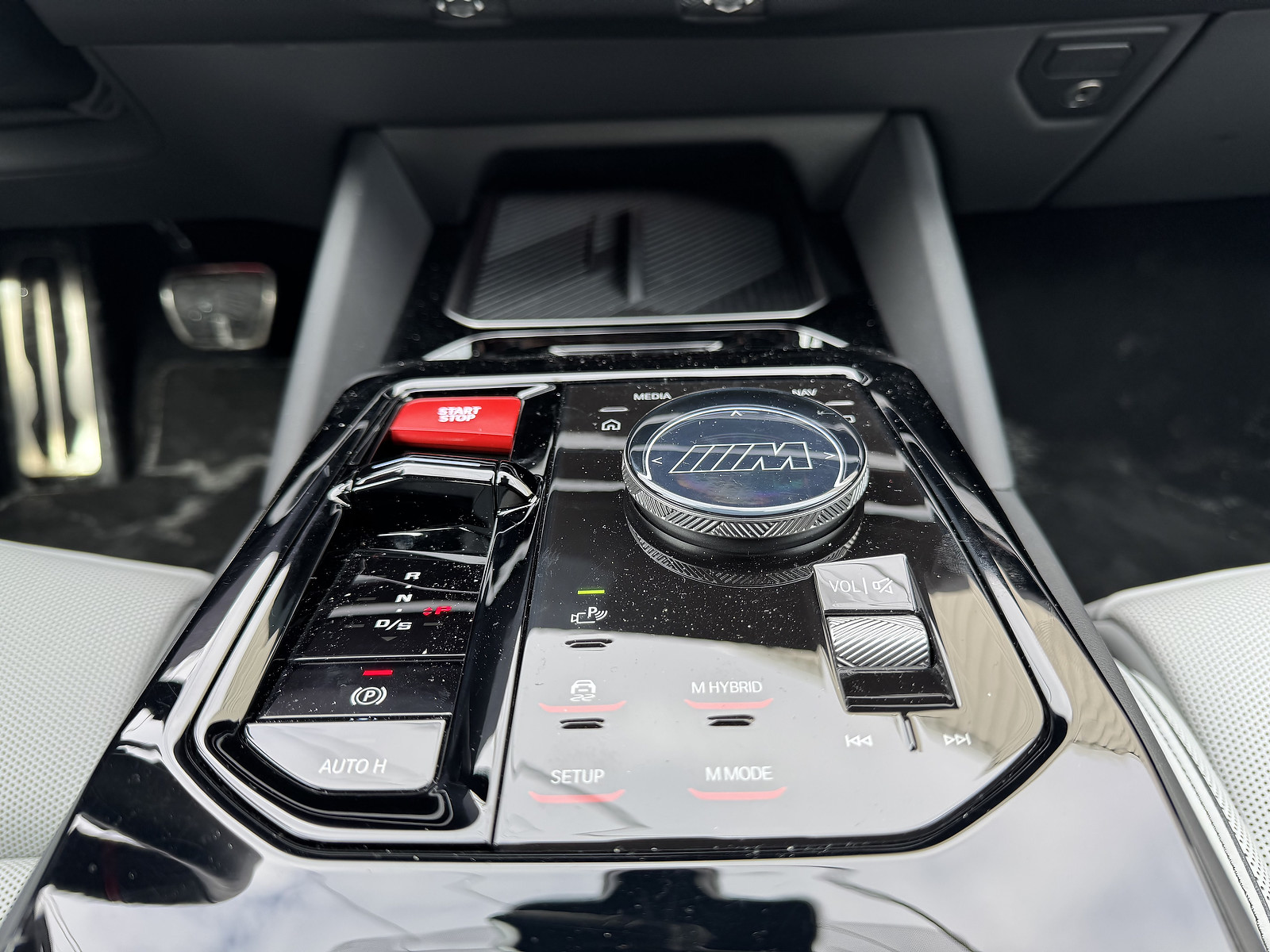 La technologie n’est pas en reste. Des tonnes de modes de conduite, une batterie de 14,8 kWh qui permet de parcourir jusqu’à 47 km en mode électrique (si cela vous intéresse), et un habitacle équipé de tout ce qu’il y a de plus haut de gamme — cuir Marino, système audio Bowers & Wilkins, garniture de toit en Alcantara, éclairage configurable — c’est presque trop, mais nous lui pardonnons. Le cockpit numérique de cette voiture est sans faille, et si le sélecteur de vitesses est décevant, le volant M, les palettes M et les sièges M ultraconfortables et soutenants compensent largement ce manque.