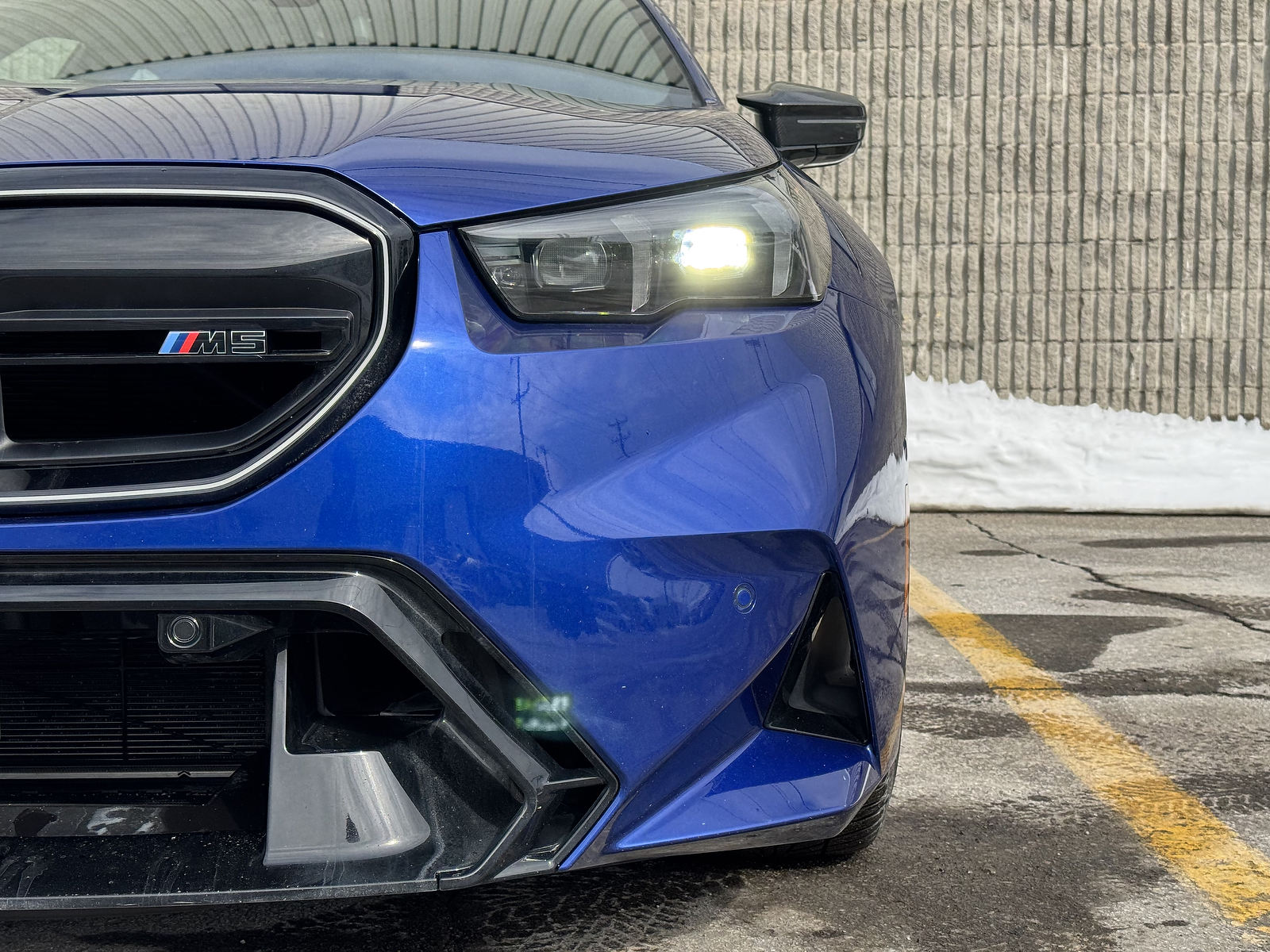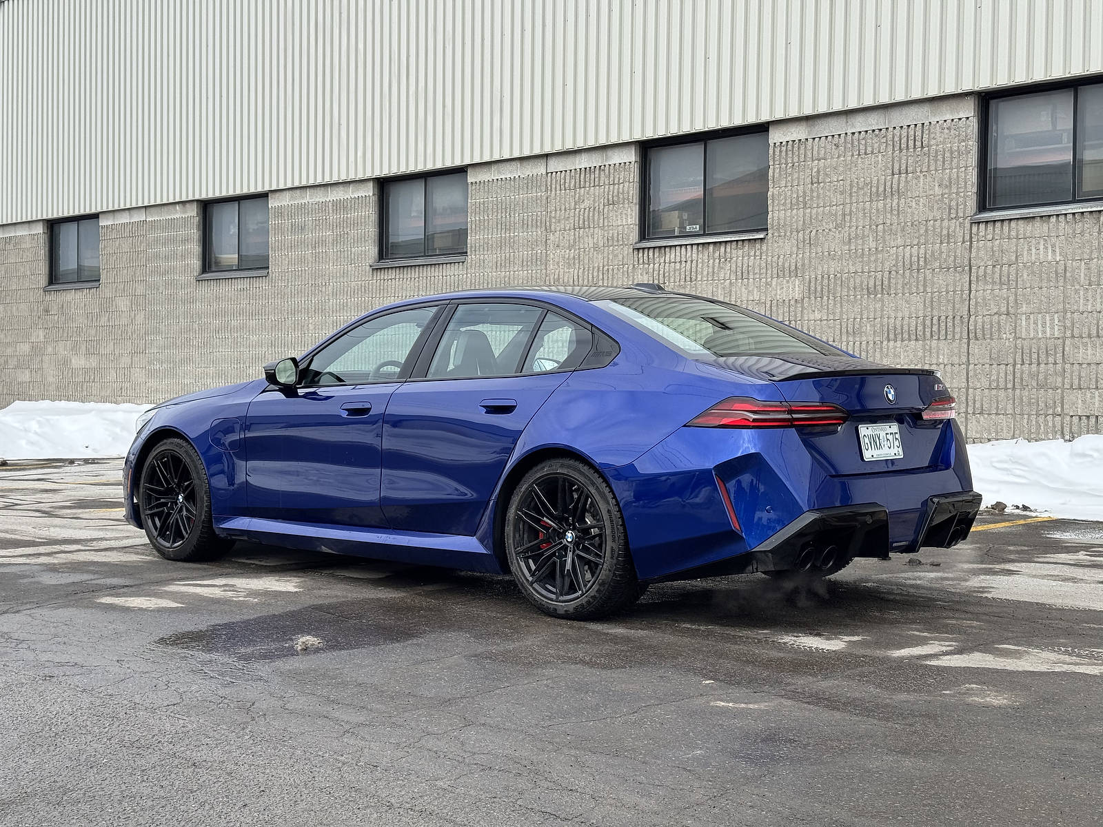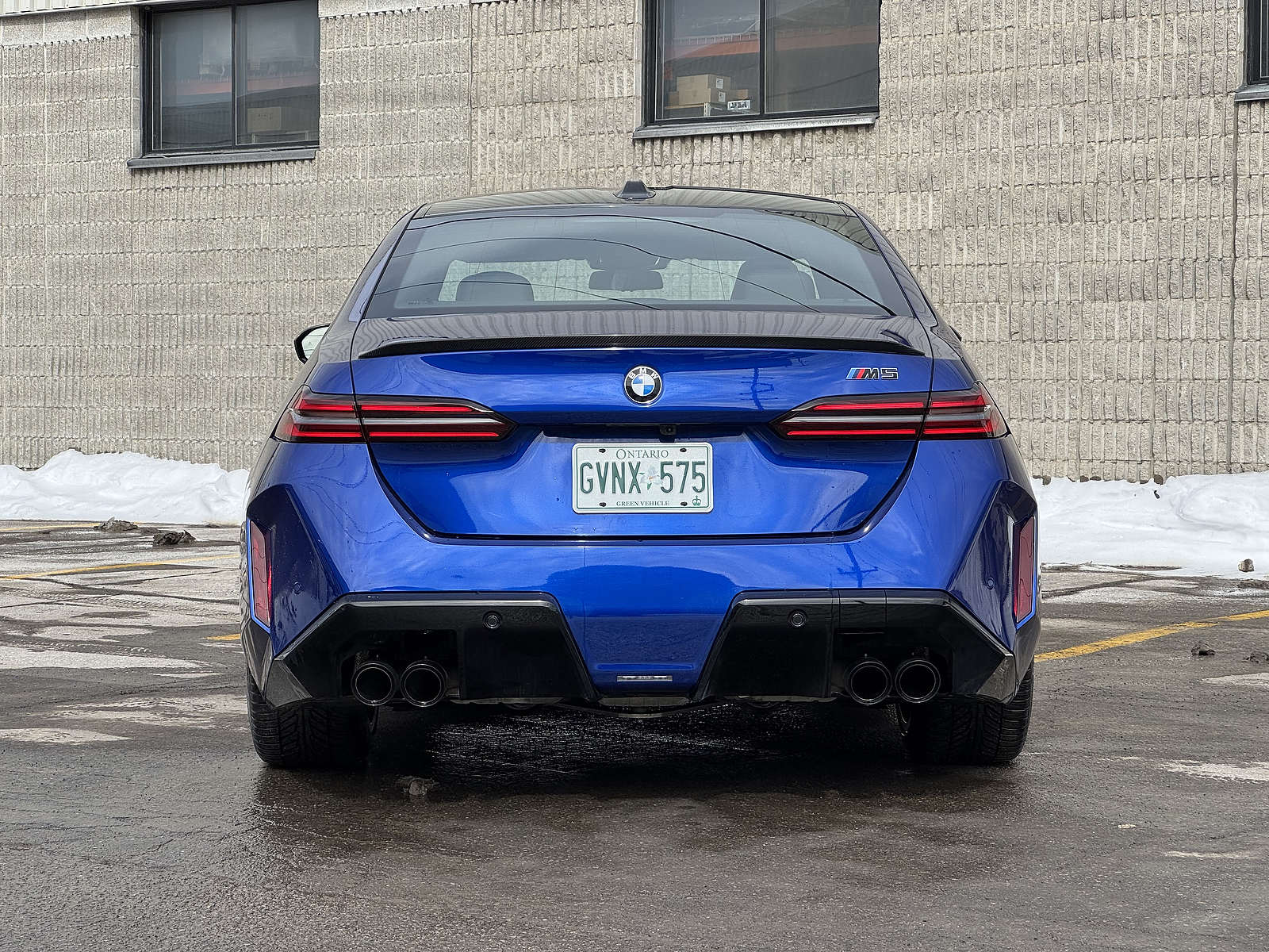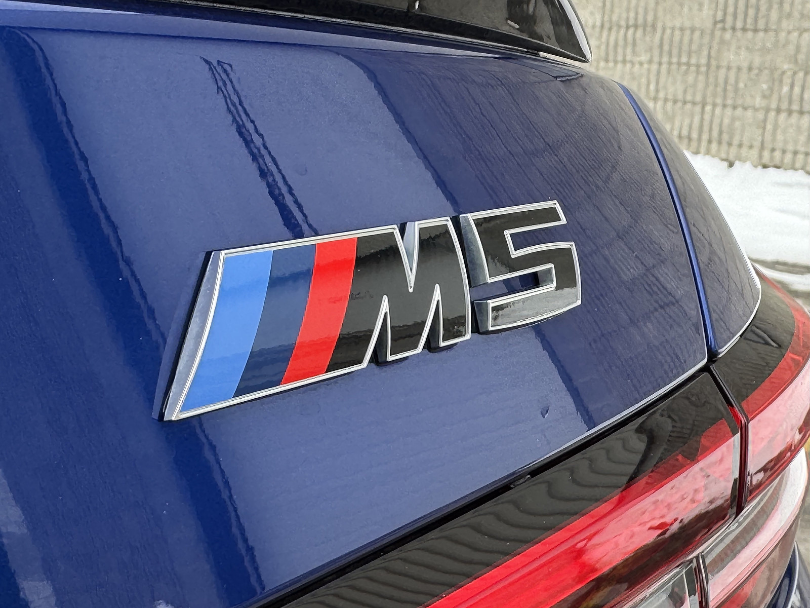 L’extérieur ? Disons qu’elle est menaçante dans le meilleur sens du terme. Plus large de 75 mm à l’avant et de 38 mm à l’arrière qu’une Série 5 standard, elle a l’air grosse, méchante et prête à bondir — surtout en Marina Bay Blue. Même avec les jantes d’hiver (qui réduisent un peu l’allure), elle a toujours l’air d’être dans le coup. Les quatre embouts d’échappement sont massifs, la calandre fonctionne (je me suis calmé, c’est bon), et il n’y a qu’un subtil badge M5 sur le coffre et la calandre. Classe. Discrète. Très cool.