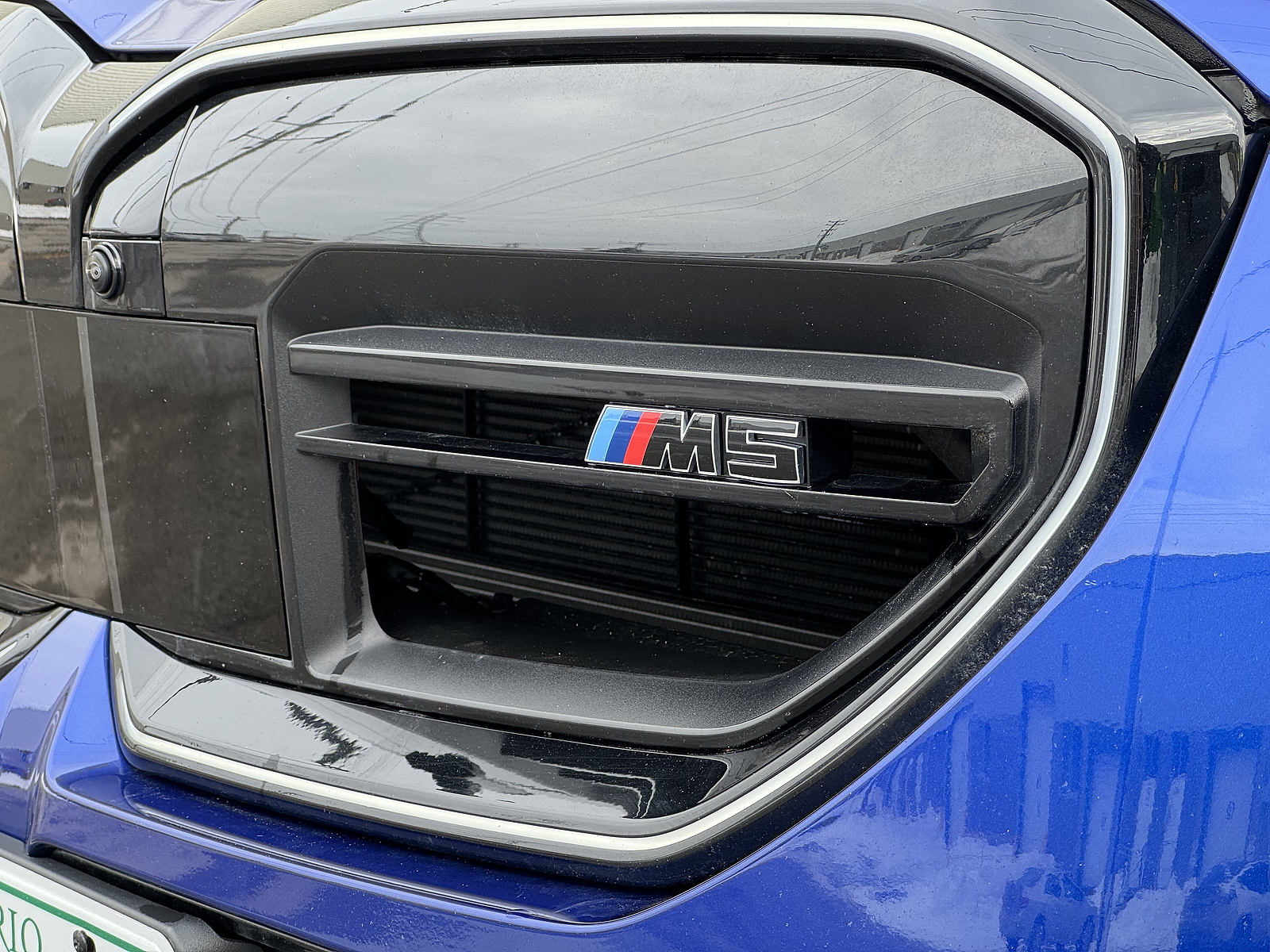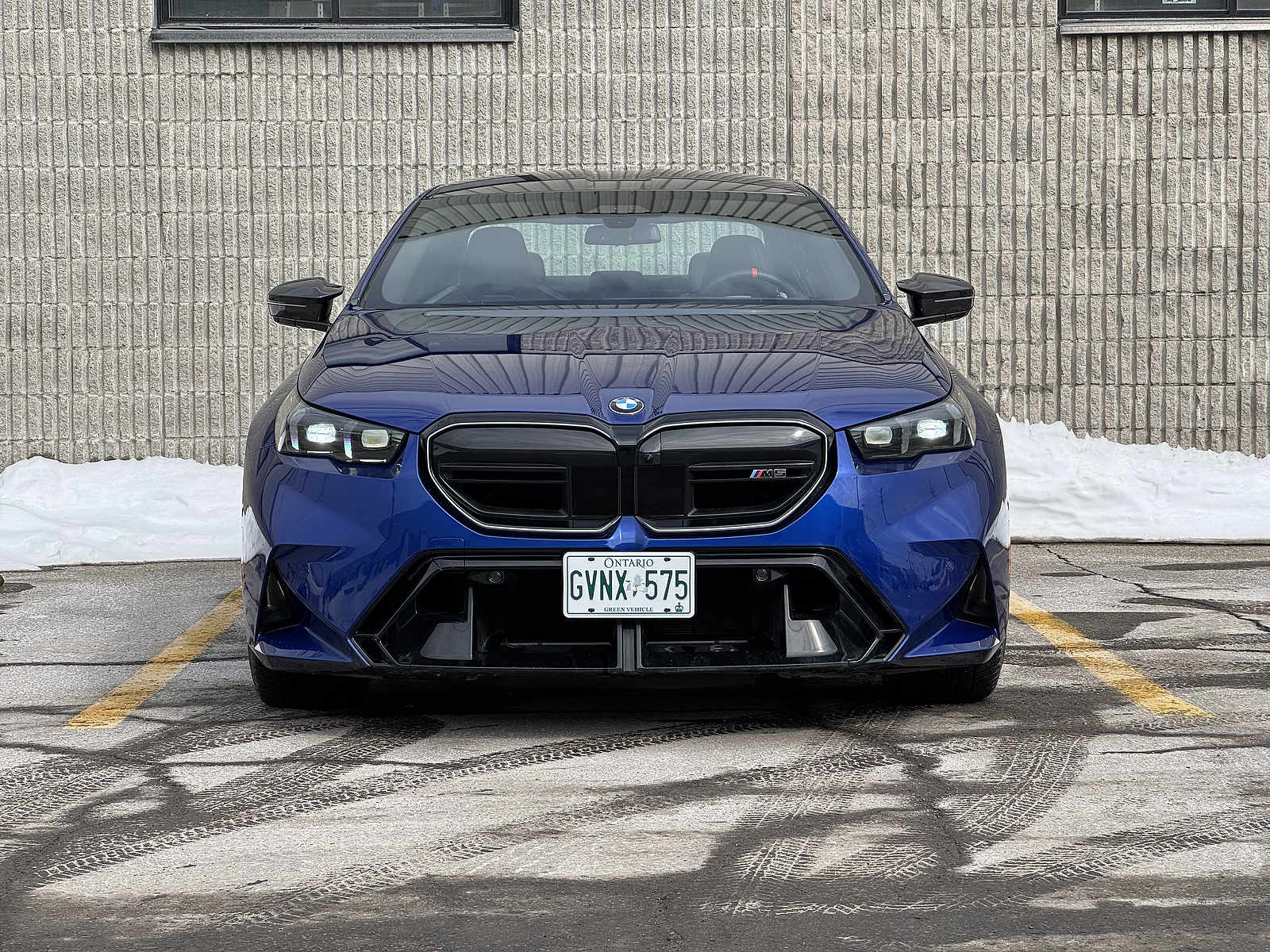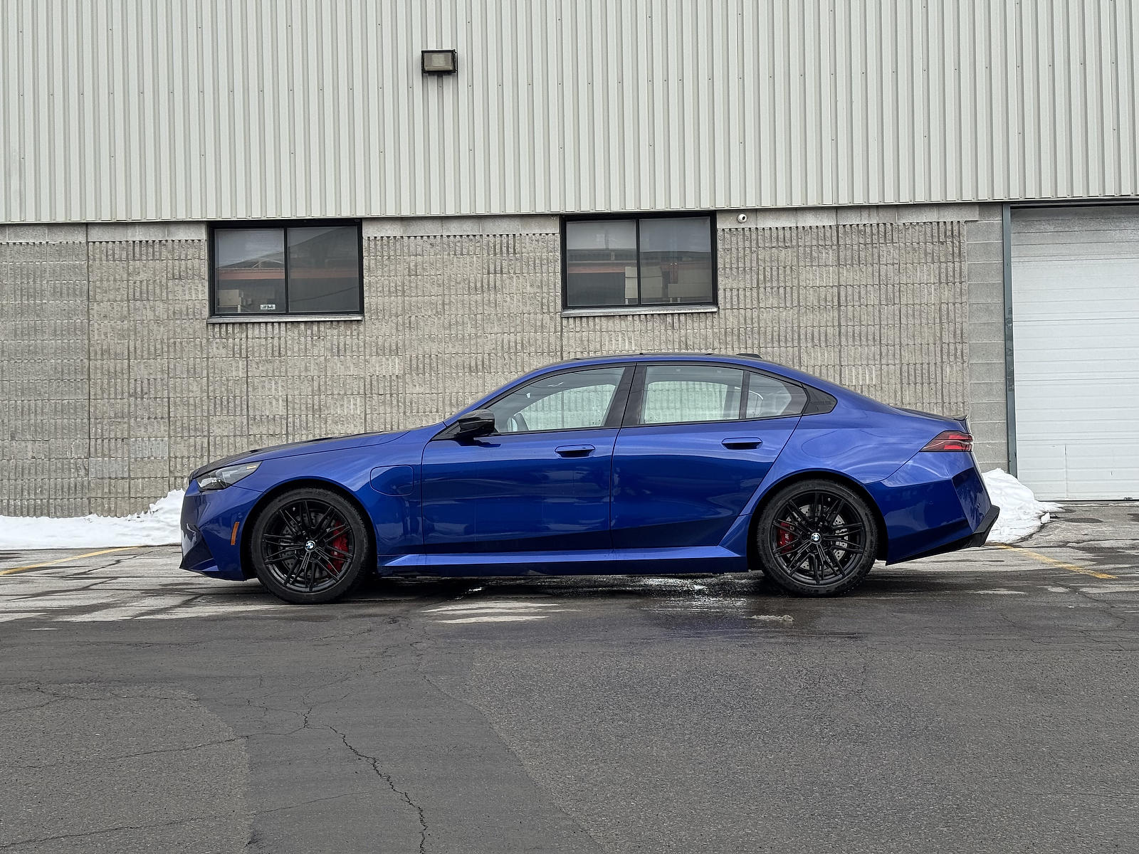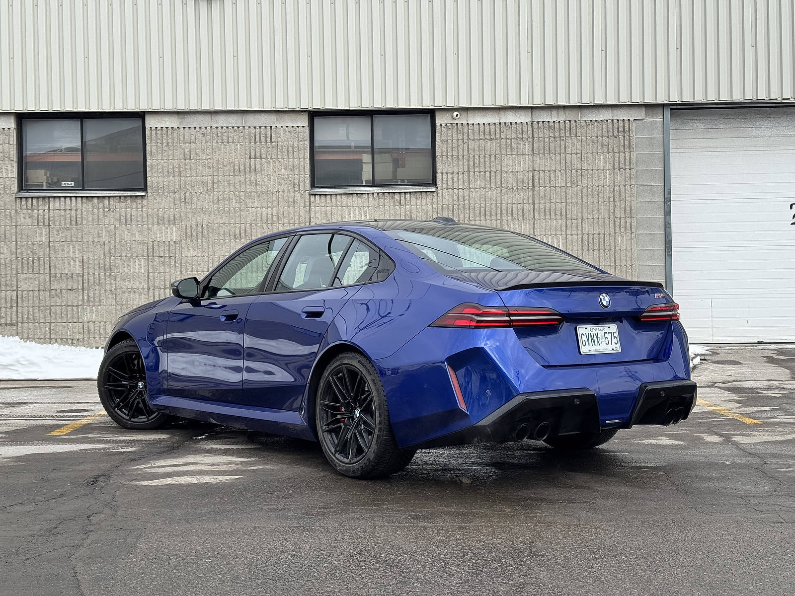 L’extérieur ? Disons qu’elle est menaçante dans le meilleur sens du terme. Plus large de 75 mm à l’avant et de 38 mm à l’arrière qu’une Série 5 standard, elle a l’air grosse, méchante et prête à bondir — surtout en Marina Bay Blue. Même avec les jantes d’hiver (qui réduisent un peu l’allure), elle a toujours l’air d’être dans le coup. Les quatre embouts d’échappement sont massifs, la calandre fonctionne (je me suis calmé, c’est bon), et il n’y a qu’un subtil badge M5 sur le coffre et la calandre. Classe. Discrète. Très cool.