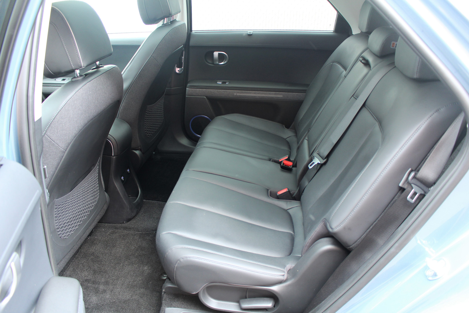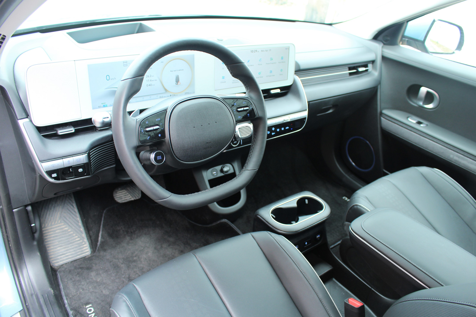 La carrosserie de ce multisegment est résolument futuriste, mais à la fois rétro avec son rappel du design de l’ère numérique des années 70 et 80. On aime moins les poignées de porte escamotables, difficiles à manipuler et glissantes. Quant à l’habitacle, il présente un style moderne et épuré. Comme le veut la tendance actuelle, on retrouve un large panneau abritant l’instrumentation du conducteur et le système multimédia, surligné de minces bouches d’aération et d’une planche simpliste avec peu de commandes physiques. Pas de logo Hyundai sur le volant, mais quatre picots comme si l’on n’avait pas encore décidé ce qu’on allait y apposer.