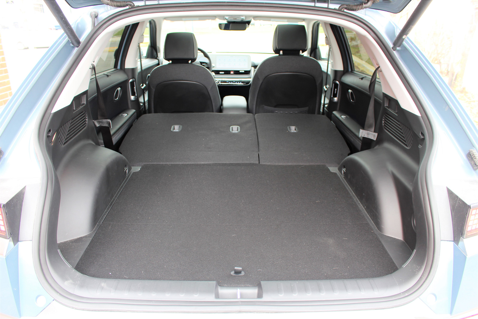 La banquette arrière est très accommodante, encore une fois grâce au plancher plat, mais le dégagement pour la tête est limité. Quant à l’aire de chargement, avec un volume de 770 litres avec les dossiers relevés et 1 680 litres avec les sièges rabattus, il est plus ou moins équivalent à celui du Mustang Mach-E, plus grand que ceux du Polestar 2 et de l’EV6, plus petit que celui de l’ID.4.
