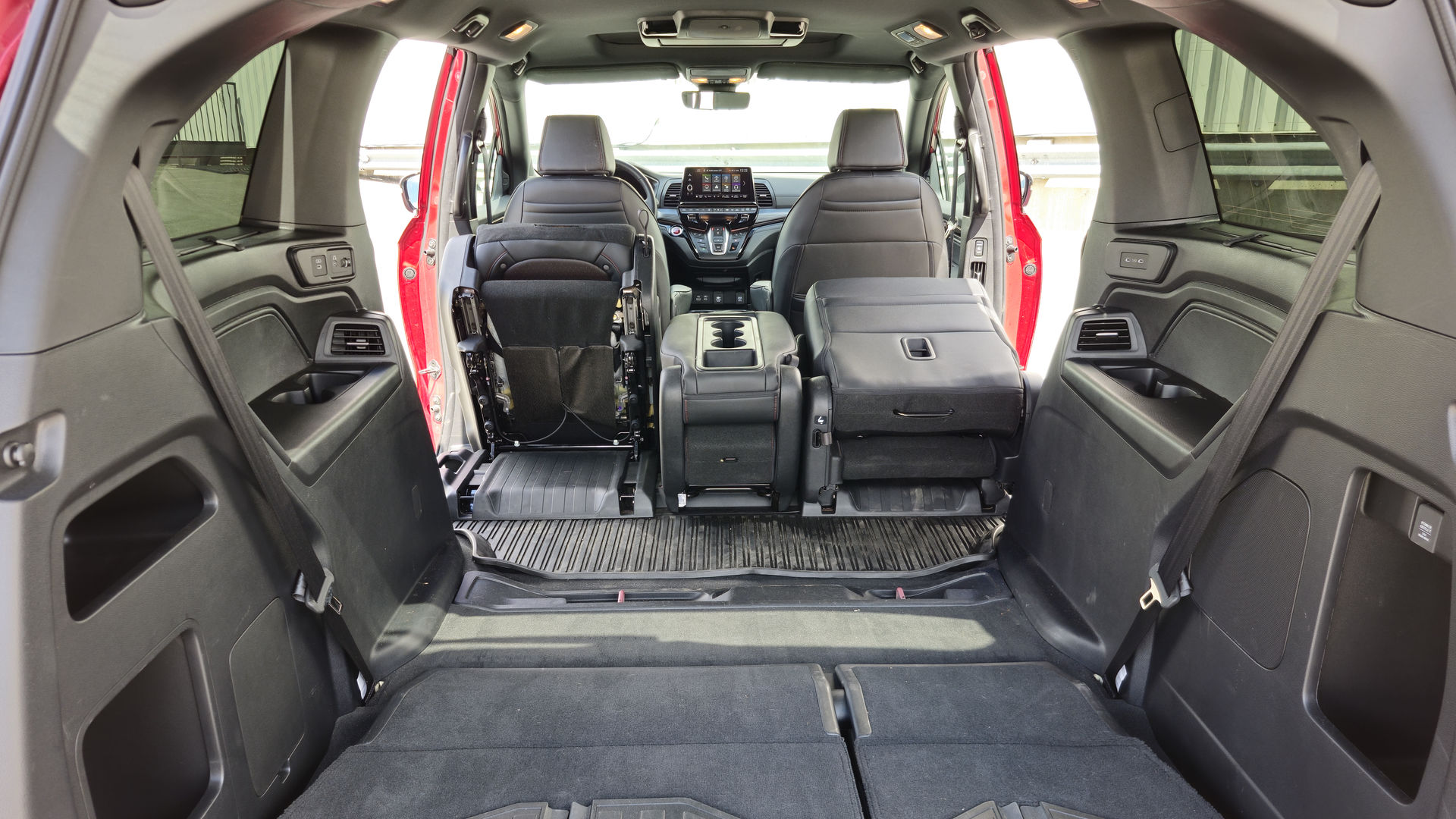 Il faut toutefois noter que la Honda Odyssey n’est pas le choix idéal pour les conducteurs qui doivent souvent utiliser leur minifourgonnette pour transporter des passagers et du cargo, parce que ses sièges de deuxième rangée ne peuvent se rabattre dans le plancher, ce qui demeure une exclusivité de Chrysler. Ainsi, il faut composer avec des baquets imposants et lourds à manœuvrer si l’on pense avoir besoin de tout l’espace disponible dans l’Odyssey. De plus, comme les sièges du milieu sont montés sur un chariot qui leur permet de se déplacer de gauche à droite quand le siège d’appoint au centre n’est pas installé, le plancher de l’aire de chargement n’est pas plat. D’ailleurs, la troisième rangée repliée forme une pente vers l’avant du véhicule.