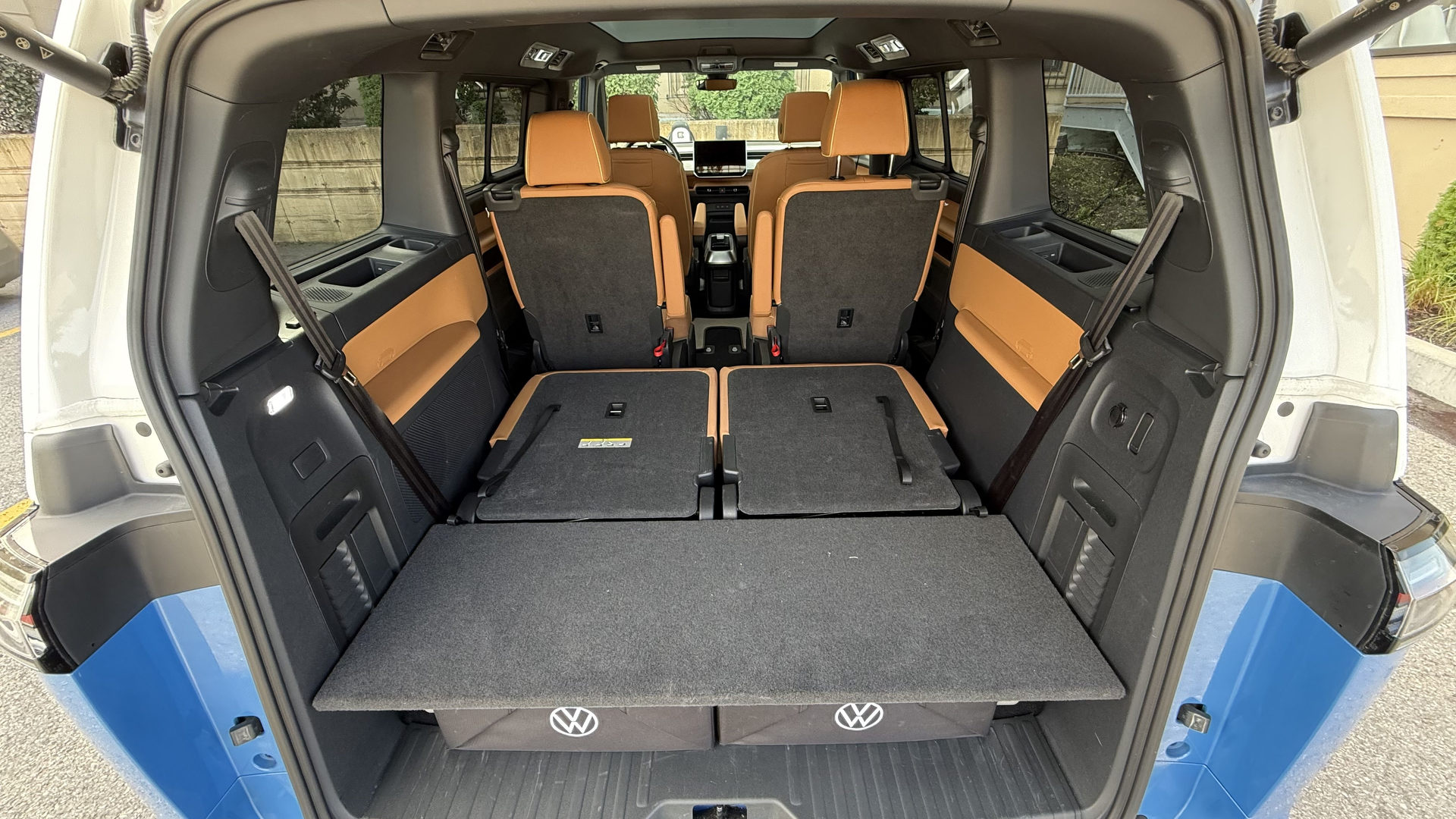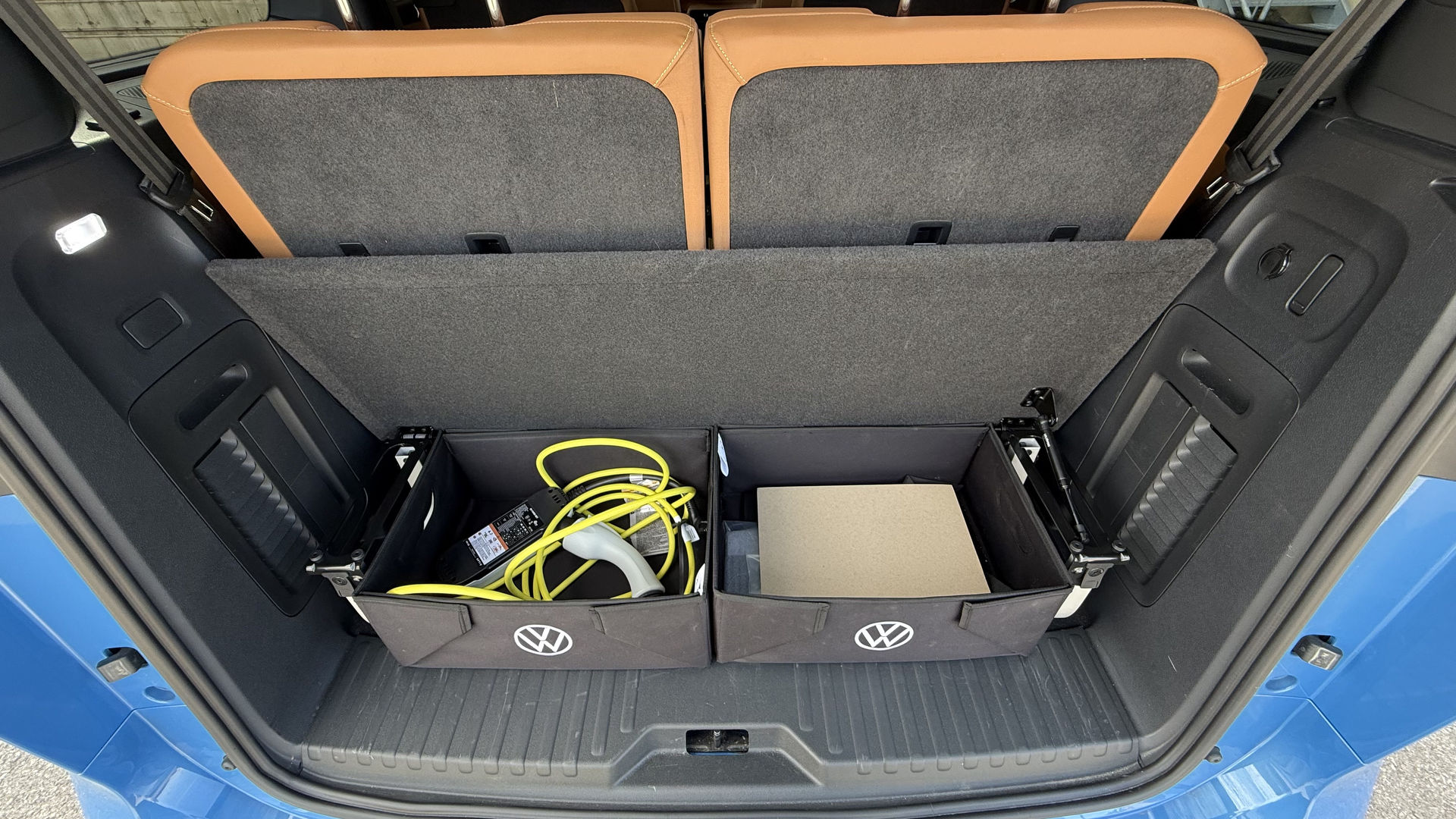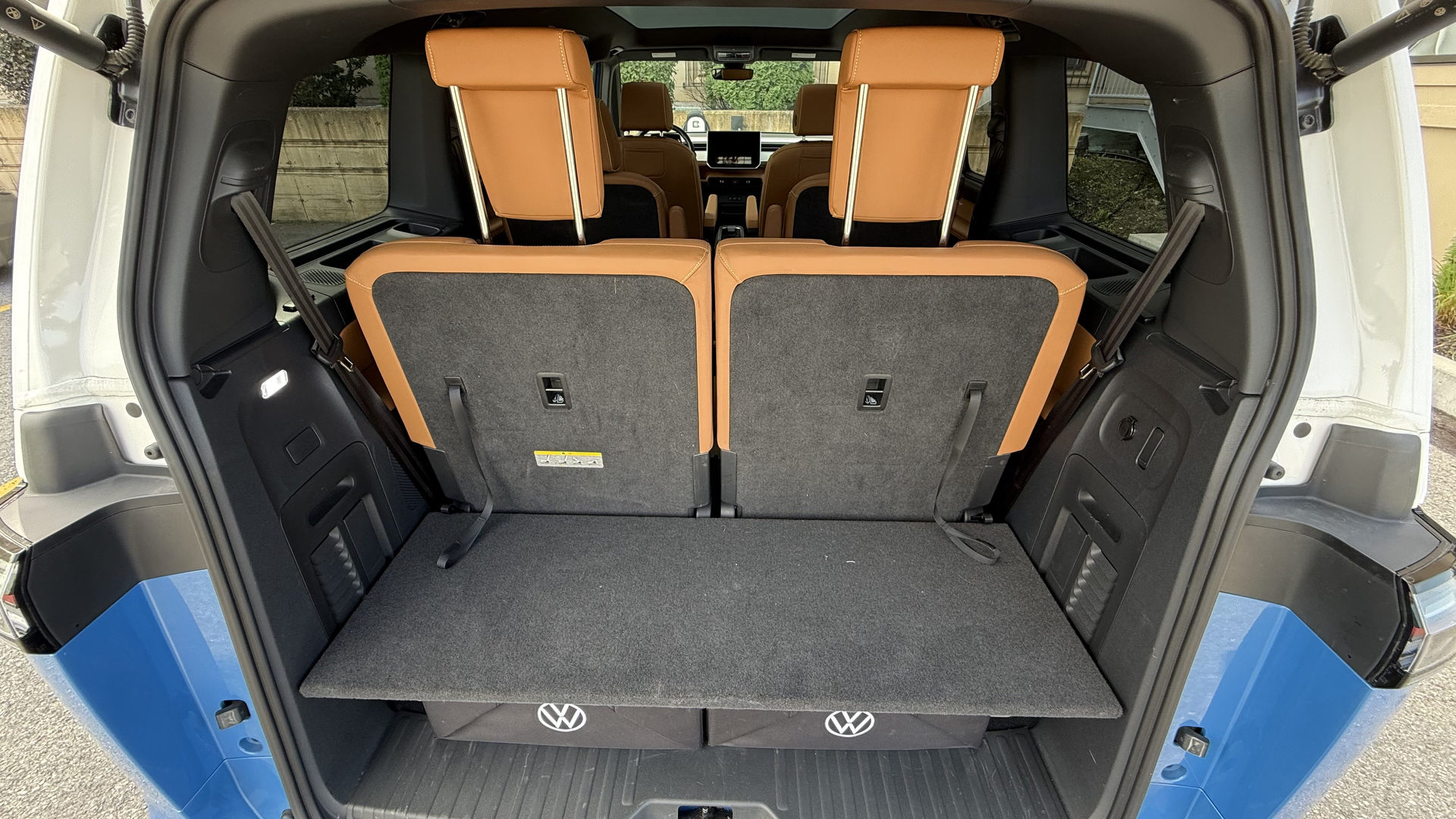 En tant que minifourgonnette, l’ID. Buzz s’en tire plutôt bien. Les portières coulissantes et le hayon motorisés sont excellents, et les sièges capitaines de deuxième rangée (de série avec la traction intégrale) facilitent l’accès à la troisième rangée. Le Buzz Box, une console centrale amovible, ajoute une touche de praticité. L’espace à la troisième rangée est vraiment utilisable par des adultes puisque jambes et tête y trouvent leur compte.