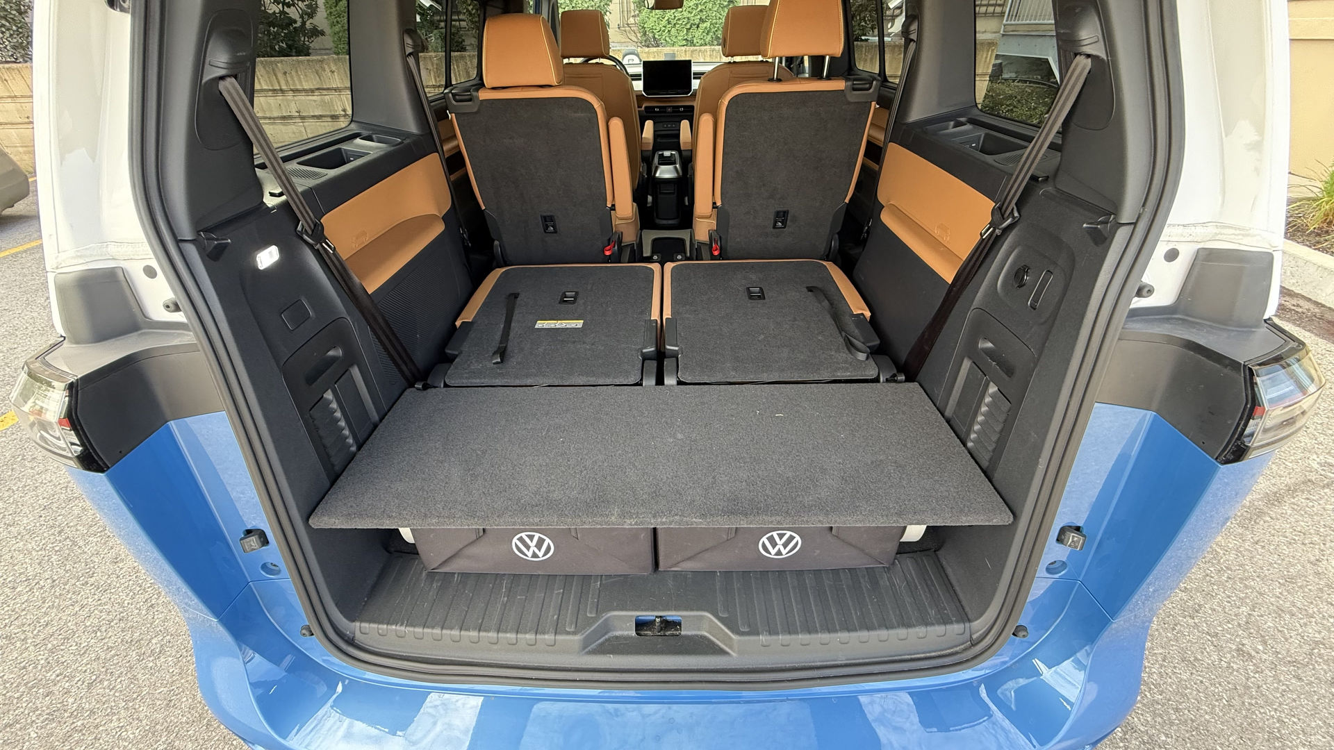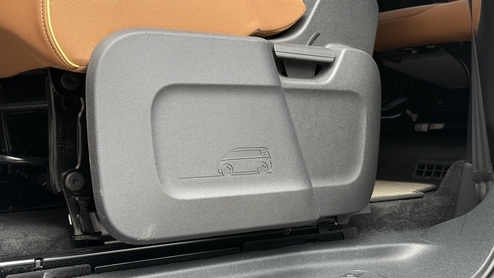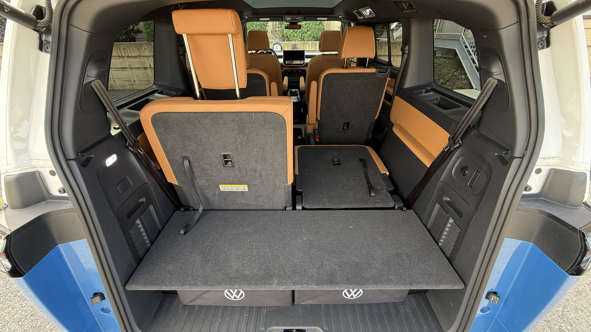 En tant que minifourgonnette, l’ID. Buzz s’en tire plutôt bien. Les portières coulissantes et le hayon motorisés sont excellents, et les sièges capitaines de deuxième rangée (de série avec la traction intégrale) facilitent l’accès à la troisième rangée. Le Buzz Box, une console centrale amovible, ajoute une touche de praticité. L’espace à la troisième rangée est vraiment utilisable par des adultes puisque jambes et tête y trouvent leur compte.