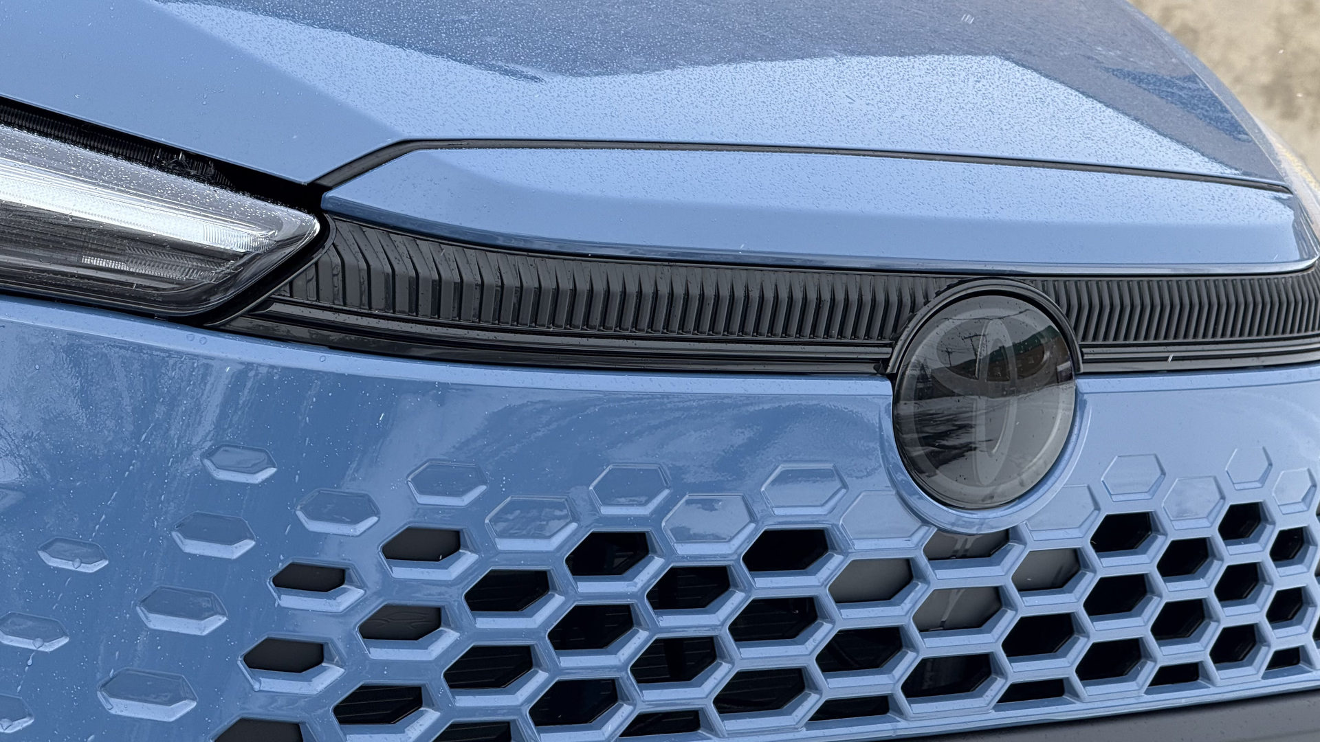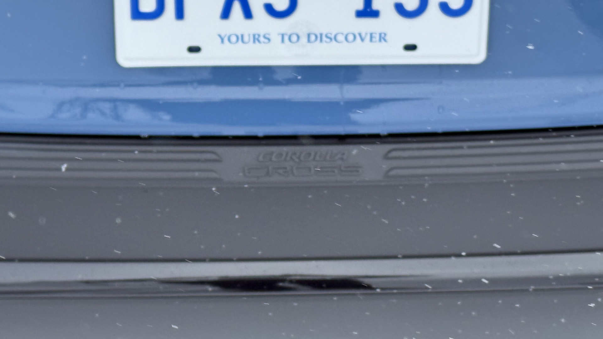Celui-ci est fini en bleu Cavalrie avec un toit noir, une option à 540 $ qui convient réellement bien à la silhouette. Le style général demeure poli et inoffensif, ce qui, franchement, fait partie de la formule Corolla. On retrouve même quelques clins d’œil ludiques disséminés sur l’extérieur si l’on regarde d’assez près.