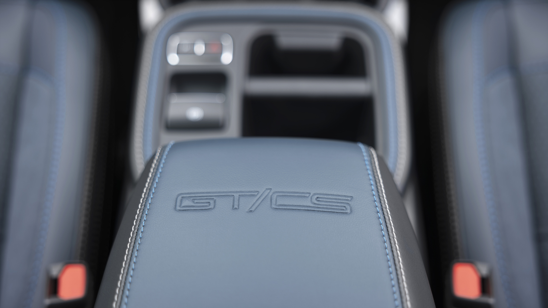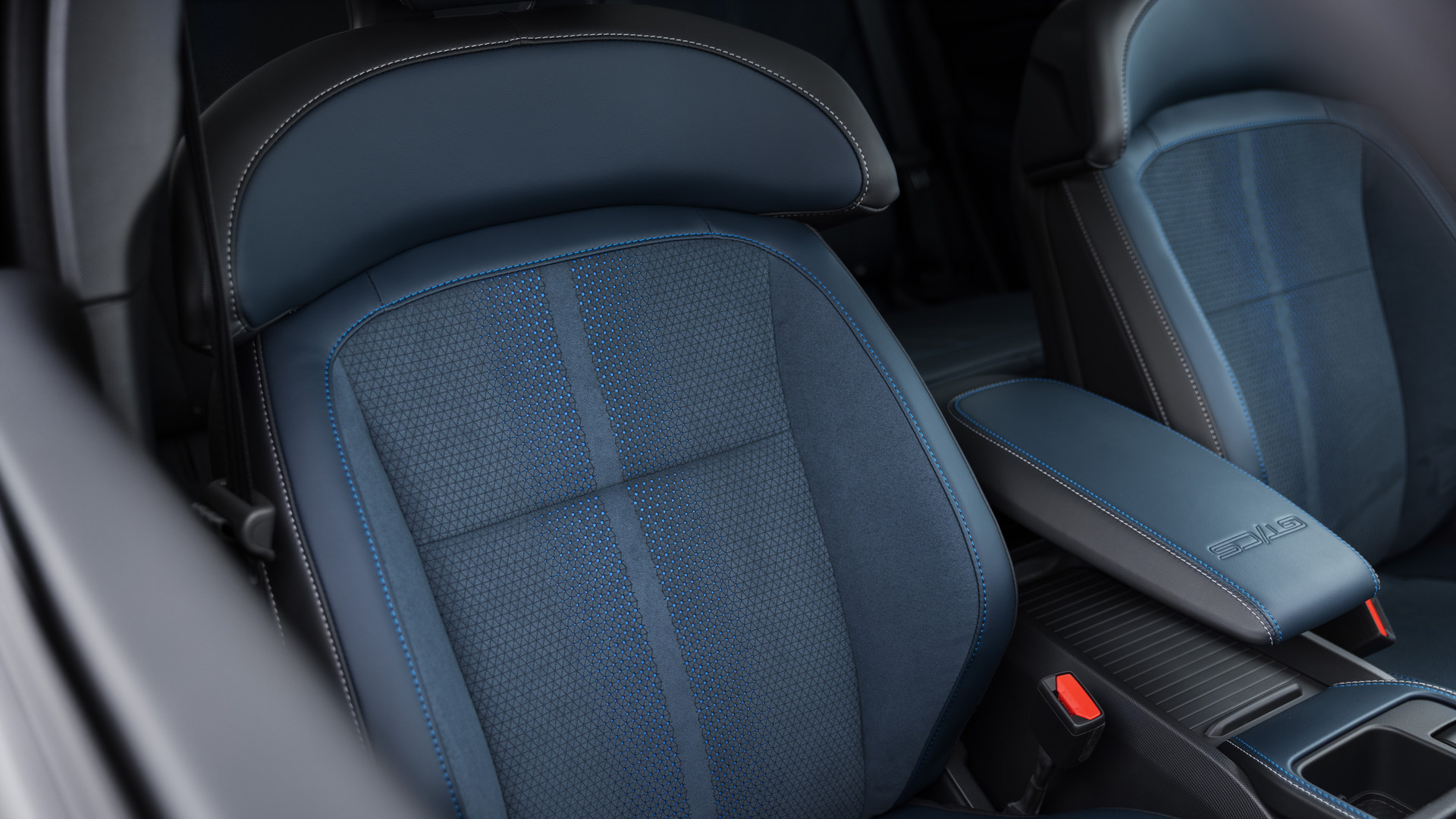 À l’intérieur, les sièges sont recouverts d’une sellerie en Active-X et Miko de couleur bleu Navy Pier, une alternative végétalienne au cuir et au suède. Le même similicuir se retrouve également sur le tableau de bord, les accoudoirs et la console centrale, où un logo « GT/CS » est embossé. Des surpiqûres contrastantes blanches et bleues complètent les changements par rapport au Mach-E GT de série.