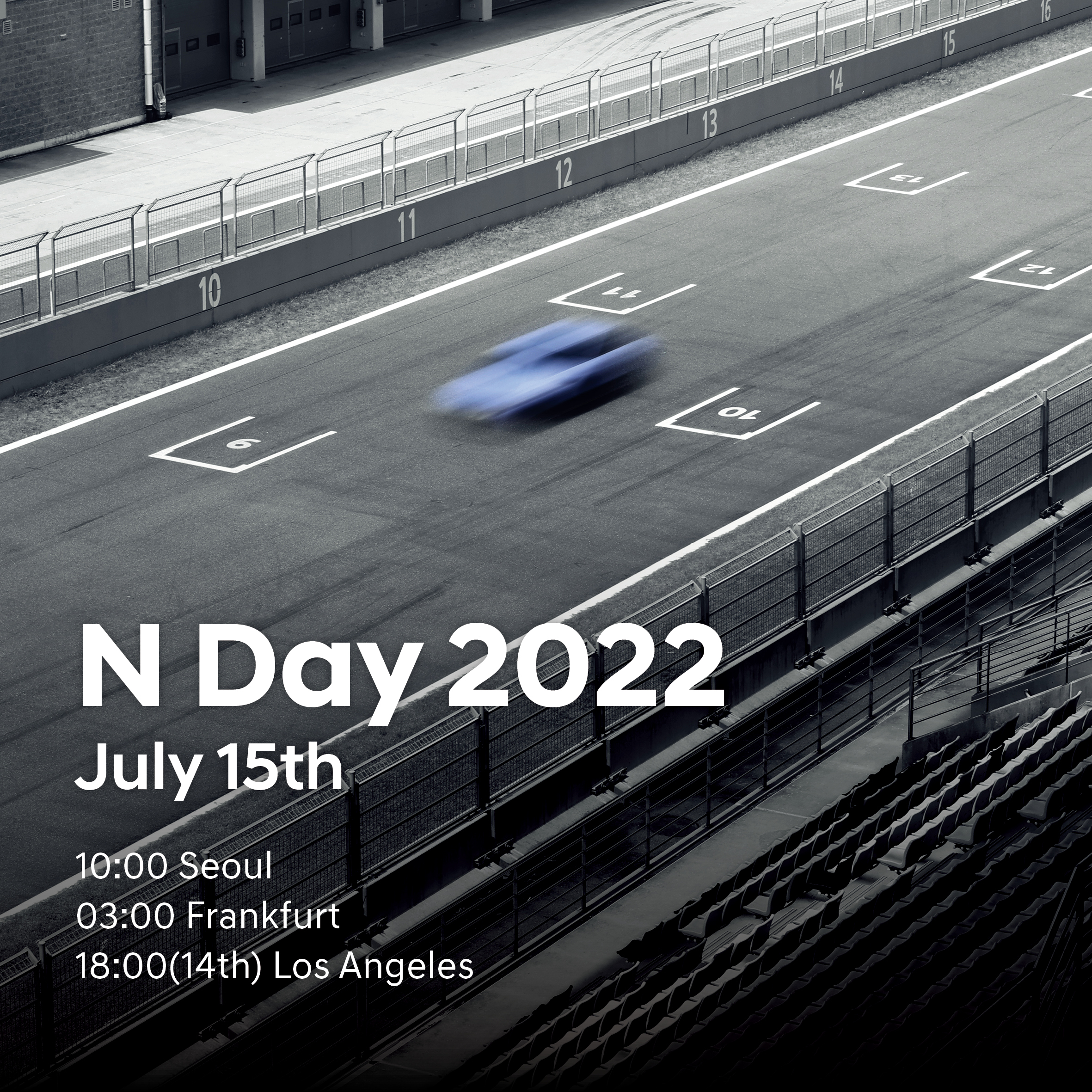 La première image montre une voiture floue roulant à toute allure sur une piste de course. Il s’agit très probablement de l’Ioniq 5 N, qui sera la première voiture électrique à être mise au point par la division N du constructeur.