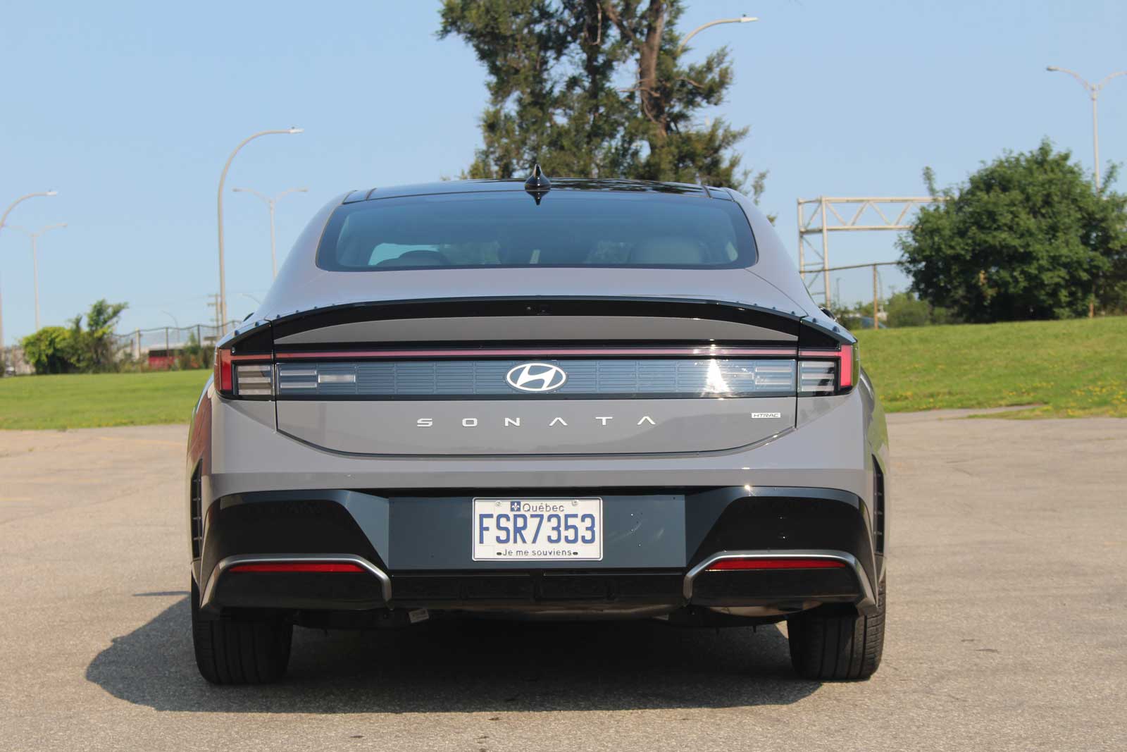 Mais bon, revenons à la Hyundai Sonata 2024. La génération actuelle de la berline est arrivée pour le millésime 2020, et vient tout juste de recevoir un rafraîchissement de mi-parcours. La partie avant a été redessinée afin de ressembler aux autres produits de la marque, arborant une mince bande lumineuse horizontale avec des phares séparés, flanquant la grille de calandre noire. La partie arrière a aussi été retouchée avec un nouveau pare-chocs et une garniture pleine largeur intégrant les feux. Quelques autres révisions esthétiques, de nouvelles teintes de carrosserie et de nouvelles jantes en alliage font également partie des changements.