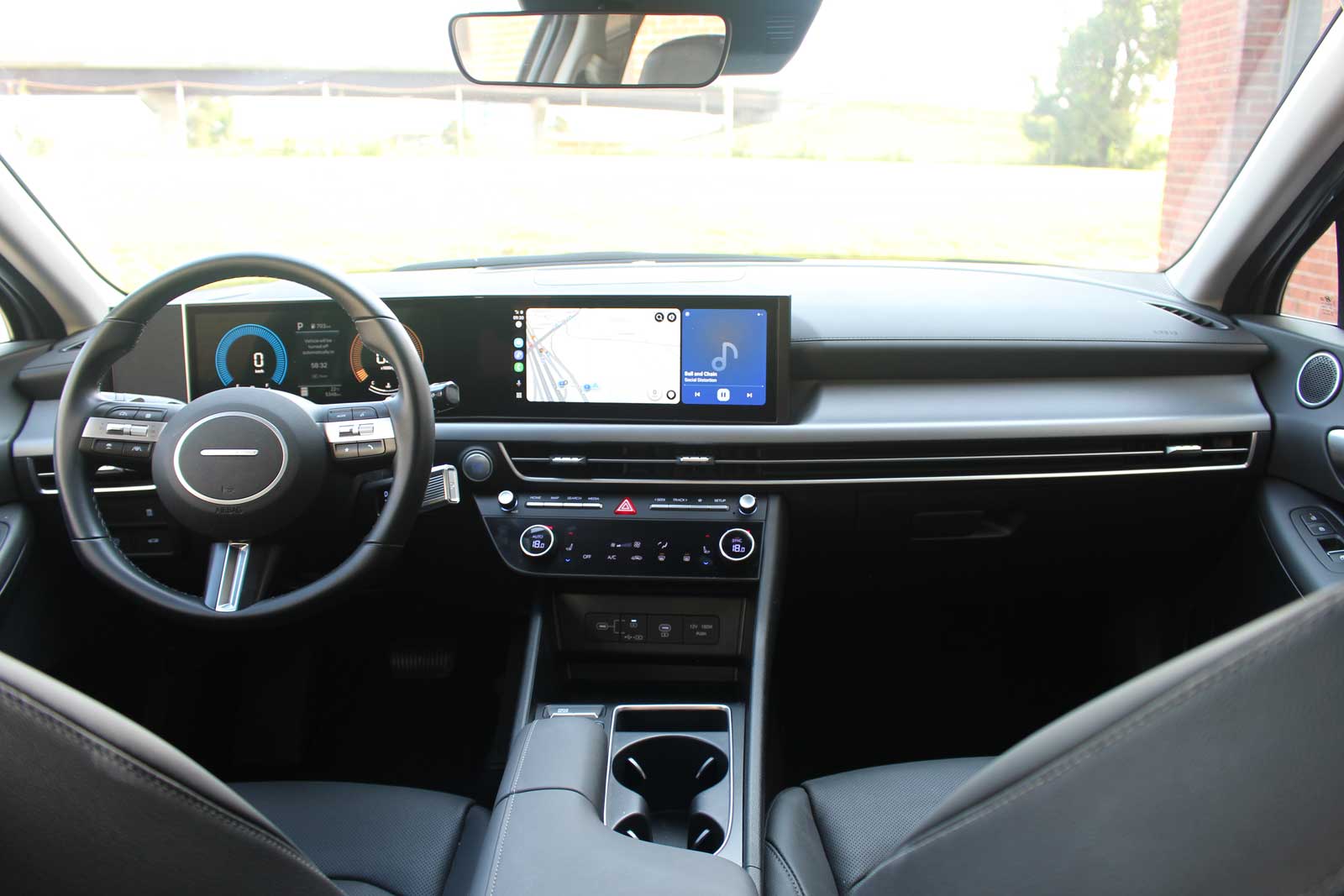 Si le design épuré nous plaît dans l’ensemble, les graphiques de l’instrumentation du conducteur sont un peu ternes. Le style pixellisé rétro est à la mode en ce moment chez Hyundai, et pourrait ne pas plaire à tout le monde. De plus, l’absence d’un logo de la marque sur le volant lui confère une apparence très générique.