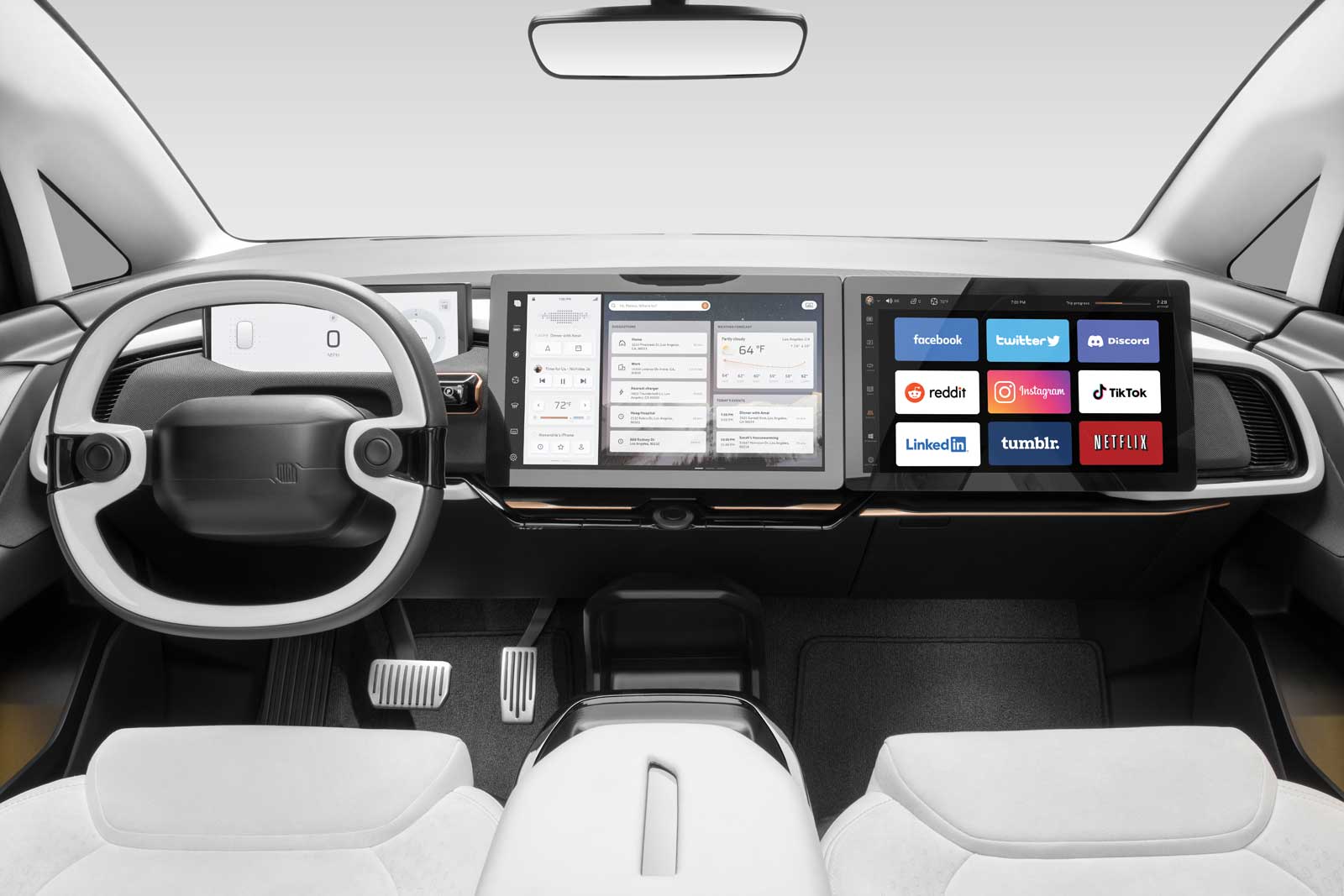 Un clavier et une souris peuvent être connectés au système afin de travailler plus efficacement. Les lois actuelles interdisent au conducteur de voir ce qui se passe sur l’écran de droite, alors il sera adapté pour que seul le passager puisse l’utiliser. On retrouve cinq caméras haute définition et des micros à bord, permettant de créer du contenu et participer à des vidéoconférences. Les passagers peuvent s’amuser avec des jeux vidéo, même ceux exploitant la réalité augmentée avec un casque et des manettes. IndiEV dit que son système est adapté pour ne pas donner le mal des transports.