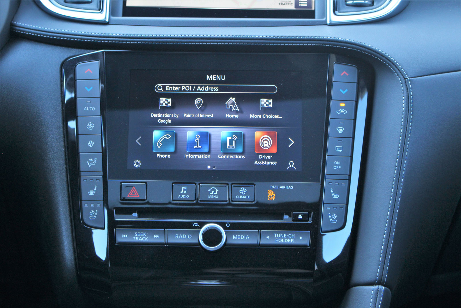 Curieusement, comme dans le QX50, il n’y a pas de sièges arrière chauffants dans l’Infiniti QX55 2022, bien que les sièges avant chauffants figurent de série, et la ventilation de ceux-ci est incluse dans la version SENSORY, tout comme un climatiseur automatique à trois zones, un éclairage d’ambiance et le système de conduite ProPilot Assist, entre autres. La chaîne audio Bose à 16 haut-parleurs est excellente, et bien que le système multimédia Infiniti InTouch fonctionne convenablement, il commence à dater malgré la commodité des deux écrans superposés. Au moins, on retrouve encore des boutons physiques pour régler la climatisation.