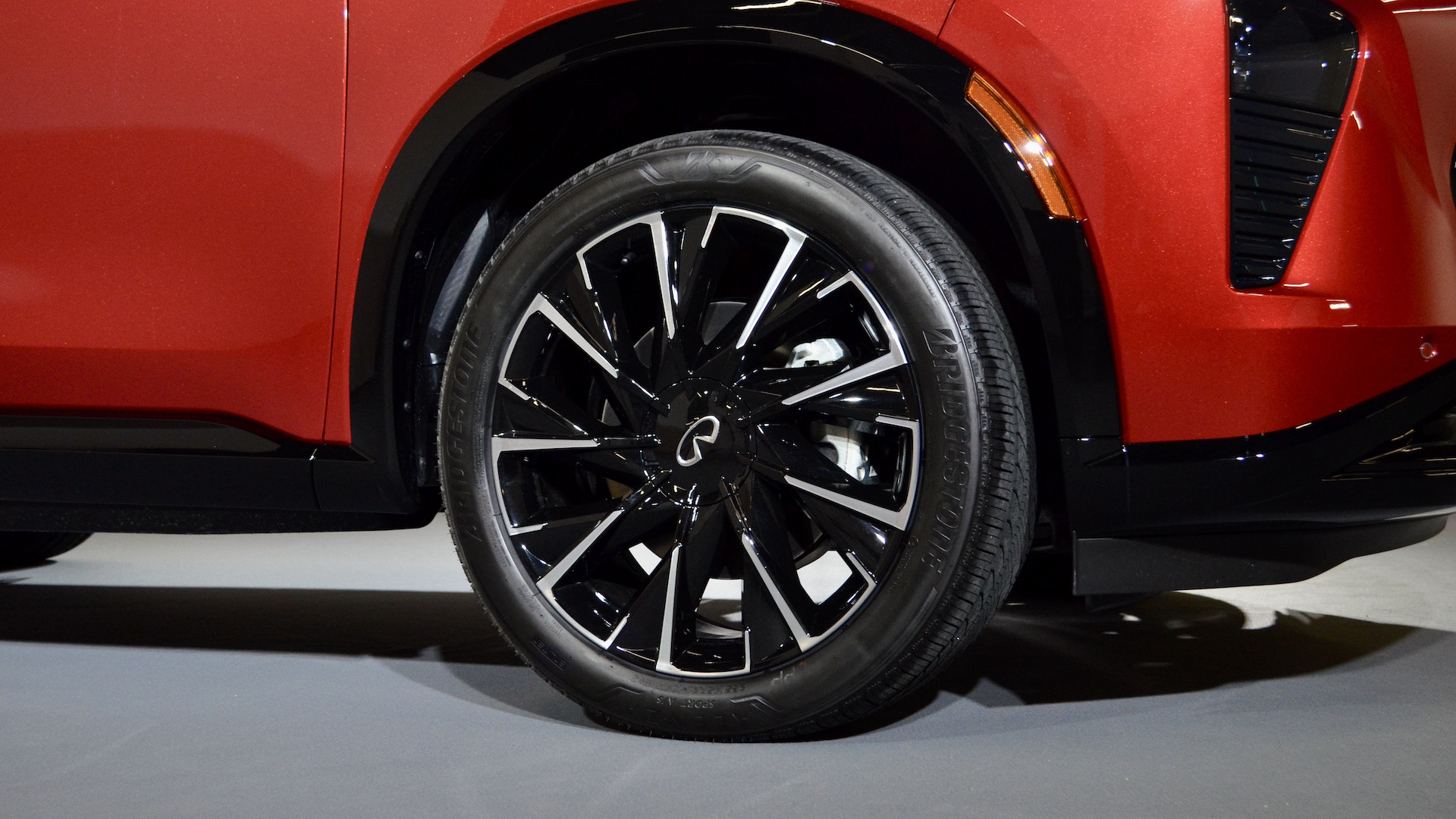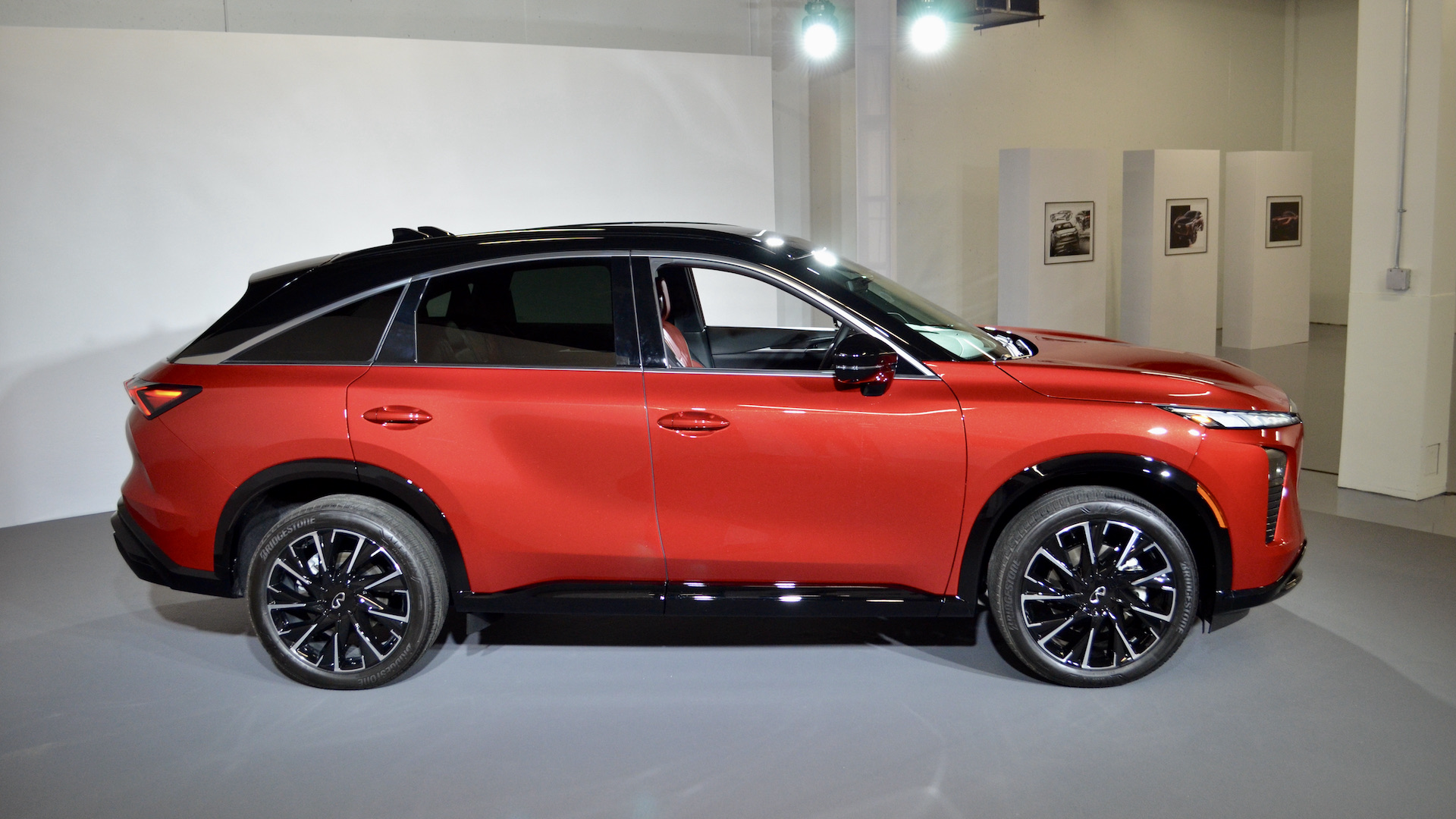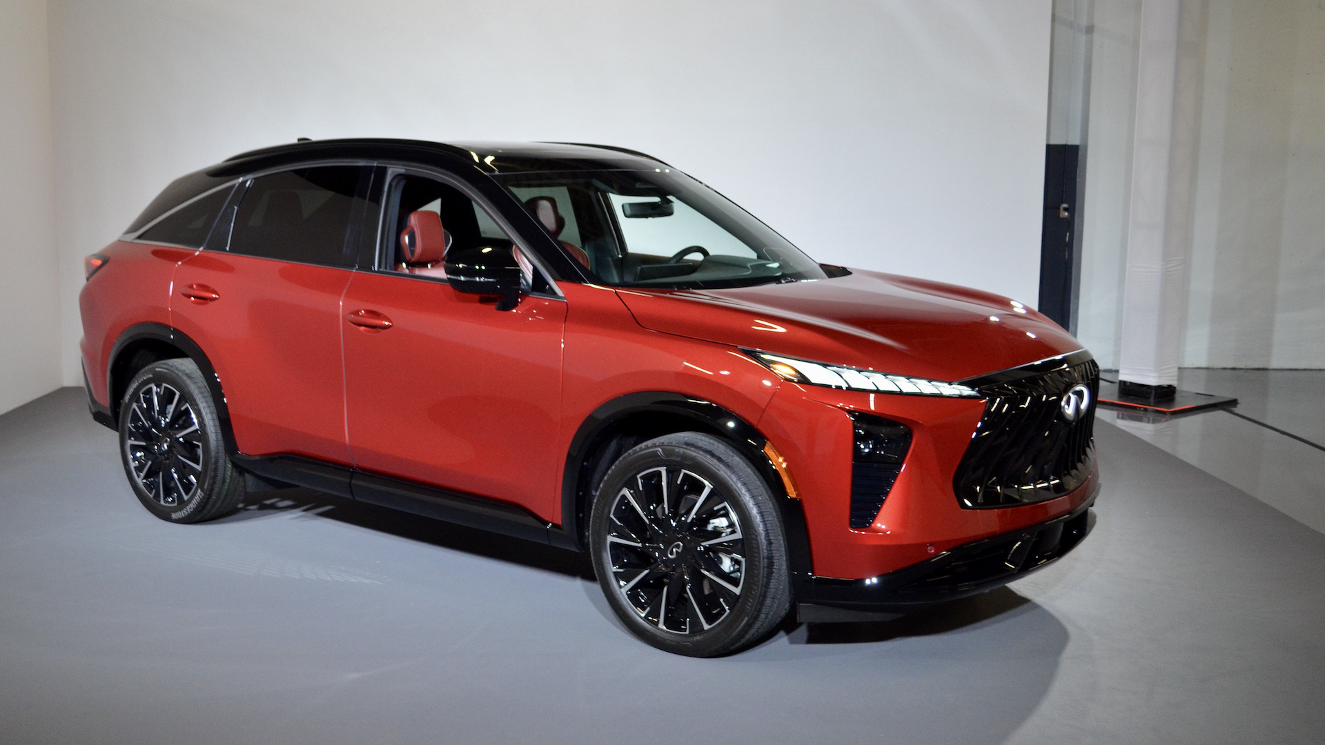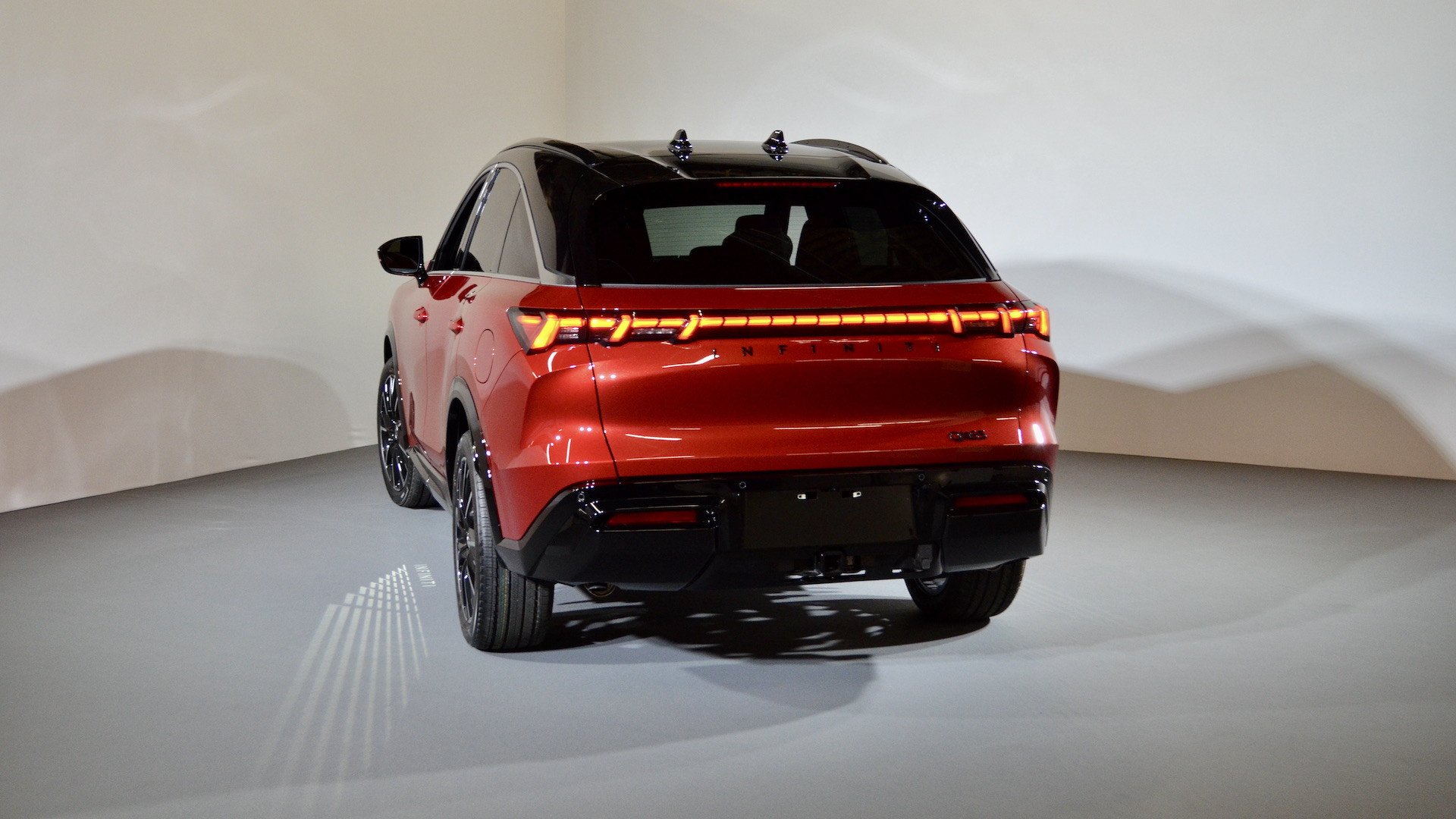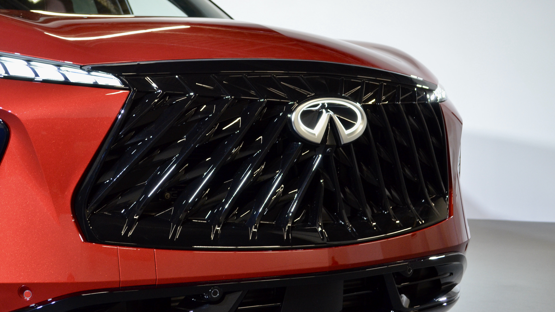 Sous l’égide du designer en chef Alfonso Albaïsa, le design Artistry in Motion, propose des traits évolutifs pour le constructeur. On reconnait immédiatement les liens avec le QX60, mais les deux modèles ne partagent que quelques pièces en commun à la carrosserie. C’est surtout manifeste avec la forme des blocs optiques qui sont scindés en deux, la grosse mode dans l’automobile actuellement. De ce fait, les phares de jour et la signature visuelle du modèle sont constitués des notes de piano en DEL comme sur le QX80. Sur le concept, ces touches de piano continuaient dans la calandre, mais ce n’est malheureusement plus le cas avec la version de production.