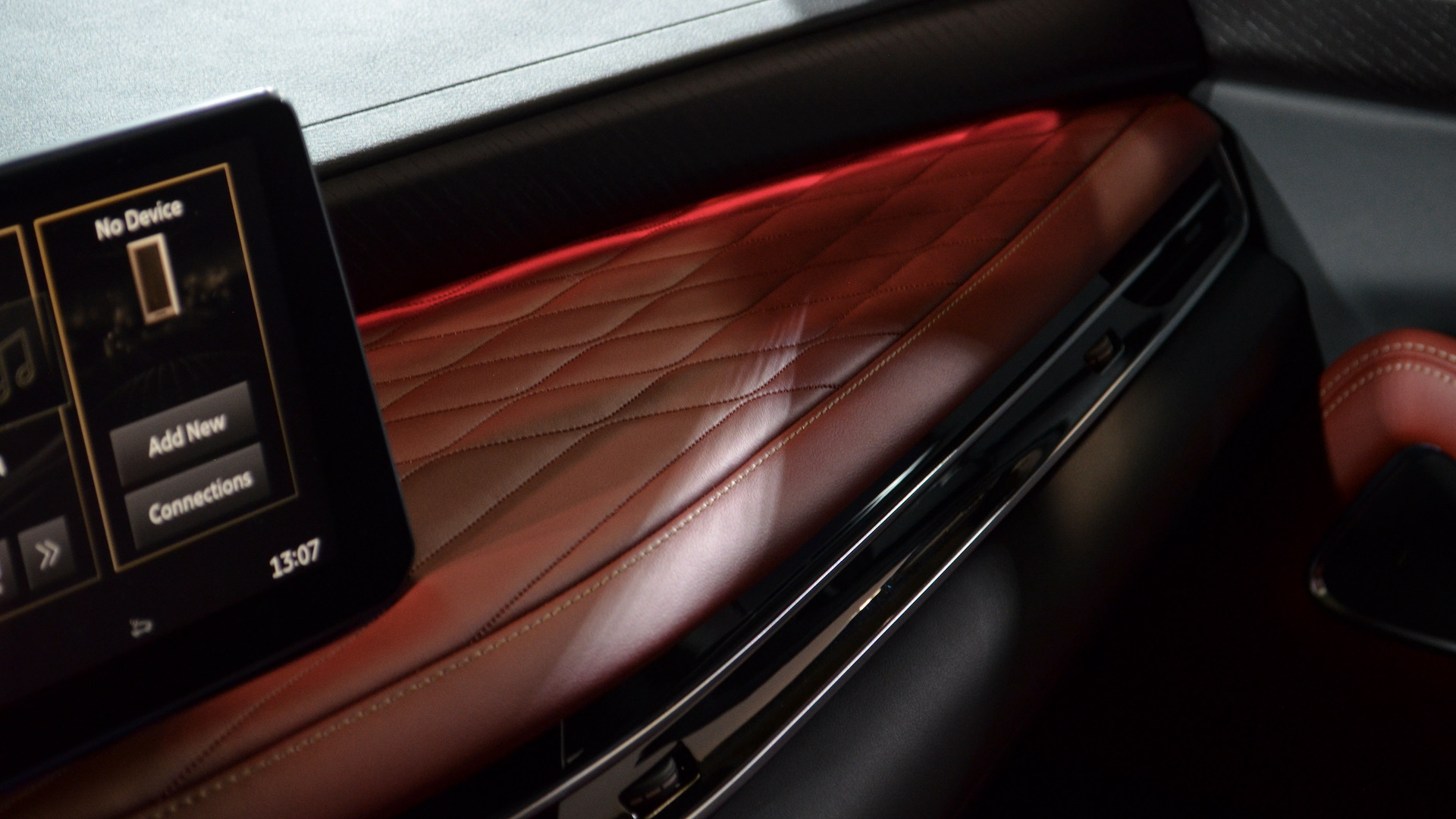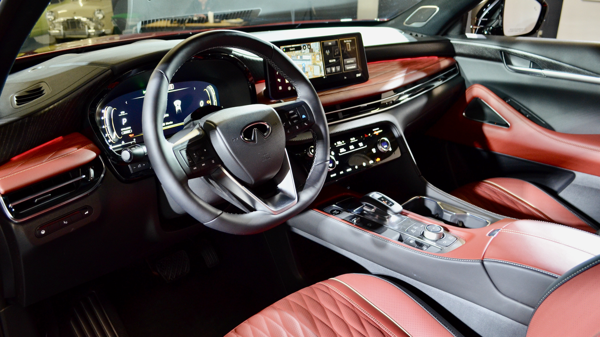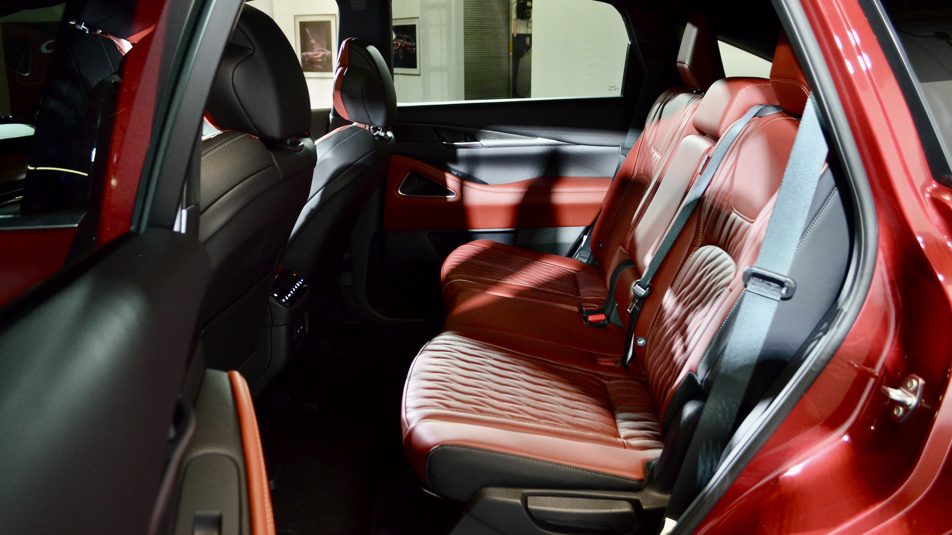 Le QX65 Autograph vient avec des accents en bois à pores ouverts, un tableau de bord recouvert de cuir matelassé, des plaques de protection en aluminium dans l’aire de chargement ainsi que des seuils de portes avant et arrière illuminés. Les sièges en cuir semi-aniline présentent un motif de matelassage diagonal asymétrique inspiré des plis d’un kimono. Les sièges avant avec fonction de massage et climatisés sont inclus à ce niveau. Même chose pour les sièges chauffants à l’arrière. Avec le rouge, le style général a une approche très italienne qui lui donne une touche d’exotisme.