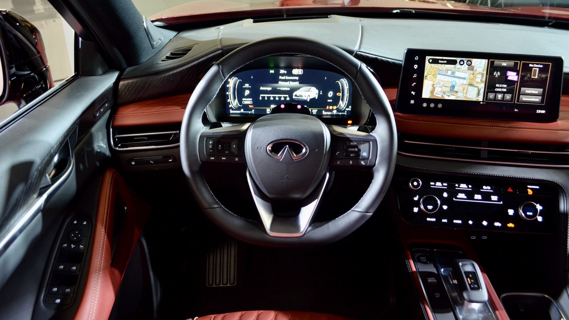 La présentation intérieure vient directement du QX60 et c’est normal. L’allure générale est moderne et a été améliorée en 2025 sur le QX60. En plus d’un affichage tête-haute de 10,3 pouces à partir du modèle Sport, on retrouve les deux écrans de 12,3 pouces que l’on voit partout chez Nissan Infiniti. Pour la techno, on obtient aussi Google Assistant à bord pour nous faciliter la vie et bien sûr, Apple CarPlay et Android Auto sont de série.