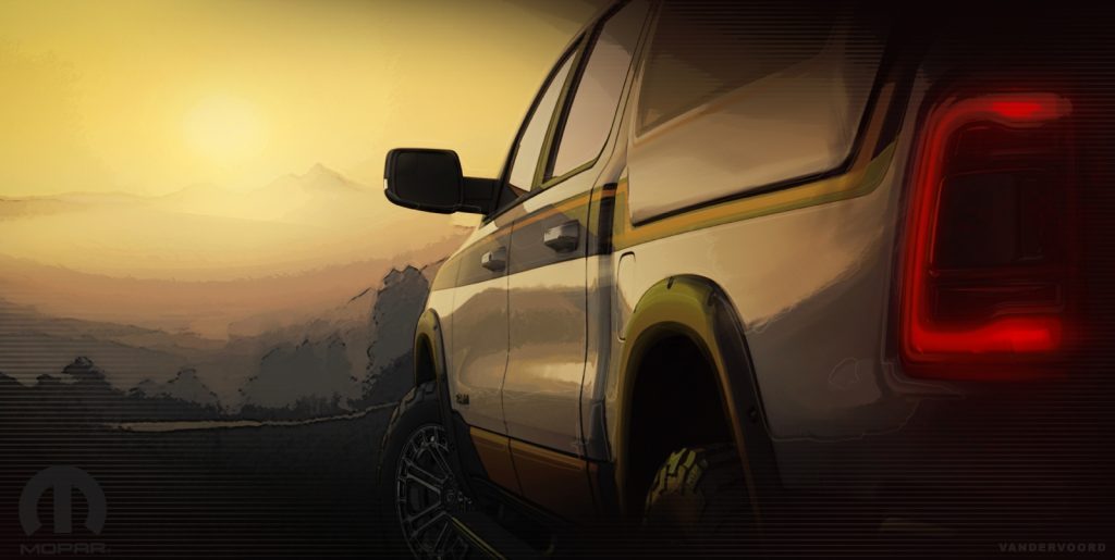 La deuxième image montre le profil d’une camionnette Ram 1500 à cabine d’équipe, le véhicule qui semble être équipé d’une boîte en fibre de verre installée dans la boîte de chargement derrière, tandis que le véhicule porte également des pneus tout terrain. Gageons que Ram prévoit montrer une autre idée de véhicule pour les amateurs d’« overlanding ». On verra bien dans ce cas-ci.