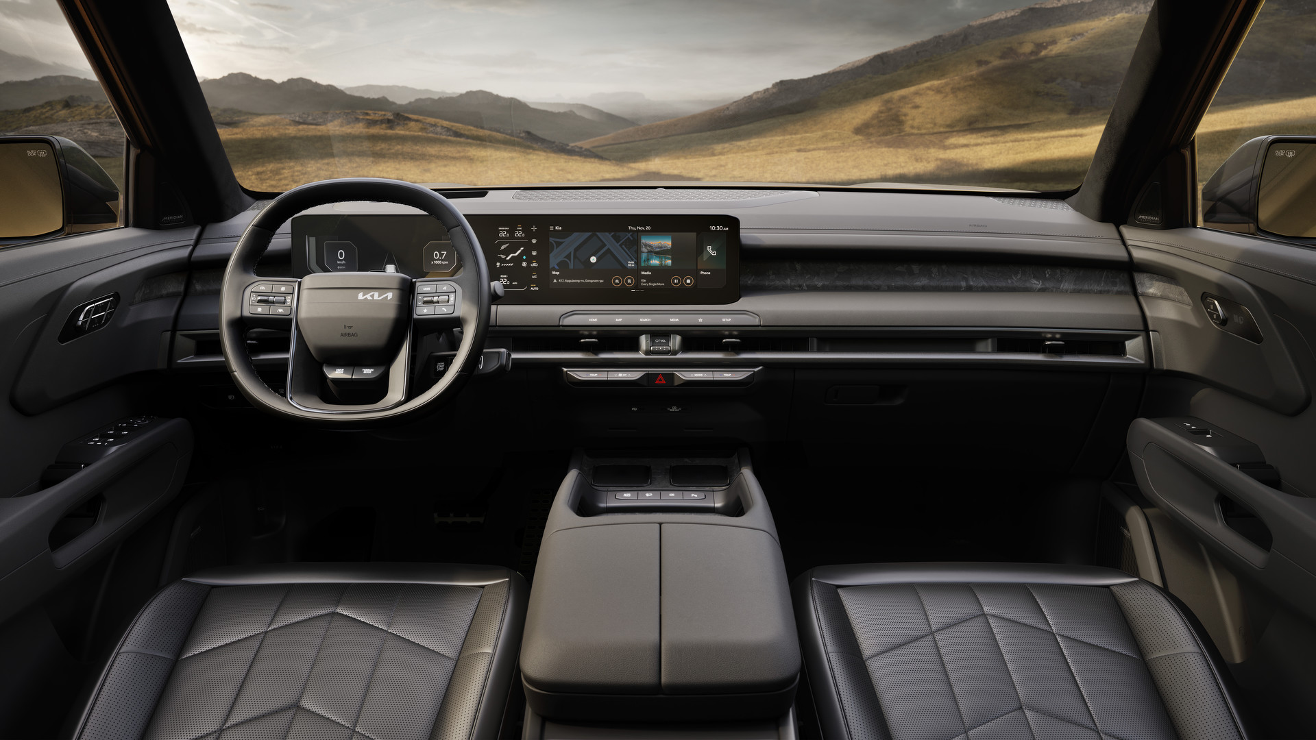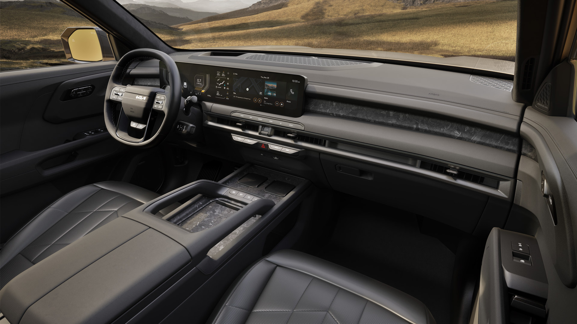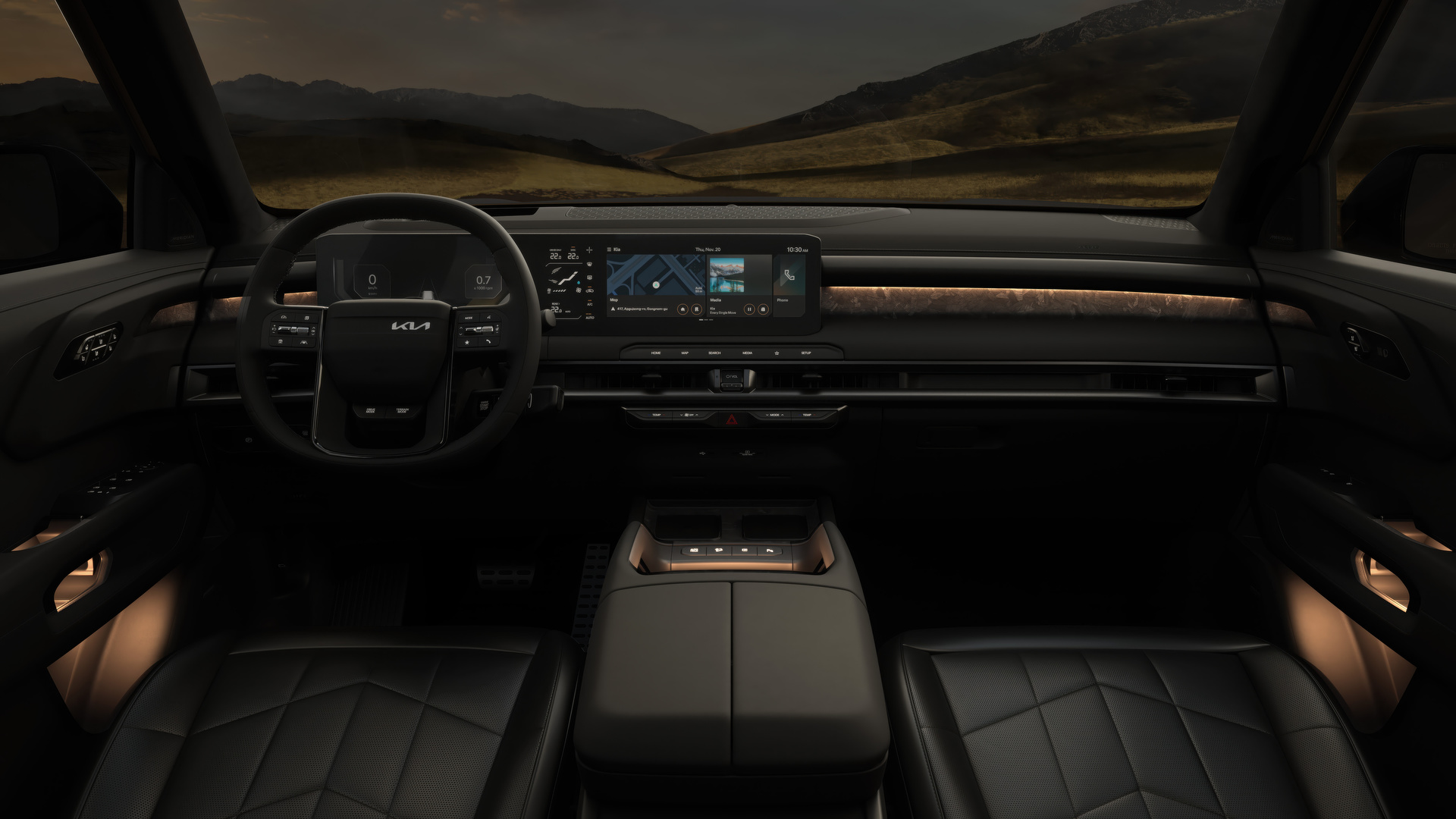 À l’intérieur, Kia décrit l’habitacle du Telluride comme un « sanctuaire technologique ». La disposition horizontale et la planche de bord enveloppante créent une sensation d’espace tout en procurant une ambiance intime. Les dimensions accrues facilitent l’accès aux sièges arrière, tandis que l’espace pour la tête est amélioré dans les modèles dotés d’un toit ouvrant. L’intérieur intègre des surfaces à effet bois, des accents métalliques, un éclairage ambiant et un espace de chargement modulable avec une table pliante et des repères de mesure intégrés.
