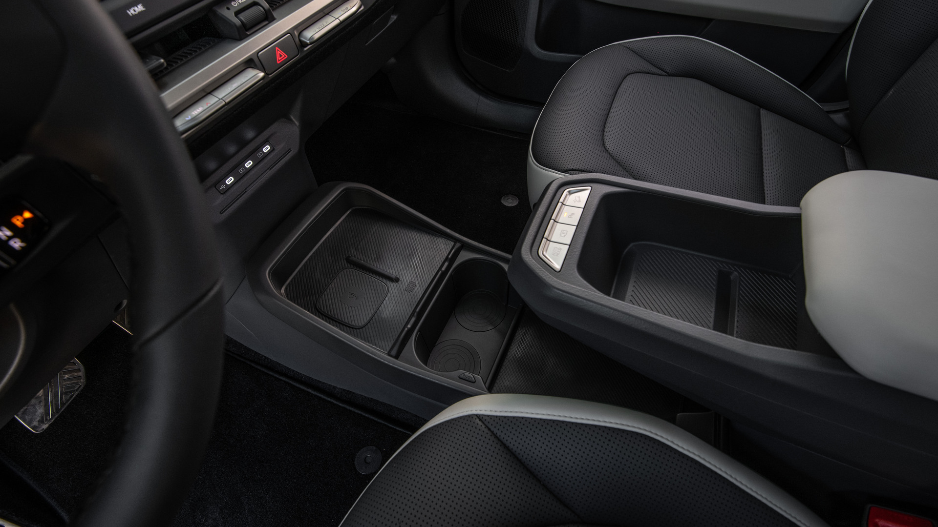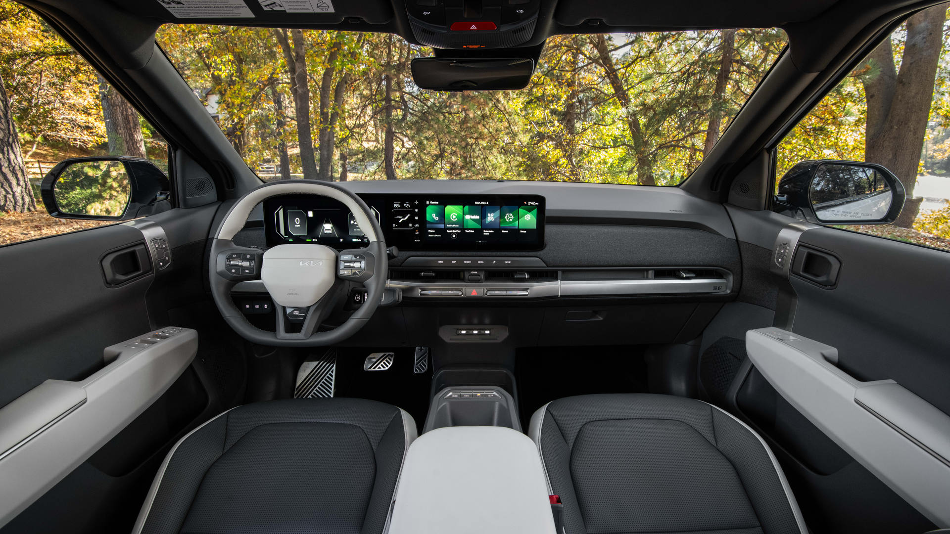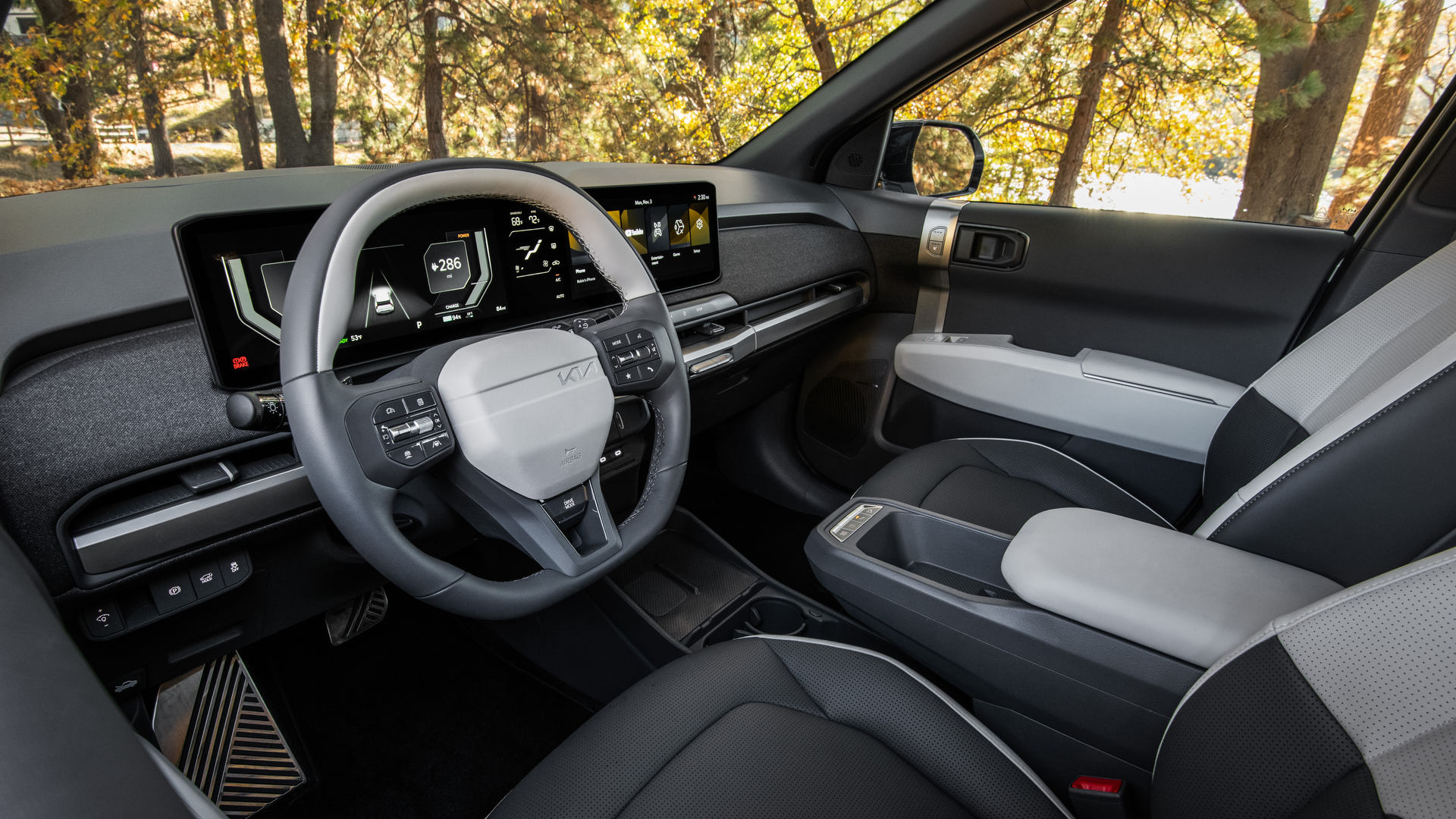 L’habitacle reprend plusieurs caractéristiques associées aux véhicules électriques Kia plus grands et plus coûteux. L’équipement de série comprend près de 30 pouces d’espace d’affichage combiné grâce à deux écrans de 12,3 pouces et à un écran de climatisation, ainsi qu’un système de climatisation automatique bizone et des sièges avant chauffants. Parmi les équipements livrables figurent un affichage tête haute, une chaîne audio Harman Kardon, des sièges avant ventilés, l’accès par clé numérique, un système de visualisation panoramique et la surveillance des angles morts avec affichage vidéo.
