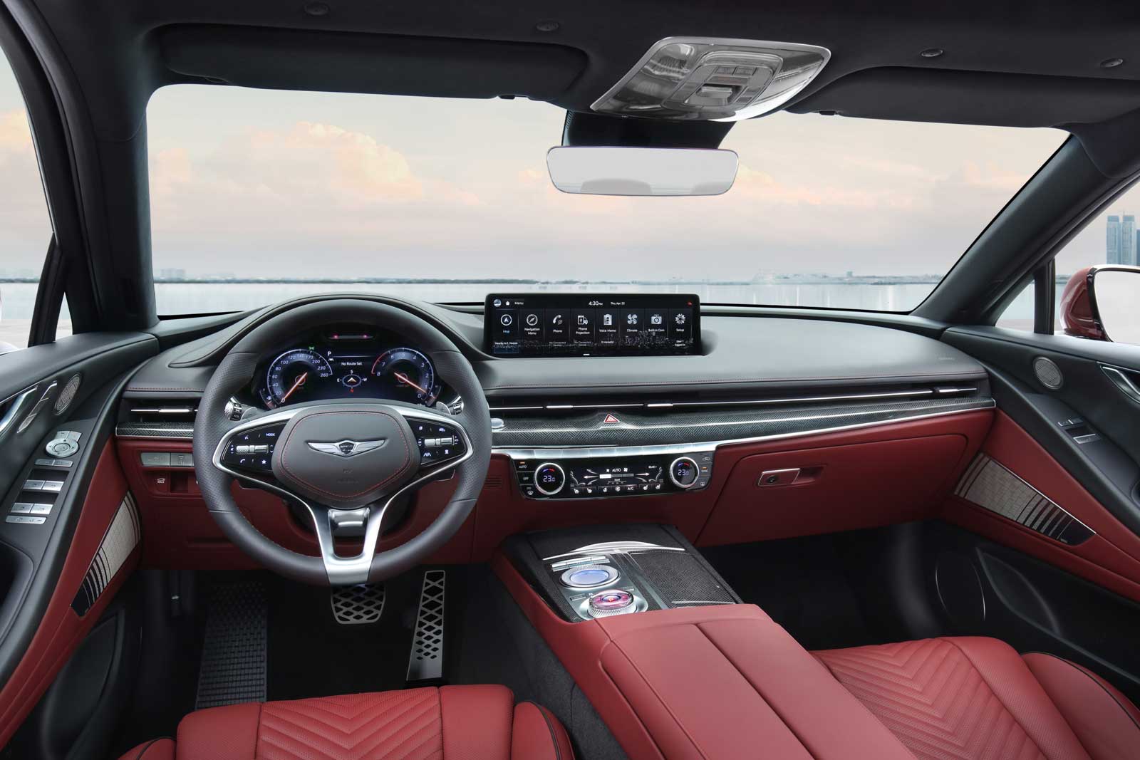 D’emblée, la G80 Sport ne se diffère pas outrageusement des autres livrées de la berline. Le département de design s’est limité à un nouvel ensemble de jantes de 20 pouces avec leur design « G-Matrix » aperçu sur le multisegment Genesis GV70. À l’avant, le grillage sous la calandre est légèrement plus agressif, tout comme la découpe du pare-chocs arrière. Ah oui, les étriers des freins à disques sont désormais disponibles avec deux coloris additionnels, soit noir et rouge. Les blocs optiques assombris font aussi partie de la recette de cette Genesis G80 Sport. La livrée Sport sera également disponible avec une nouvelle couleur de carrosserie, Rouge Cavendish, elle qui serait inspirée par les falaises rouges de l’Île-du-Prince-Édouard apparemment.