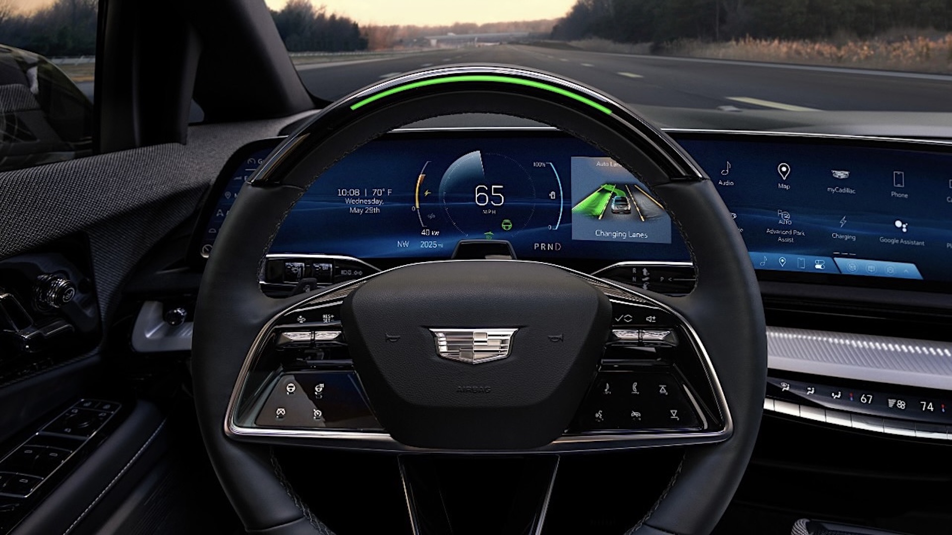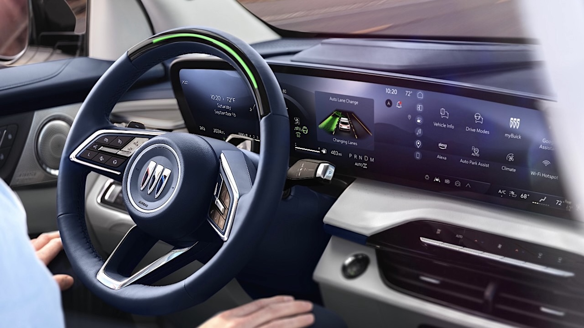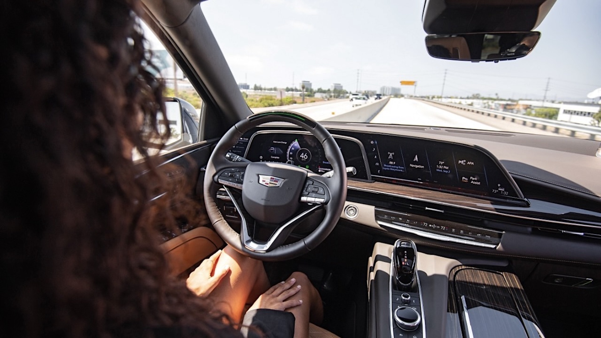 View of the 2025 Buick Enclave Avenir interior with available Super Cruise hands-free technology engaged.