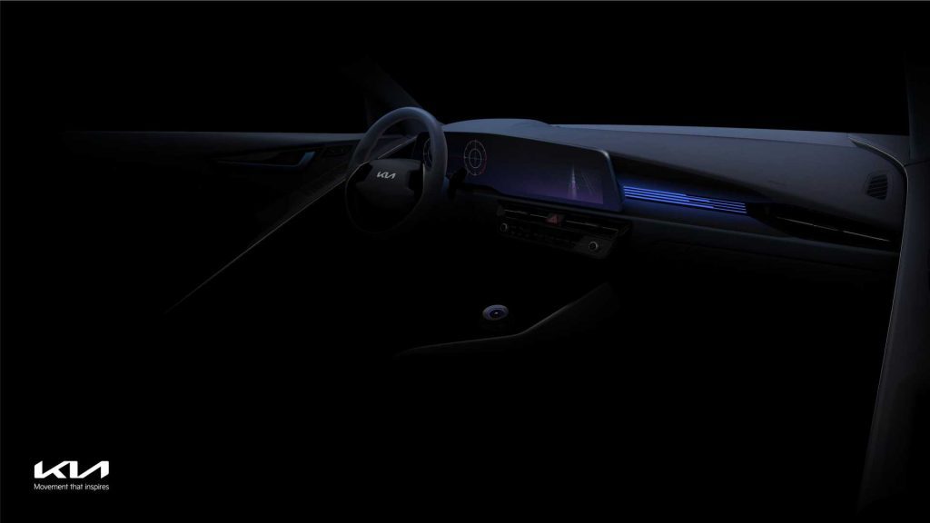 L’intérieur semble très similaire à celui de l’EV6 avec ses deux écrans côte à côte, un pour l’instrumentation et un pour l’info divertissement. Un sélecteur de vitesse rotatif est également visible, un détail partagé avec plusieurs modèles Kia.
