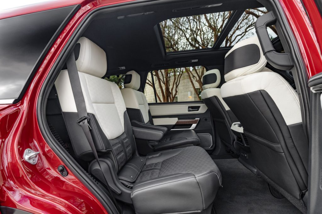 Dans l’habitacle, le Toyota Sequoia 2023 propose des sièges capitaine ou une banquette à la deuxième rangée, alors qu’en option, la troisième rangée peut être rabattue ou relevée à commande électrique. Elle peut aussi coulisser afin de maximiser l’espace de chargement lorsque tous les sièges sont occupés, et une tablette amovible permet d’optimiser l’aire de chargement à l’aide de diverses positions.