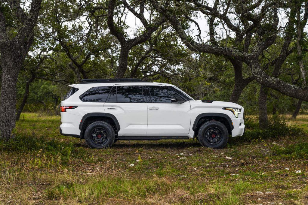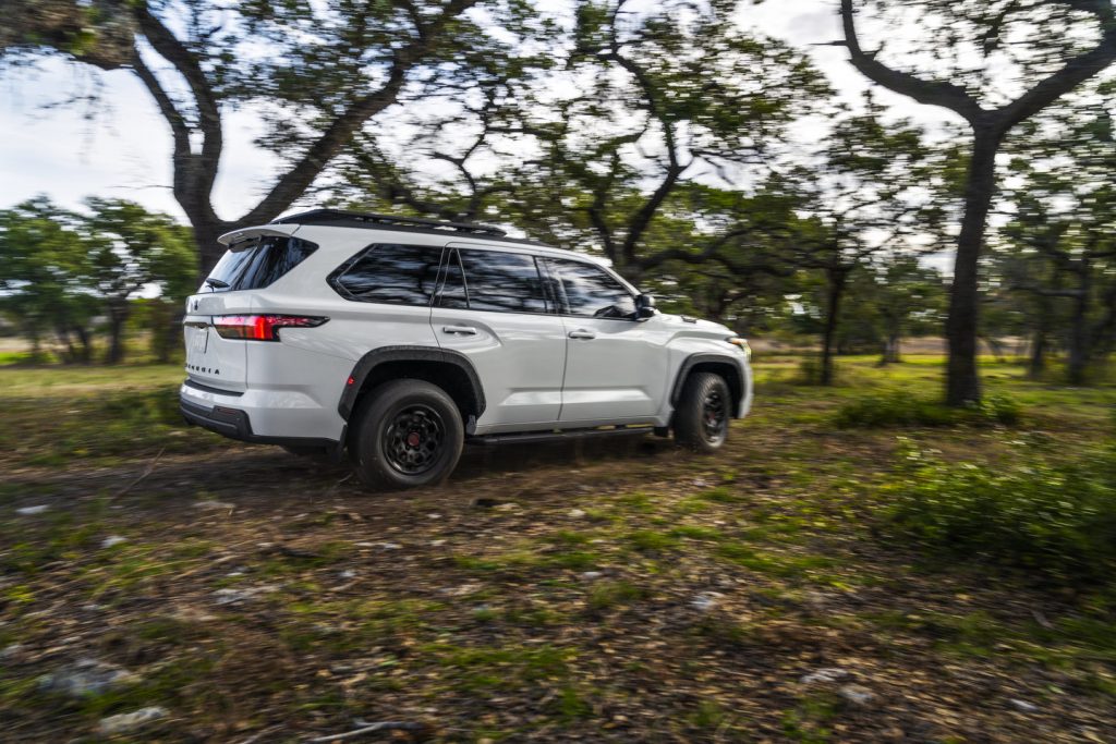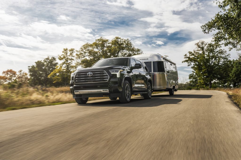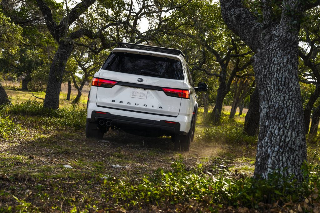 Construit sur une nouvelle plateforme partagée avec le Tundra, le Sequoia gagne en rigidité, en confort de roulement et en agrément de conduite, avec une meilleure sensation de la direction, selon les dires de Toyota. Une suspension pneumatique autonivelante et des amortisseurs adaptatifs variables figurent en option pour ceux qui doivent remorquer, et puisqu’on en parle, la capacité maximale s’élève à 4 082 kilogrammes ou 9 000 livres lorsqu’équipé convenablement – soit une amélioration de 22 %. On retrouve un nouvel ensemble technologique avec un guide pour les manœuvres de recul avec une remorque ainsi qu’une assistance de la direction.