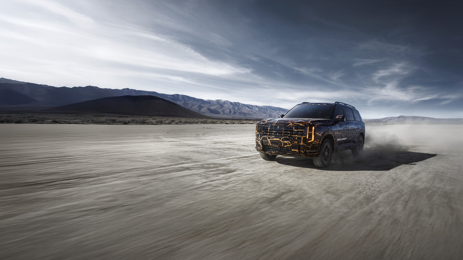 Kia dévoile un Telluride de préproduction enveloppé d’un camouflage mêlant croquis de design et dégradés de couleurs.