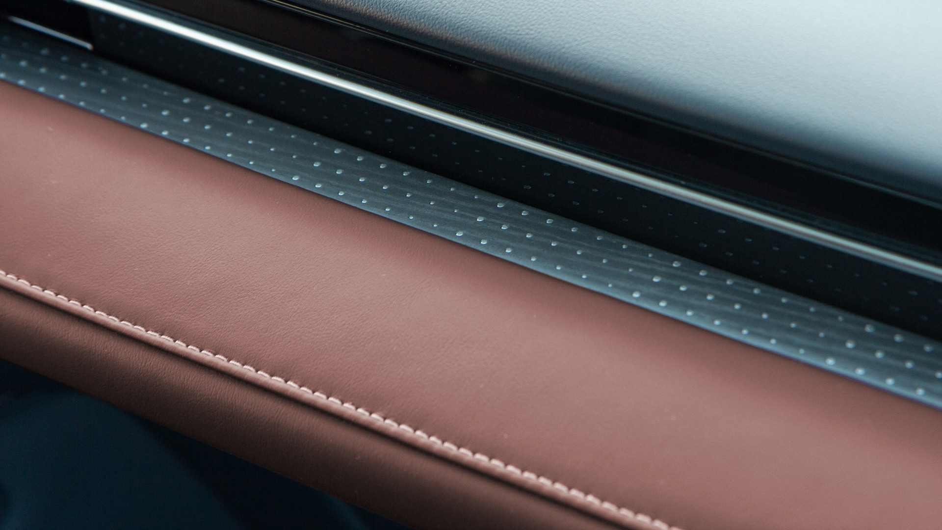 Le thème Black Label Aurora comprend ainsi une sellerie en cuir Bleu Allura avec des surfaces d’assise en suède Dinamica, un ciel de toit bleu, des accents Rouge acajou (brun foncé) sur le volant, le centre des panneaux de porte et la section centrale du tableau de bord, en plus de passepoils cuivrés et de touches de bois en marqueterie à chevrons.