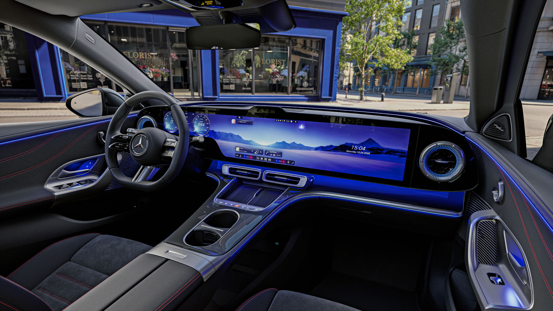 Le MBUX Superscreen pleine largeur sera de série, tandis que le MBUX Hyperscreen sera disponible, offrant au passager avant un écran dédié en plus du système d’infodivertissement central.