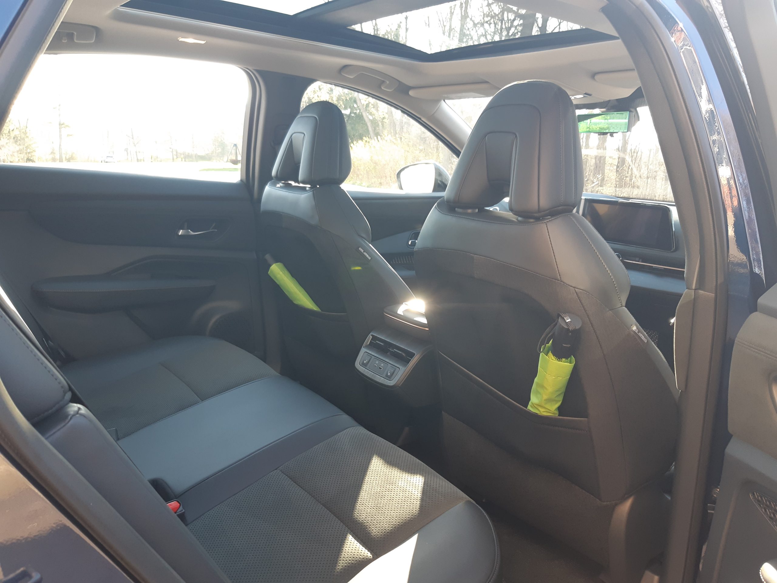 Nissan a su mettre de l’avant un des avantages des véhicules électriques qui est la possibilité d’avoir un plancher complètement plat, ce qui donne un intérieur très spacieux. De plus, la planche de bord de l’Ariya adopte un look très moderne et minimaliste, avec deux écrans de 12.3 pouces juchés au sommet d’une planche de bord on ne peut plus simple. Les commandes tactiles sont difficiles à trouver sans quitter la route des yeux, mais elles offrent une bonne rétroaction lorsqu’on les actionne et leur installation sur des appliques fini bois est originale et d’un bel effet.