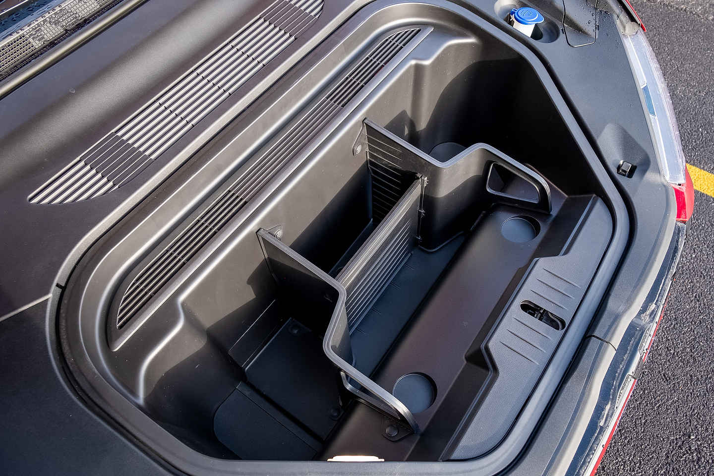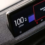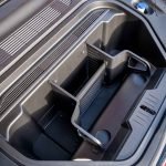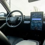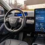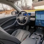 À bord, la Mach-E se révèle spacieuse et généralement agréable. Les sièges avant et les positions extérieures arrière sont assez confortables. Le coffre avant offre un certain nombre de séparations pour un rangement intelligent, tandis que le coffre arrière offre un espace utilisable décent. La banquette arrière peut accueillir trois personnes sans problème. À l’avant, le tableau de bord est un croisement entre le cockpit plus conventionnel de la Polestar 2 et celui de la Tesla Model 3 plutôt dépouillé.