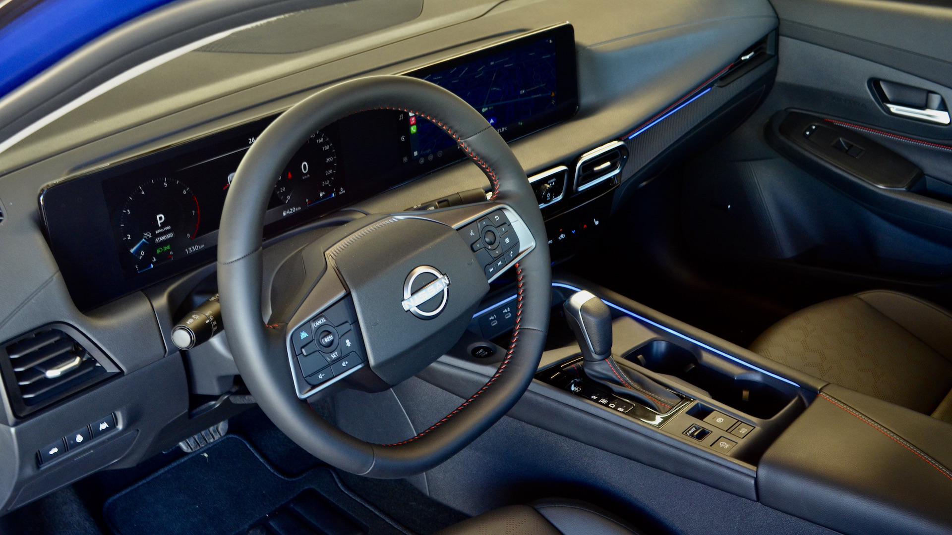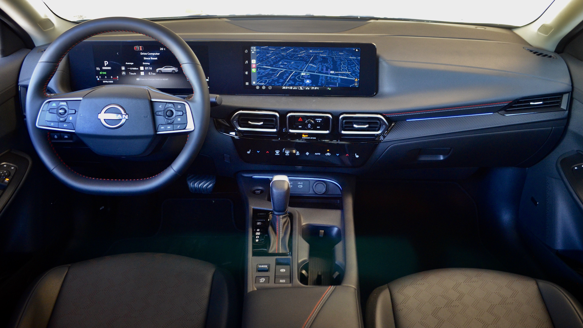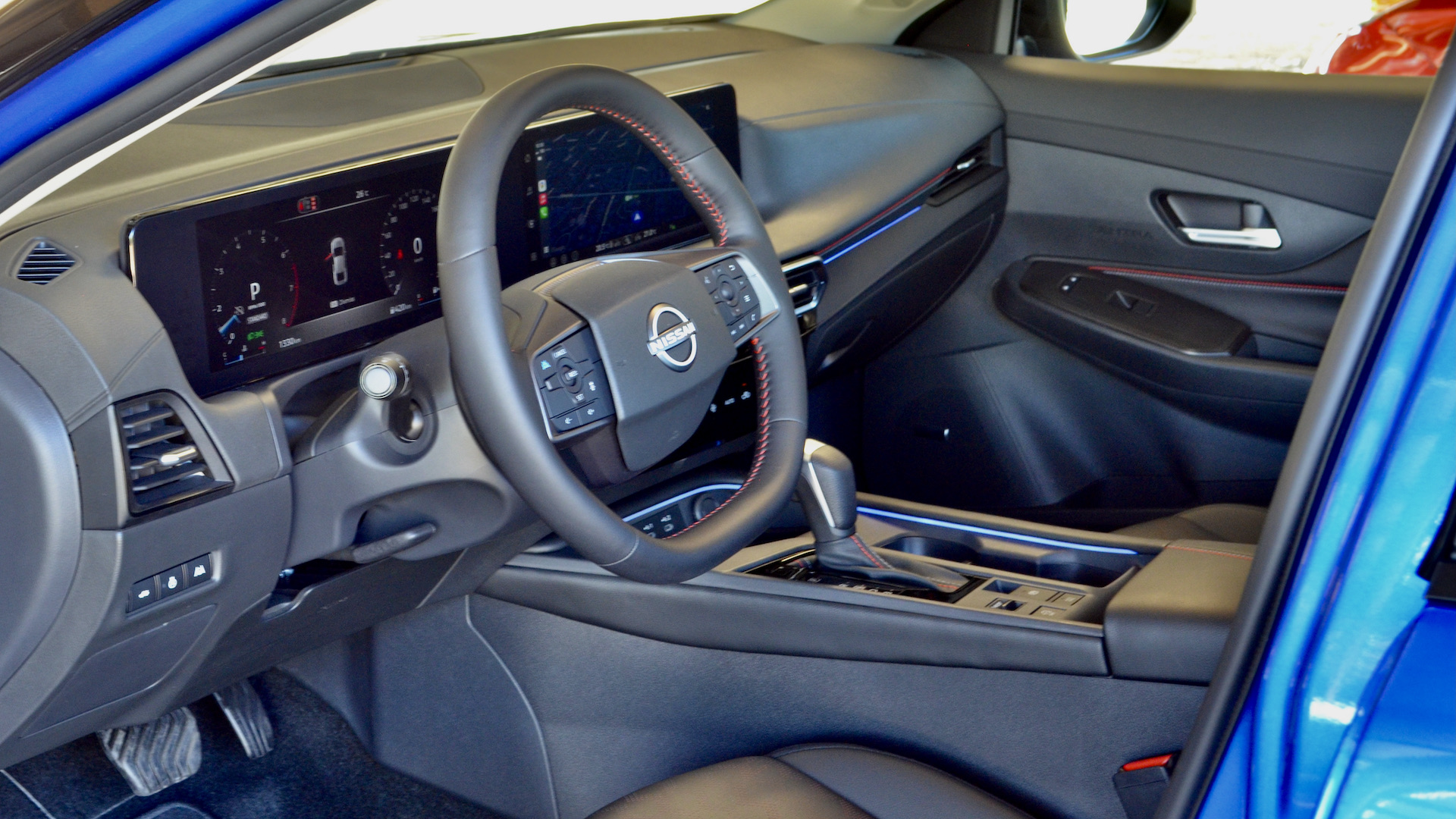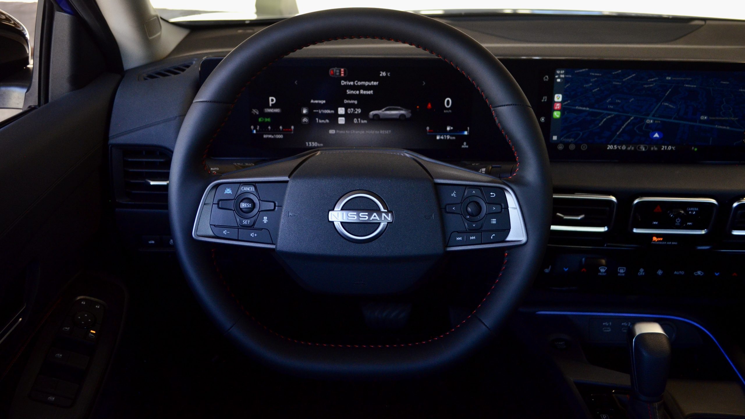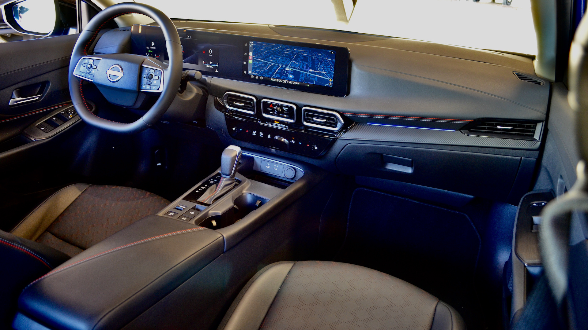 On découvre une toute nouvelle planche de bord. Il s’agit de la nouvelle configuration que l’on voit depuis quelque temps chez Nissan. Terminé la nacelle d’instrumentation. Les SV et SR ont une grande applique noire qui regroupe deux écrans de 12,3 pouces. La version de base S, devra, quant à elle, se contenter de 7 pouces à l’instrumentation.