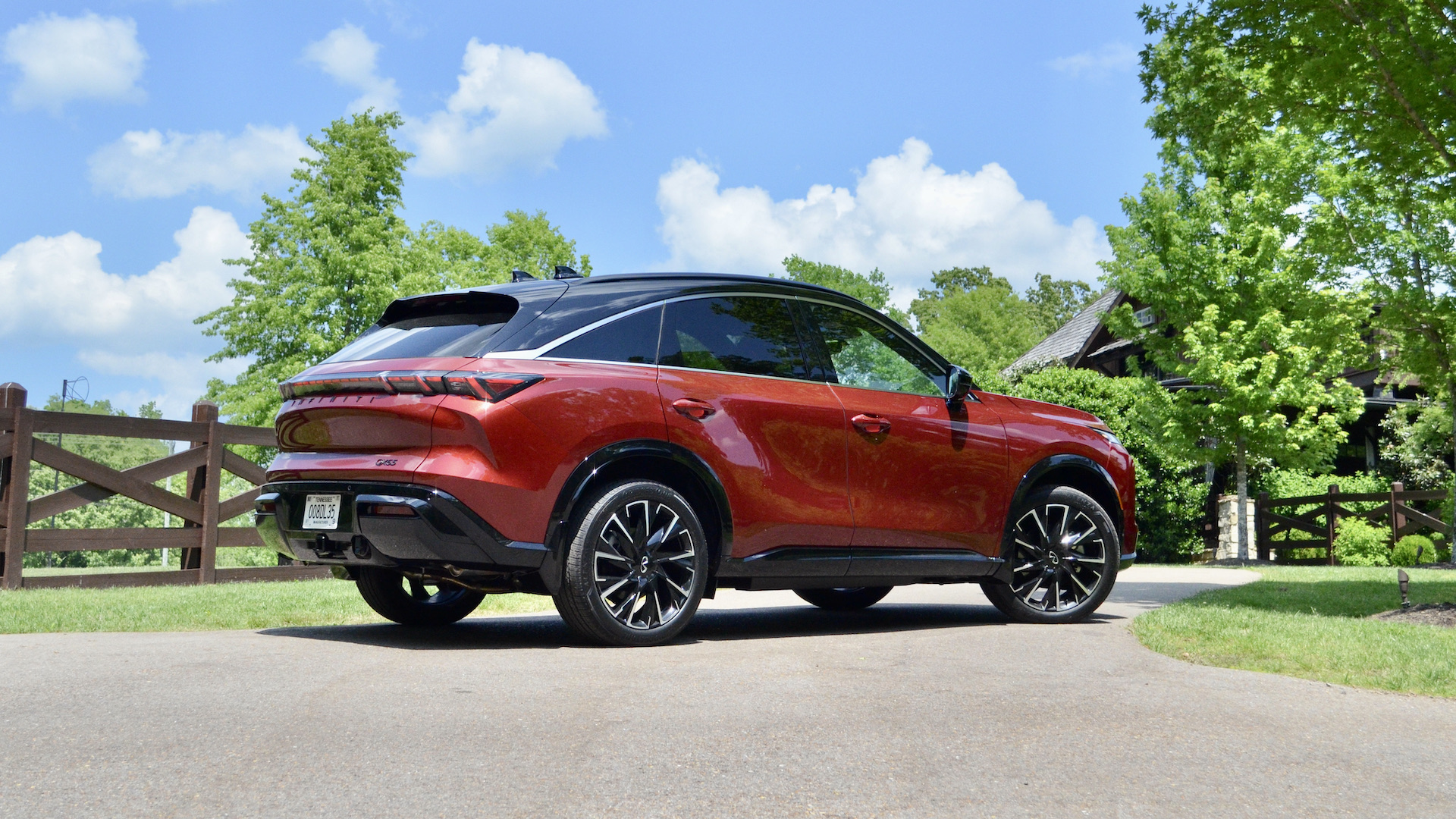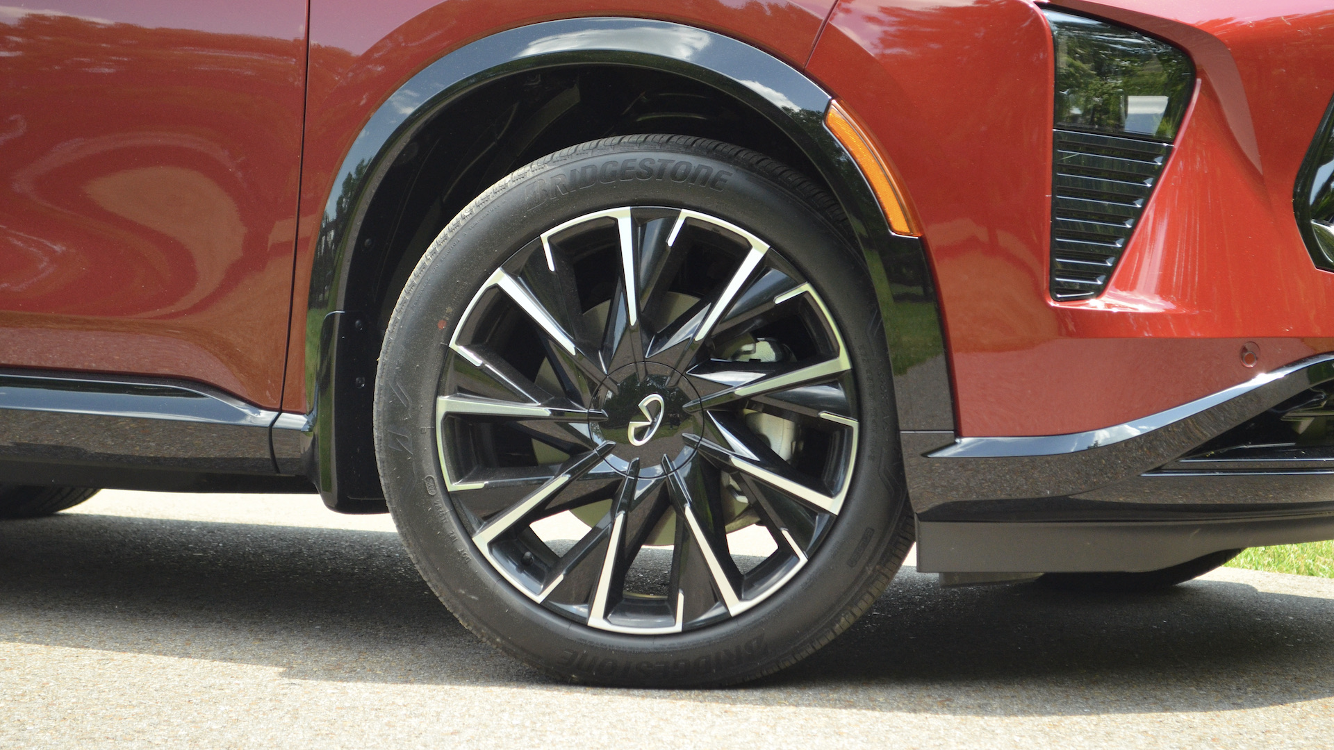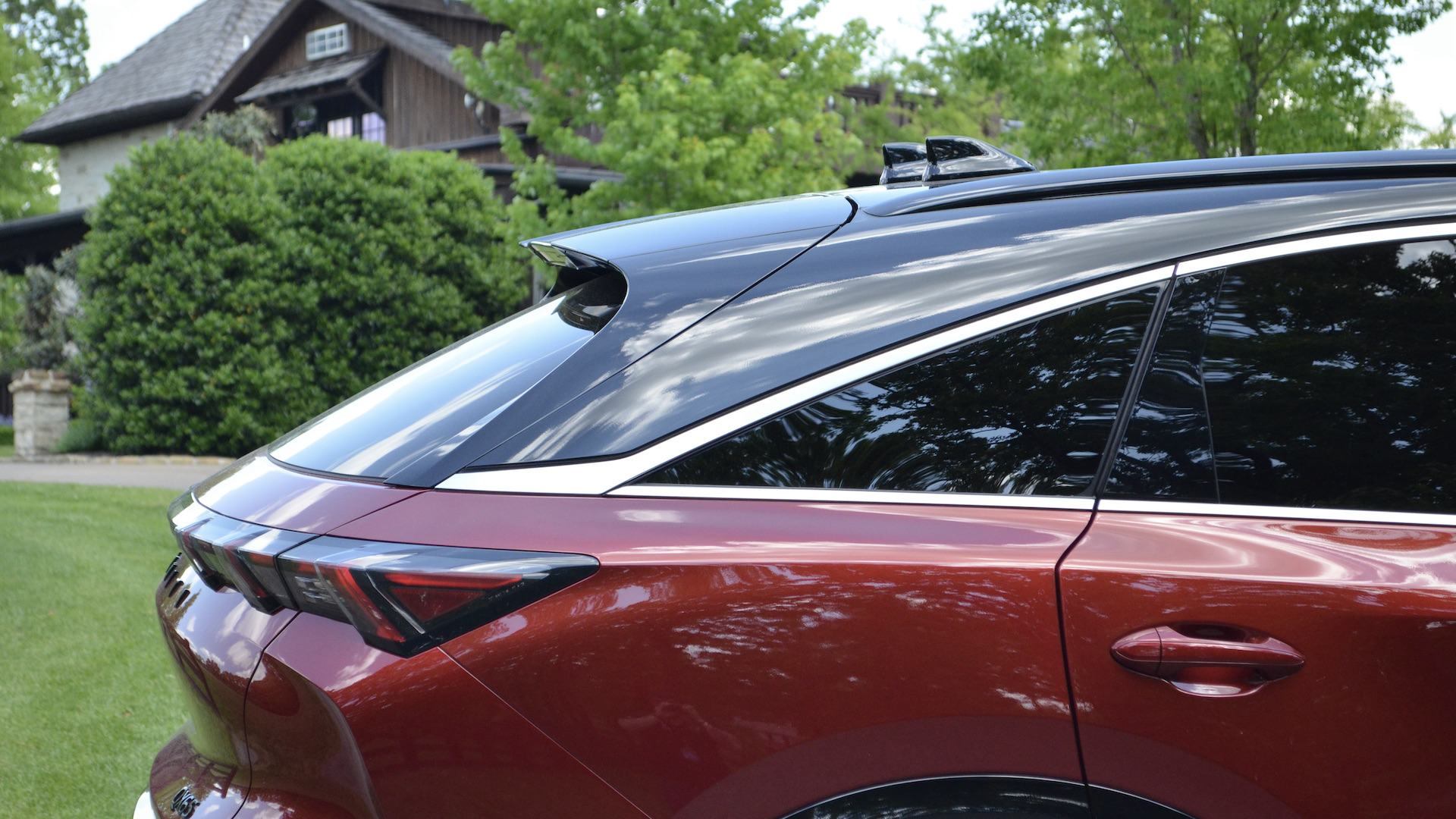C’est de profil que le QX65 affirme le plus sa personnalité. Sa silhouette de « coupé » se traduit par une ligne de toit plus fuyante et étirée, renforçant son allure dynamique. Sur la version Autograph, un toit noir contrastant accentue cet effet. Le cadrage de la fenestration est décoré par un fin jonc en chrome satiné sur la version à l’essai. La finition de cette moulure varie selon les versions. Côté roues, les variantes Luxe et Sport reposent sur des jantes de 20 pouces, alors que l’Autograph se distingue avec des roues à deux tons de 21 pouces.