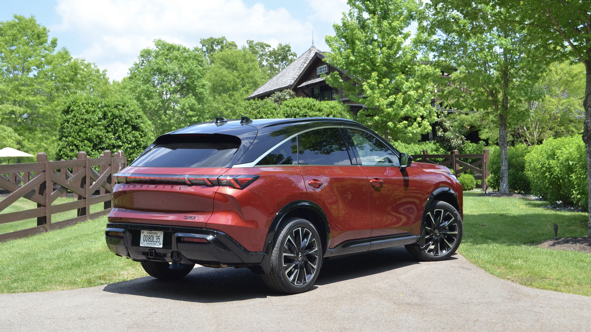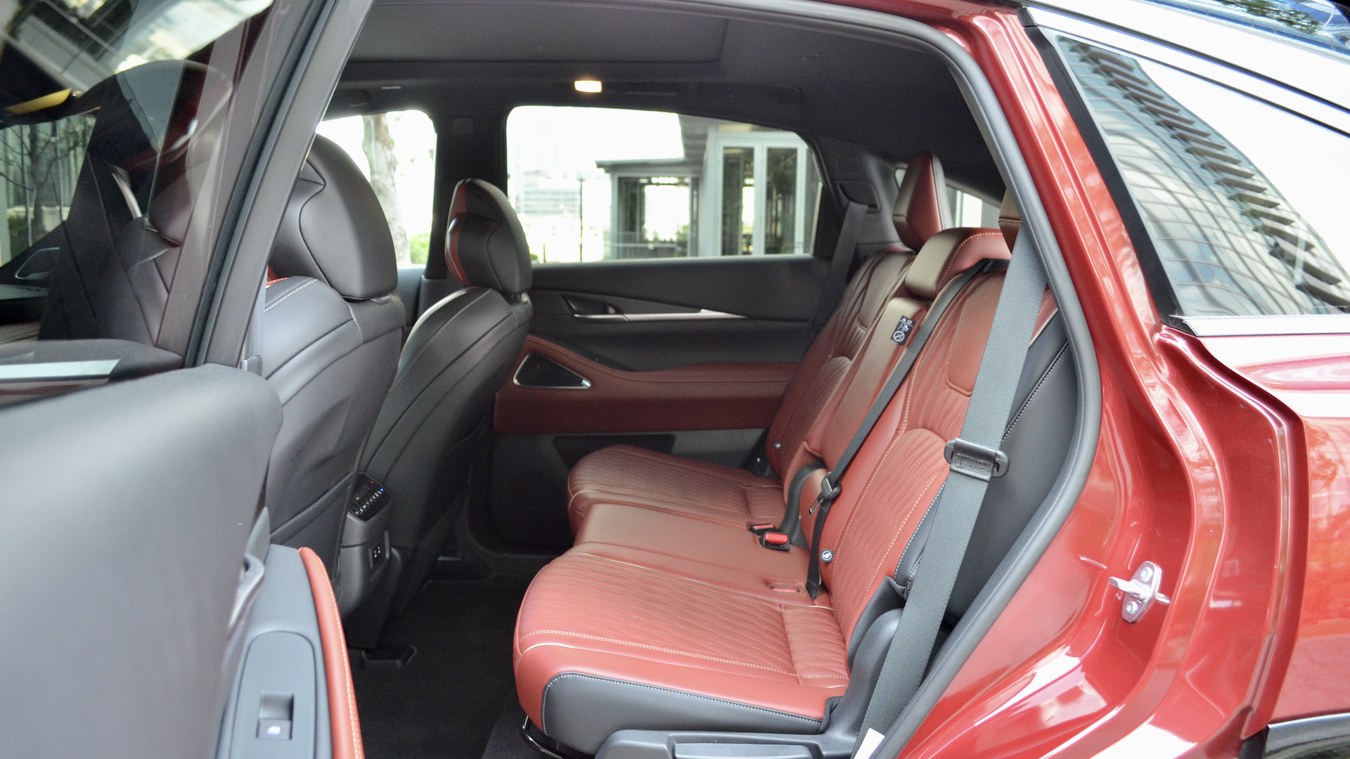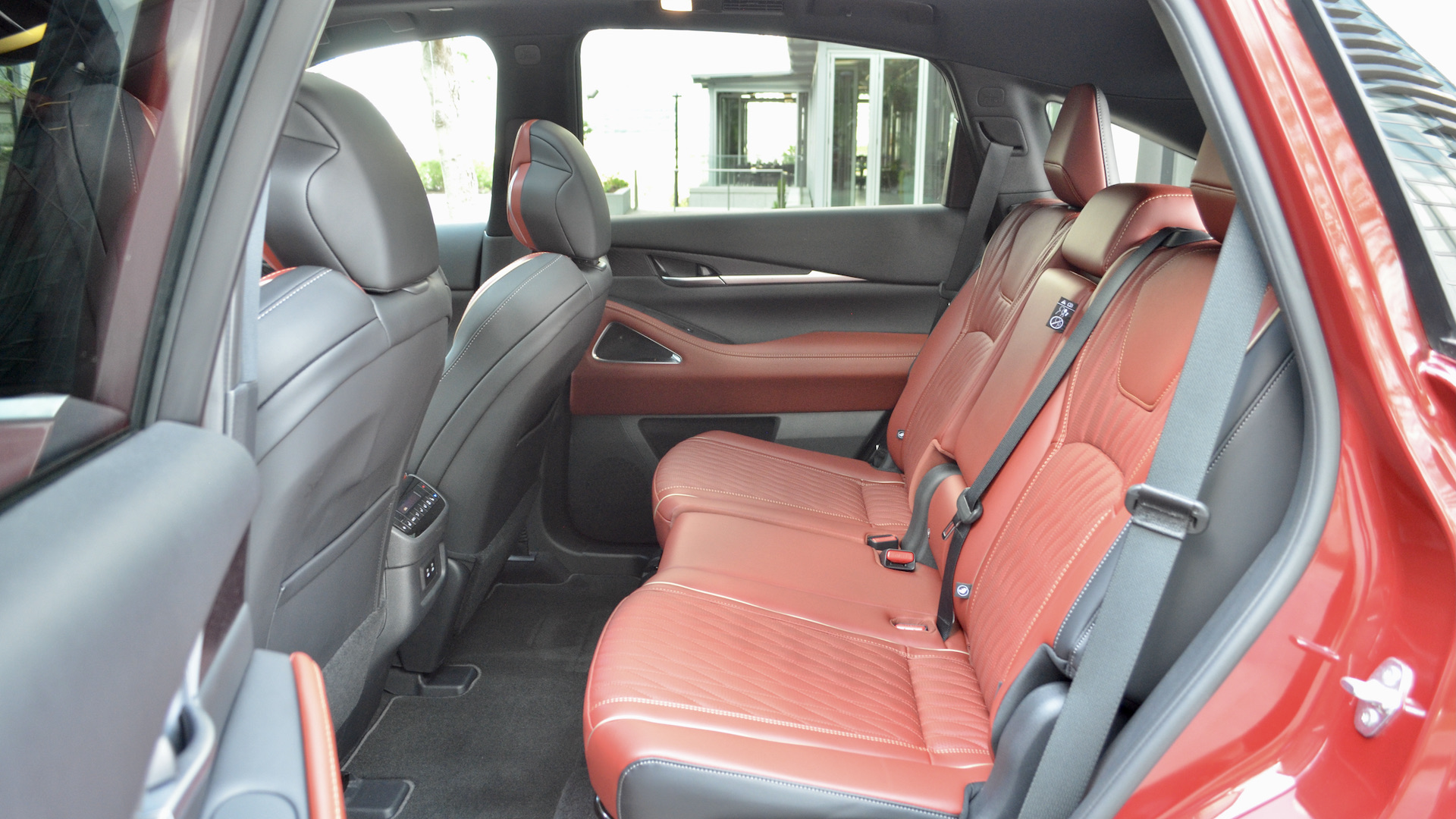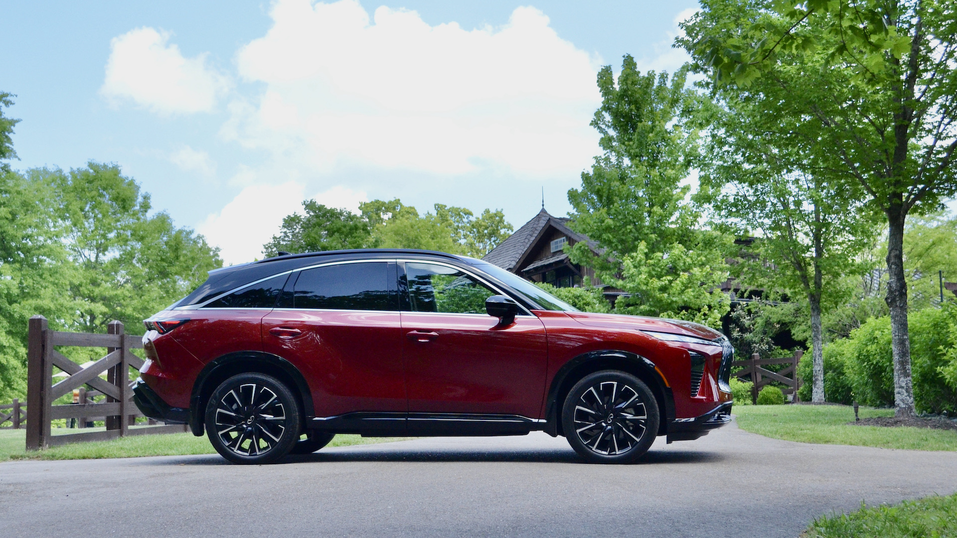 C’est de profil que le QX65 affirme le plus sa personnalité. Sa silhouette de « coupé » se traduit par une ligne de toit plus fuyante et étirée, renforçant son allure dynamique. Sur la version Autograph, un toit noir contrastant accentue cet effet. Le cadrage de la fenestration est décoré par un fin jonc en chrome satiné sur la version à l’essai. La finition de cette moulure varie selon les versions. Côté roues, les variantes Luxe et Sport reposent sur des jantes de 20 pouces, alors que l’Autograph se distingue avec des roues à deux tons de 21 pouces.