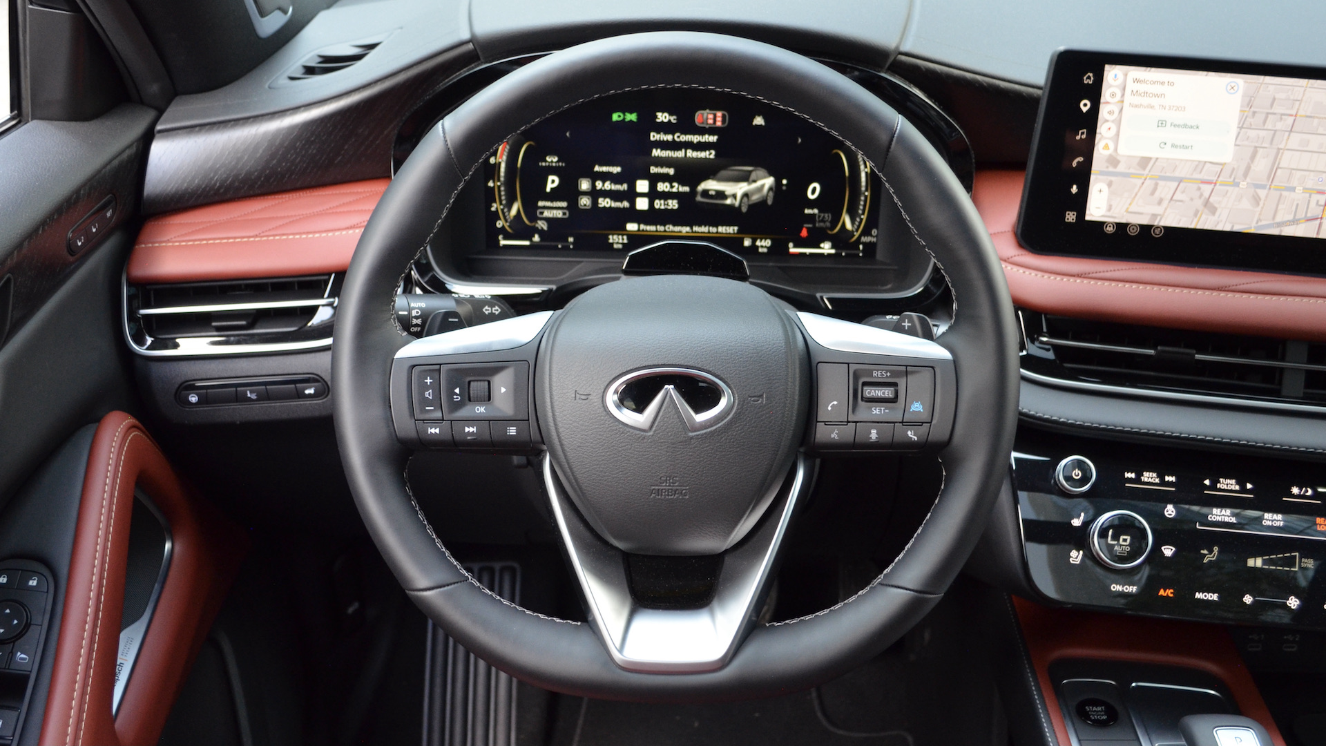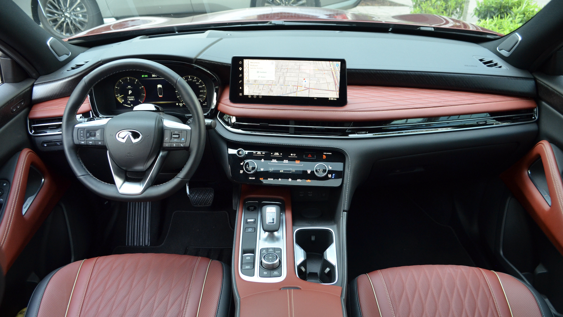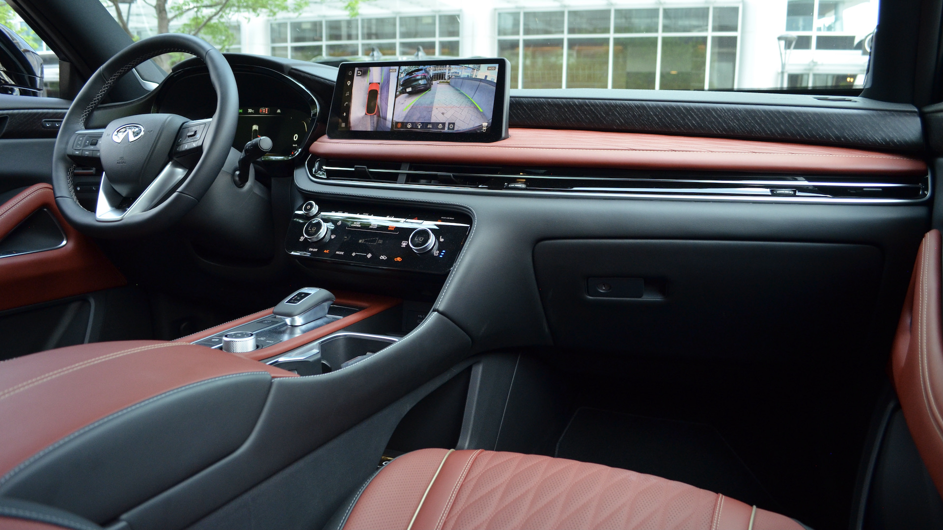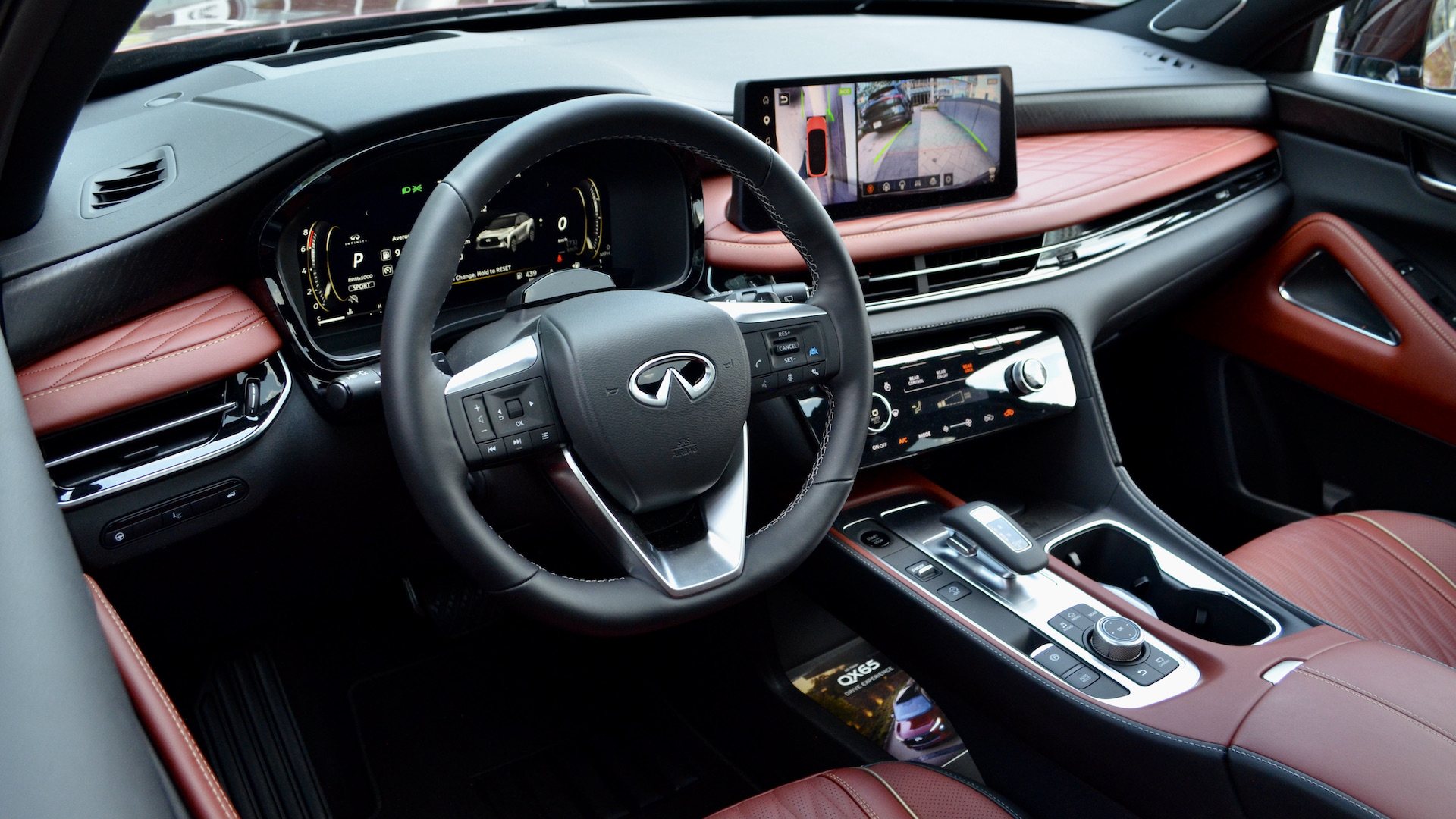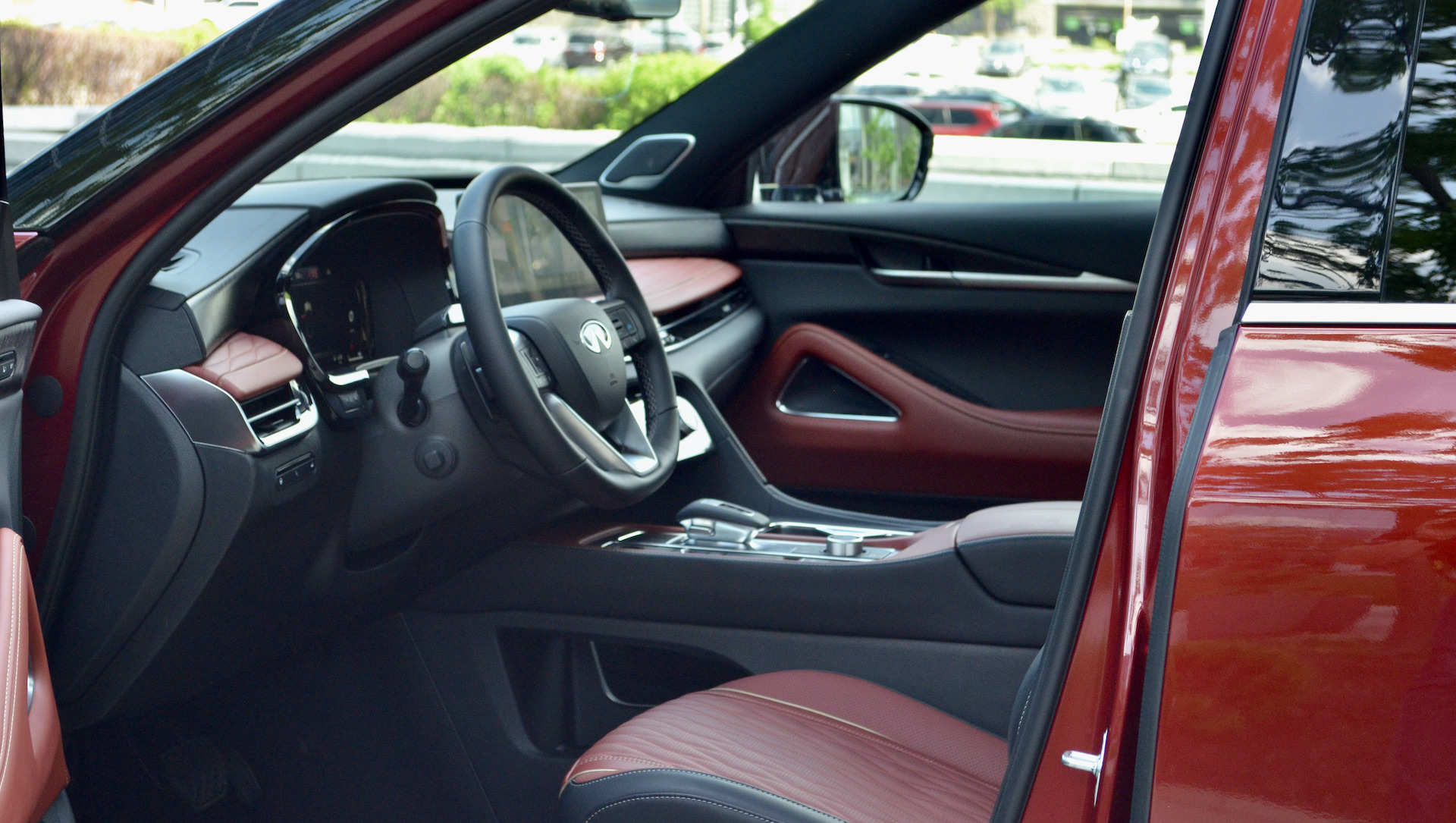 À bord, le QX65 reprend l’environnement du QX60. Dans une optique d’économie, cela n’a rien d’étonnant et c’est loin d’être un défaut. Le tout est à jour avec une présentation qui a bénéficié d’une mise à jour en 2025. Encore une fois, le style est à l’avant-plan, il s’agit certainement de l’une des belles planches de bord de l’industrie.