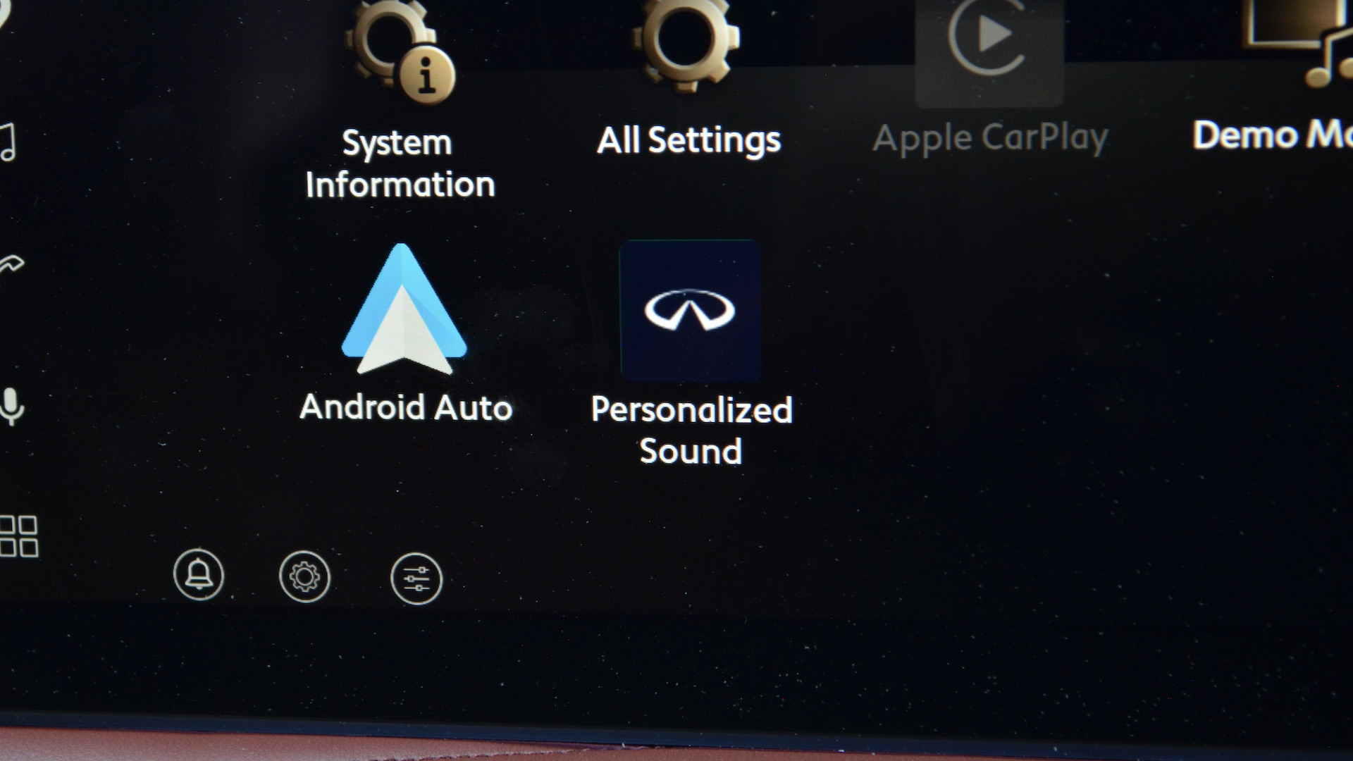 Infiniti propose l’application « Personalized Sound ». Infiniti le définit comme suit : « Au-delà des réglages traditionnels de basses, d’aigus, de balance avant-arrière et gauche-droite, la fonction utilise les résultats du test pour ajuster avec précision un égaliseur à 10 bandes couvrant des fréquences de 50 hertz à 1 200 hertz. » De ce fait, chaque utilisateur obtient un son optimisé pour son oreille. Si c’est très agréable pour le maestro derrière le volant, les autres occupants auront une expérience différente.