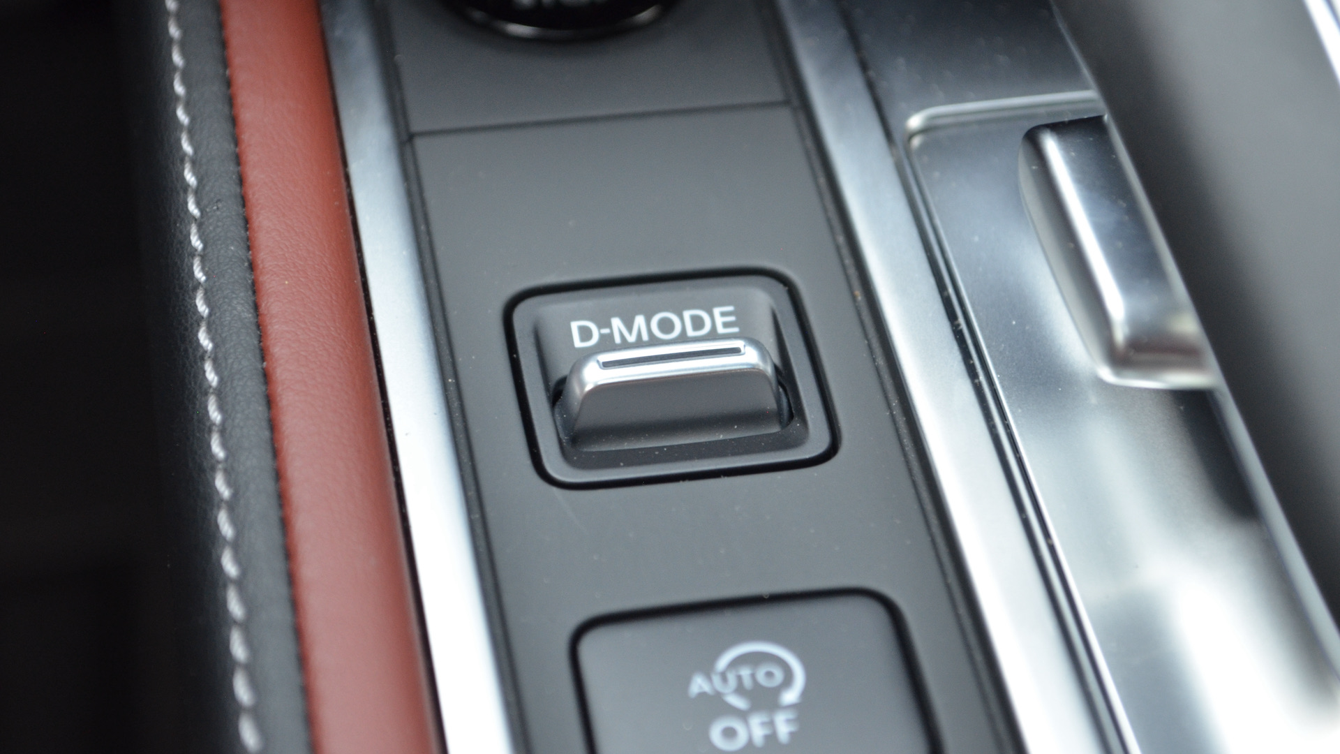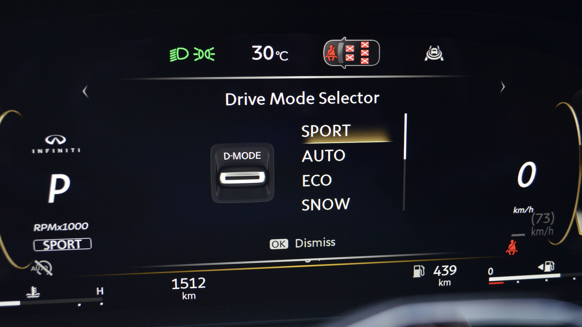 On peut croire que le mode Sport sera le plus agréable, mais ce n’est pas le cas. La transmission maintient le régime du moteur inutilement trop haut aux environs de 3 500 tr/min. De ce fait, c’est bruyant, malgré la présence d’une suppression active du bruit, il se fait entendre. En parallèle, Infiniti ajoute un optimiseur de son qui veut imiter le son d’un V6. C’est loin d’être convaincant, ça m’a même donné un petit sourire moqueur à son écoute. Toujours en mode Sport, la transmission perd de sa fluidité et devient plus dynamique, que je qualifierais de plus saccadée.