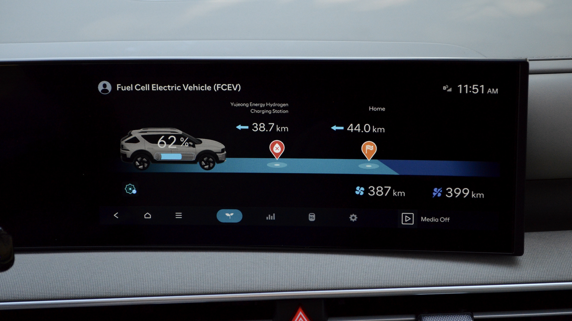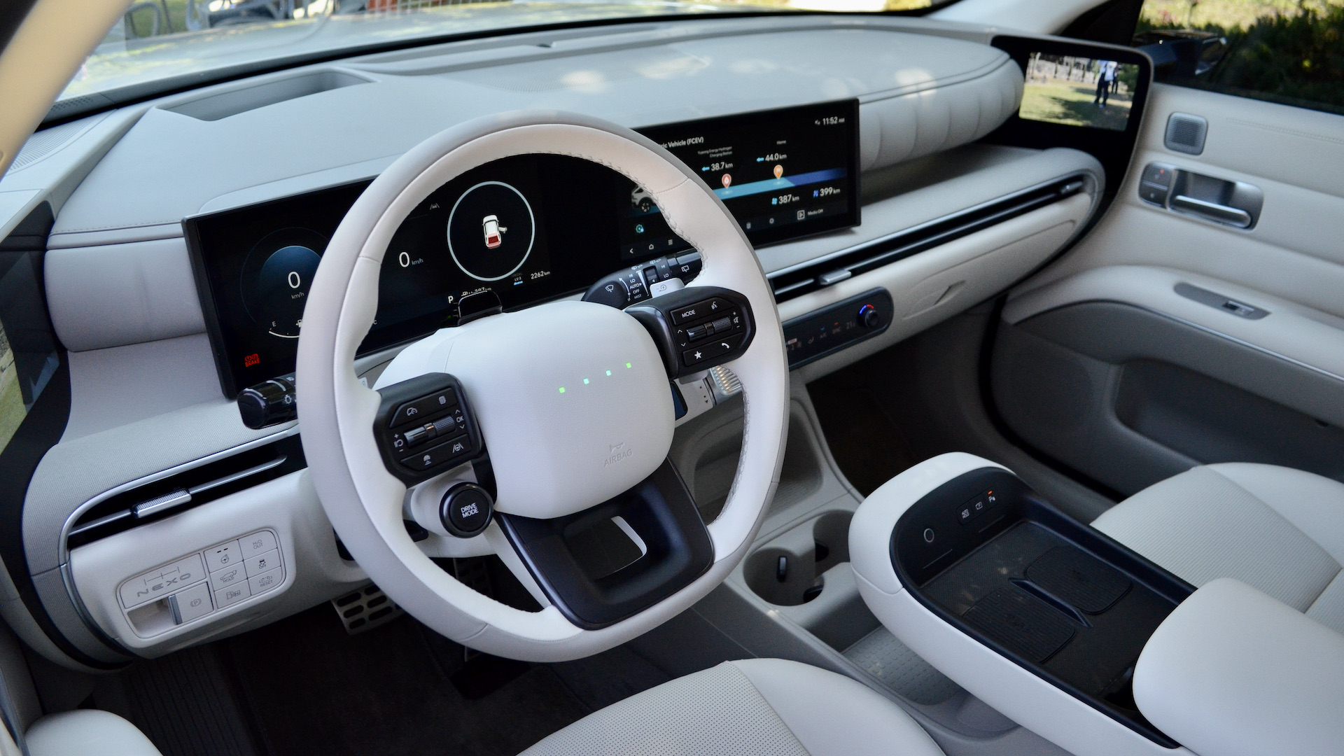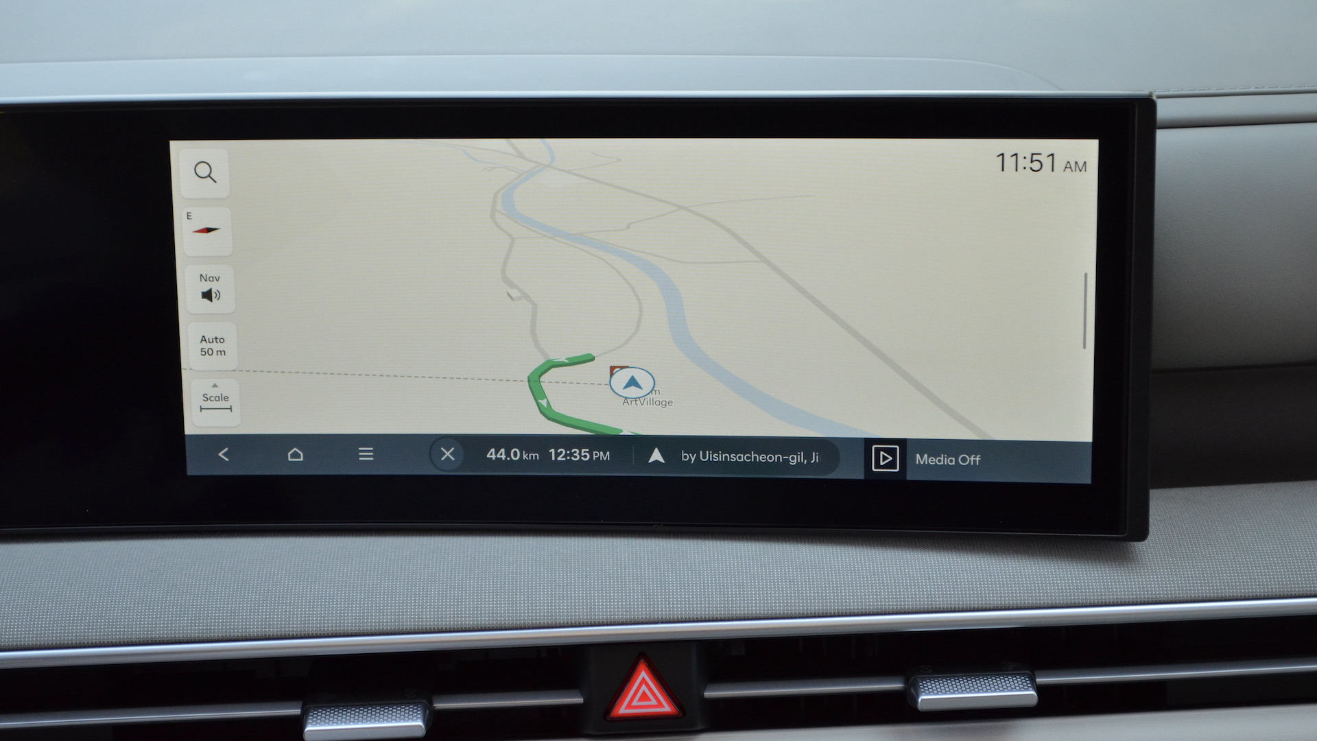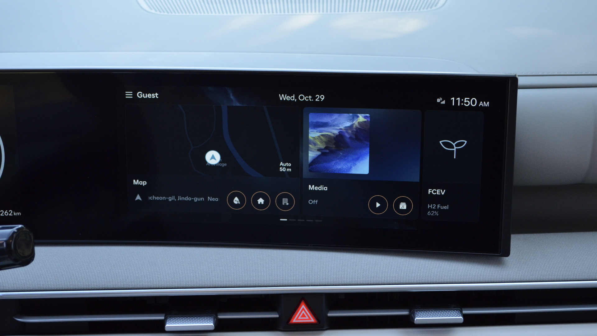 On retrouve une fois de plus l’aménagement Connected Car Navigation Cockpit constitué de deux écrans de 12,3 pouces. C’est une approche conventionnelle pour Hyundai, mais dont l’ergonomie est prouvée. Encore une fois, on peut critiquer le manque de possibilité pour l’affichage, surtout que l’on est dans un véhicule avec une motorisation singulière, un peu d’excentricité serait appréciée.