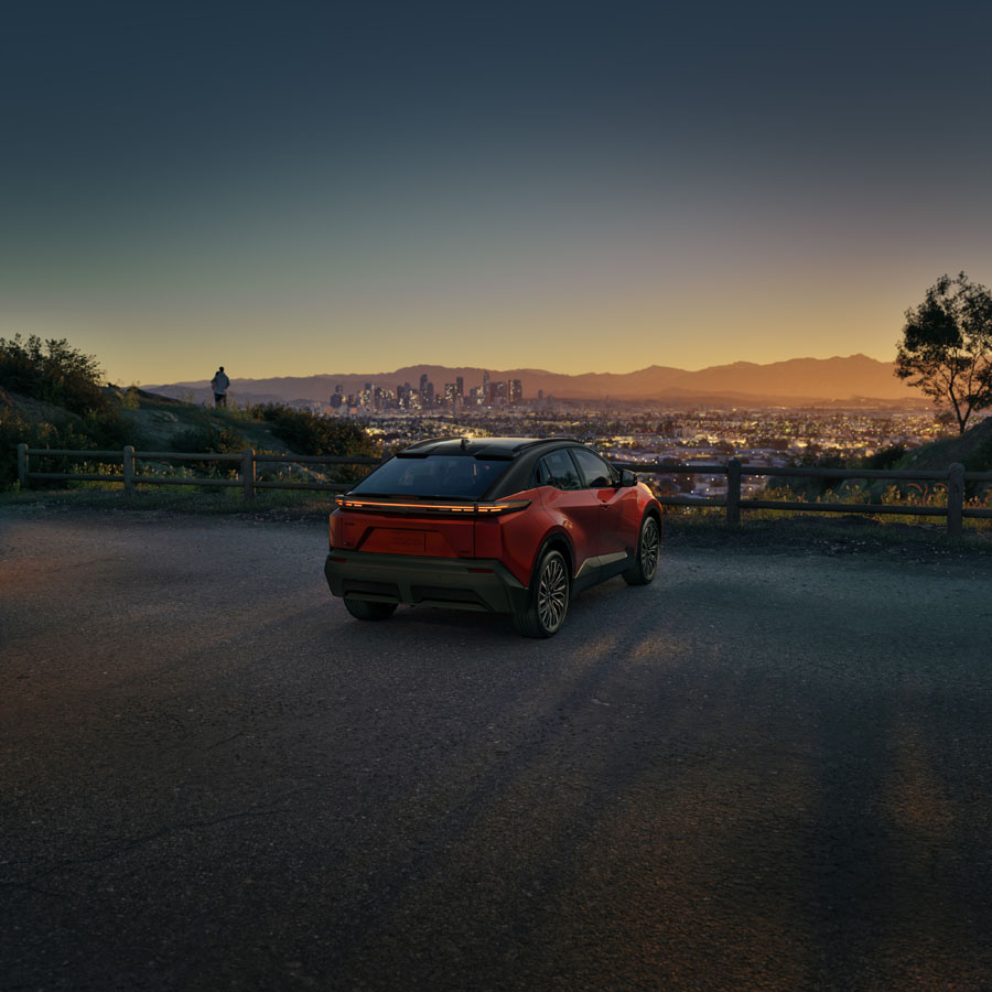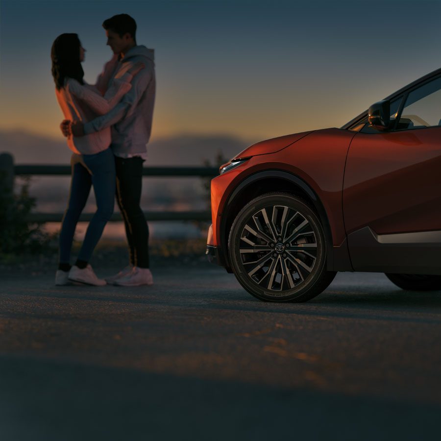À l’avant, les phares DEL effilés et la signature visuelle moderne alignent le C-HR avec le langage stylistique actuel des véhicules électriques Toyota. Les surfaces lisses et les éléments aérodynamiques ne sont pas seulement esthétiques : ils contribuent aussi à l’efficacité énergétique et à l’autonomie.