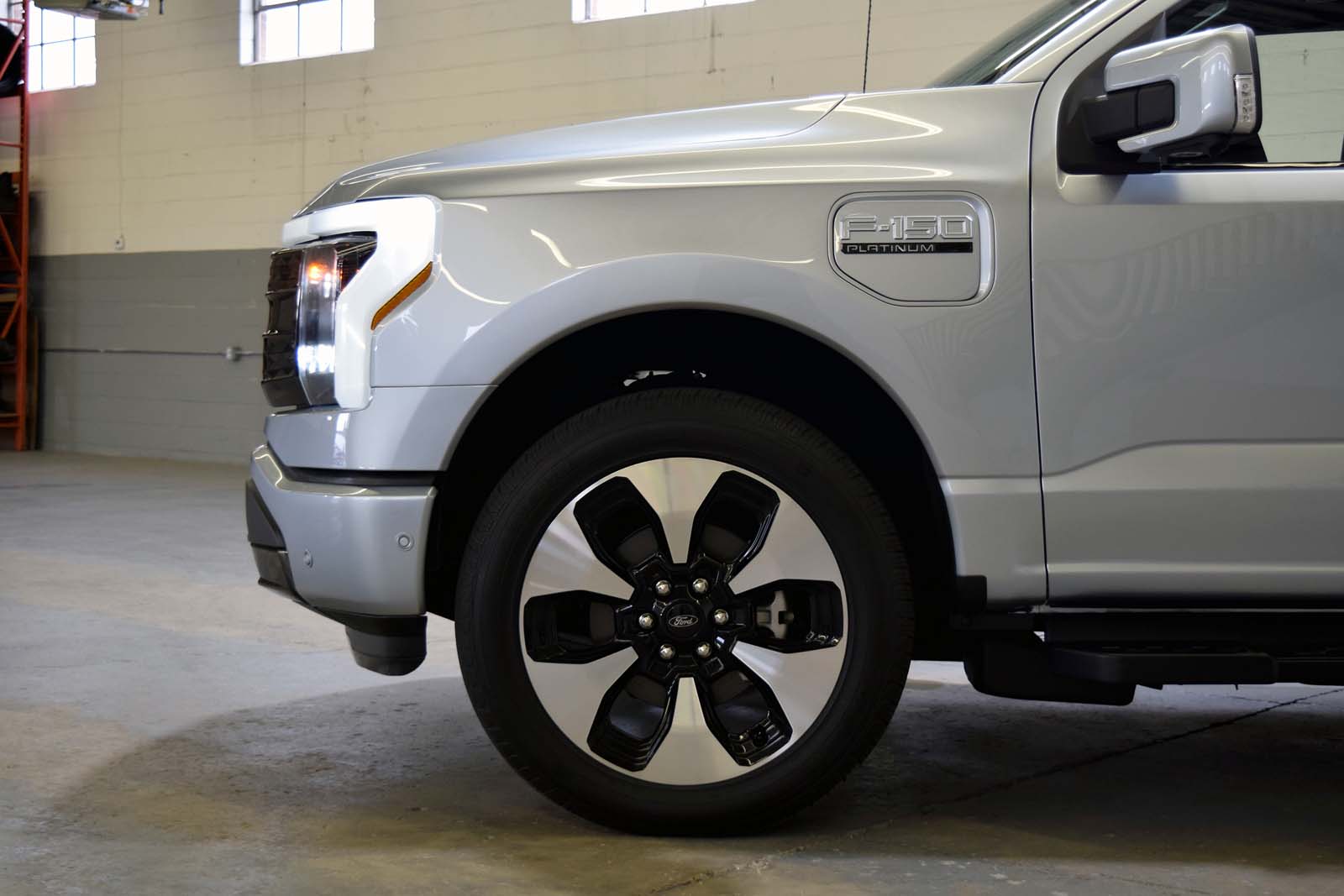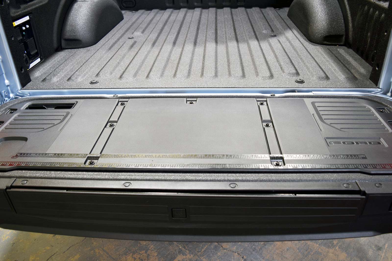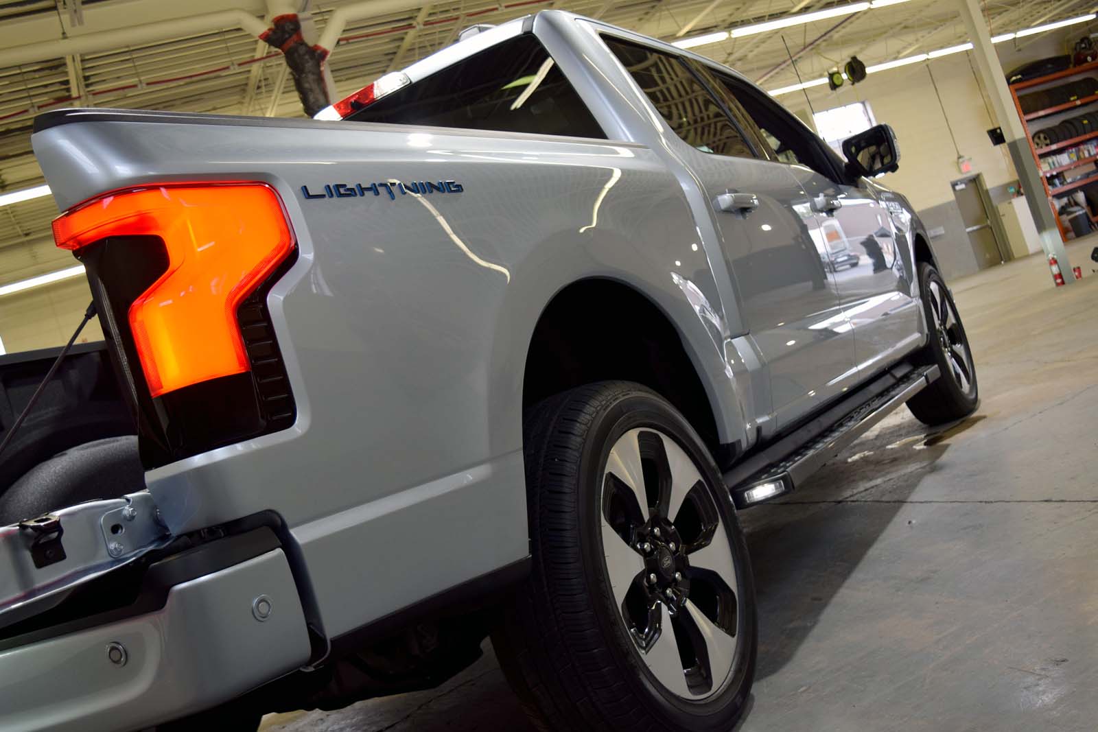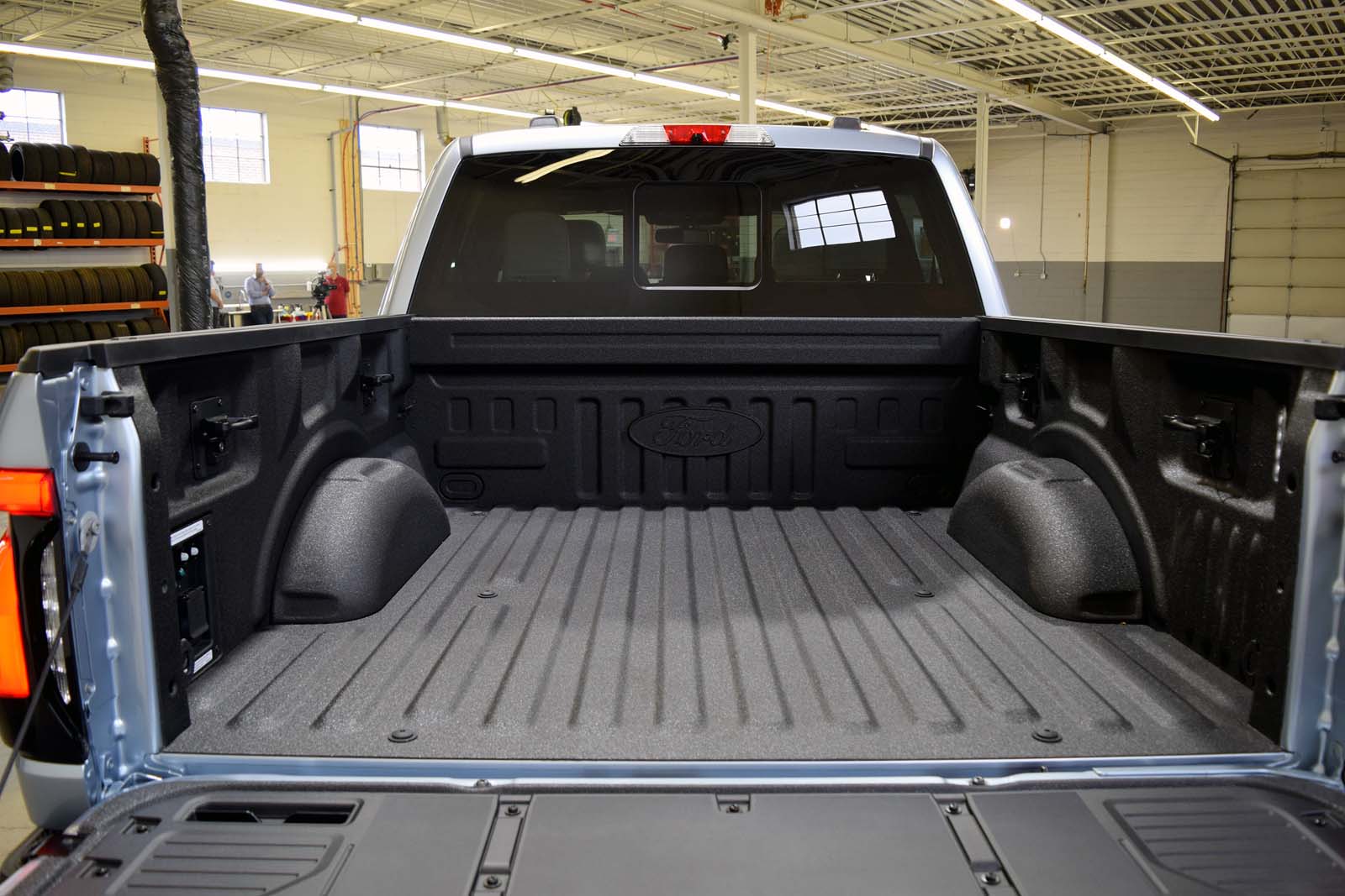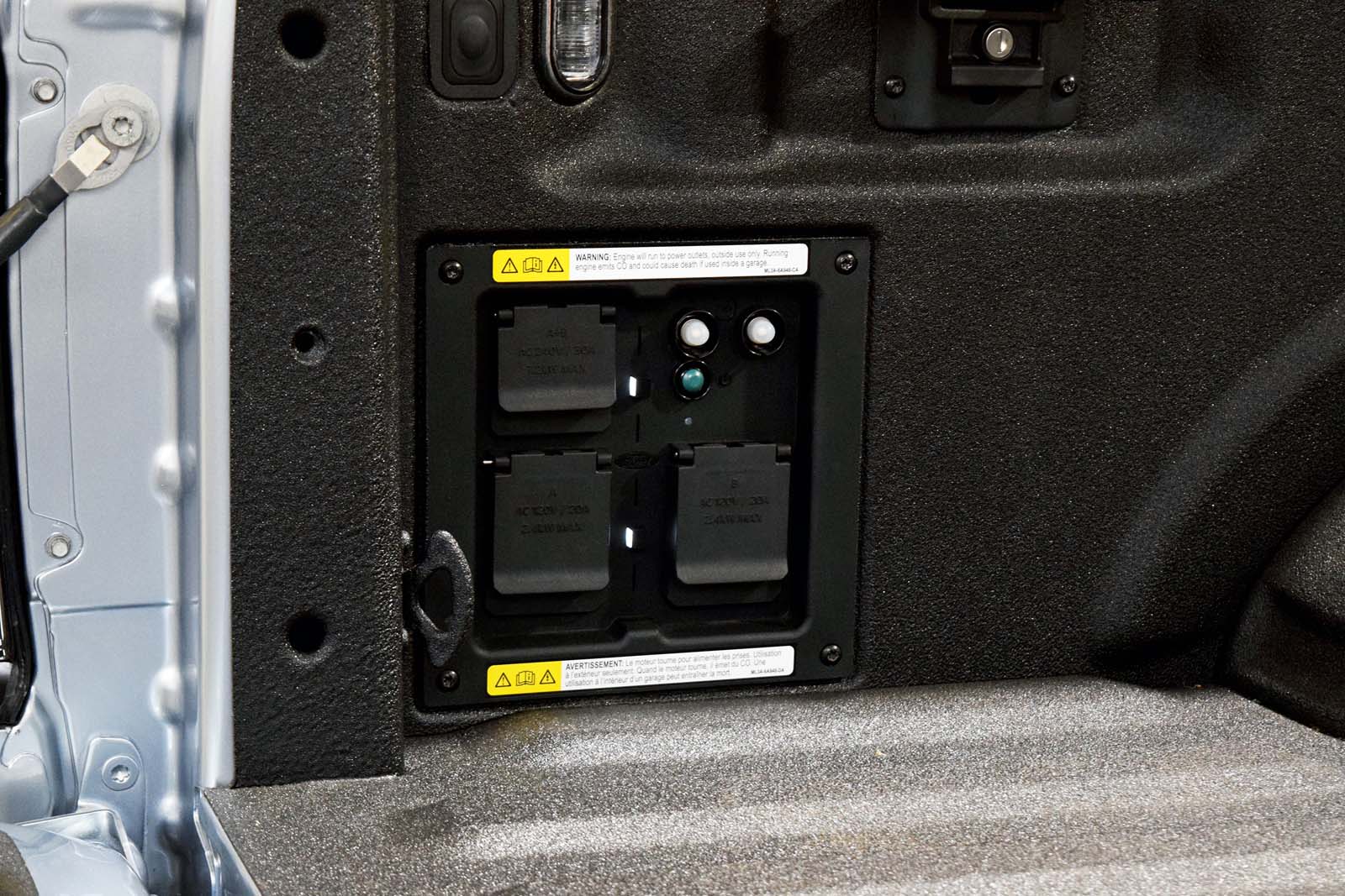 Au-delà du coffre utile, le véhicule arbore un port de charge du côté conducteur et une plaque similaire du côté passager pour la symétrie. Sur le côté du lit se trouve un badge 3D «Lightning», contrairement aux autres garnitures du F-150 qui présentent un graphique plat.