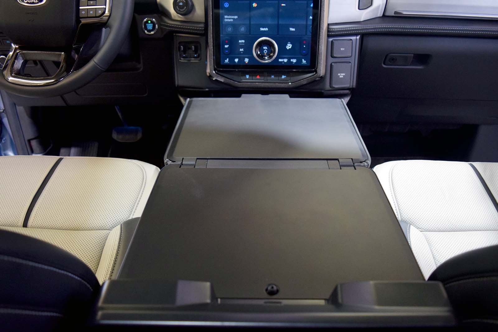 Semblable à la façon dont les F-150 à essence et hybrides ont des astuces de génération d’énergie supplémentaires avec la fonction Pro Power OnBoard, le Lightning a aussi quelques fonctionnalités supplémentaires. Pour commencer, le véhicule offre à la fois des fonctionnalités Pro Power Onboard de 2,4 kW et 9,6 kW, permettant aux utilisateurs de profiter de jusqu’à 11 prises présentes dans tout le véhicule pour alimenter divers appareils ou outils électriques.