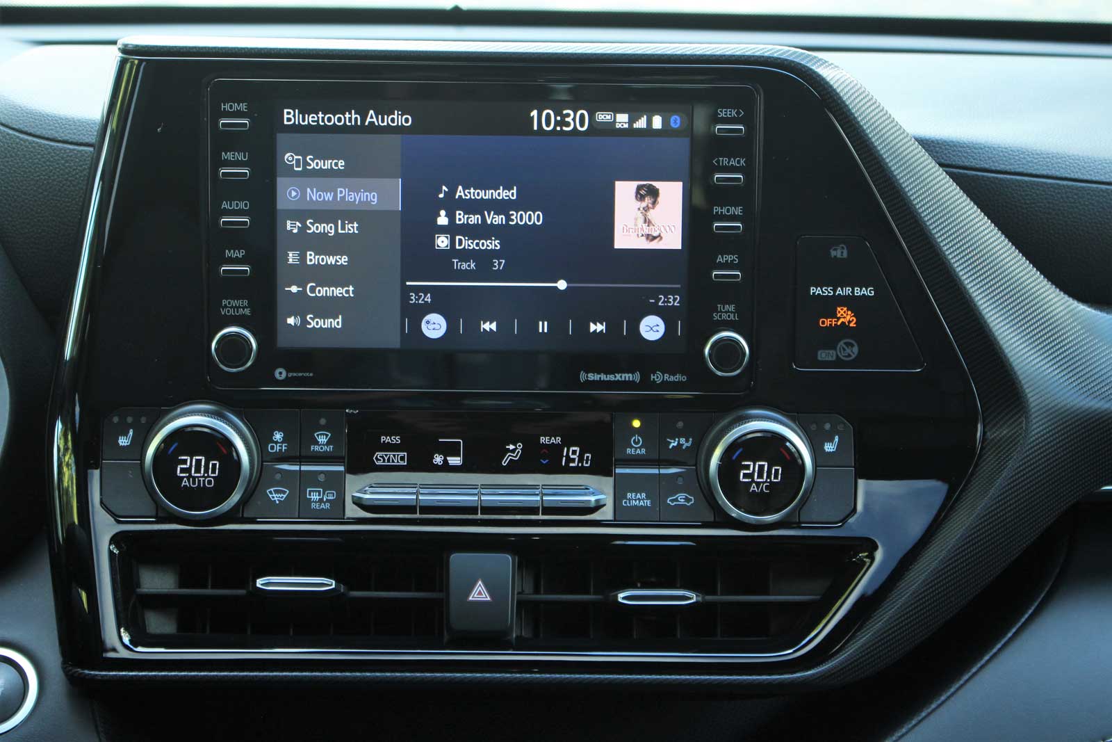 De série, le Toyota Highlander 2021 dispose d’un système multimédia avec écran tactile de huit pouces, de l’intégration Apple CarPlay et Android Auto ainsi que quatre ports USB pour recharger les appareils des passagers. L’interface n’est pas la plus conviviale sur le marché alors que certaines zones de boutons sont trop petites, mais au moins, on retrouve des boutons physiques autour de l’écran pour les fonctionnalités principales. La connectivité par appli mobile, la recharge de téléphones par induction, le système de navigation et la chaîne JBL à 11 haut-parleurs sont livrables.